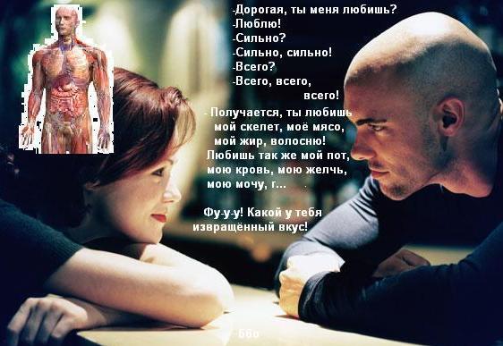 - Дорогая, ты меня любишь? - Люблю! - Сильно? - Сильно, сильно! - Всего? - Всего, всего, всего! - Получается, ты любишь мой скелет, моё мясо, мой жир, волосню. Любишь так же мой пот, мою желчь, мою мочу, г… Фу-у-у-у! Какой у тебя извращённый вкус! Прикрепленные файлы: