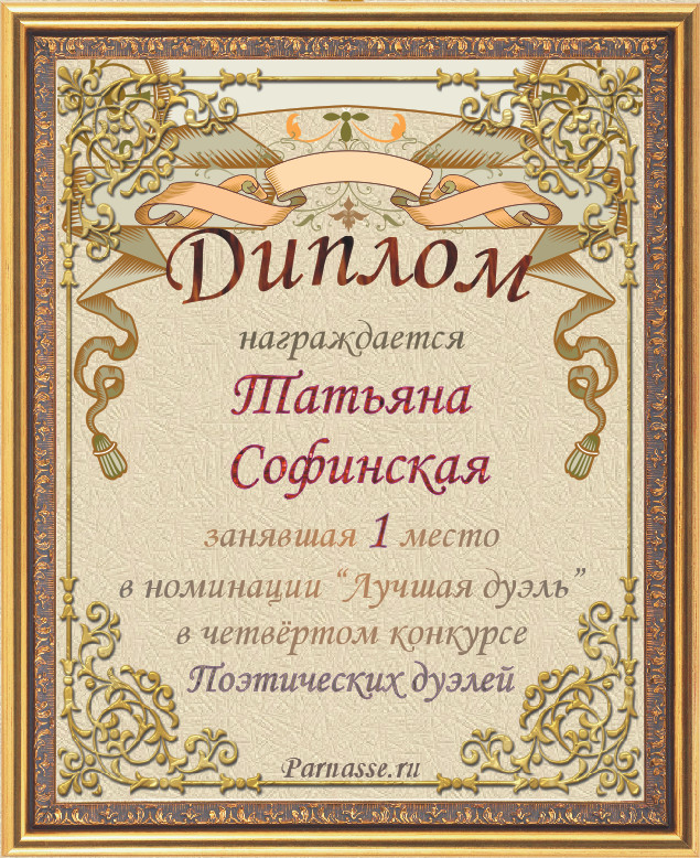 Диплом за победу в номинации "Лучшая дуэль" в четвёртом конкурсе поэтических дуэлей