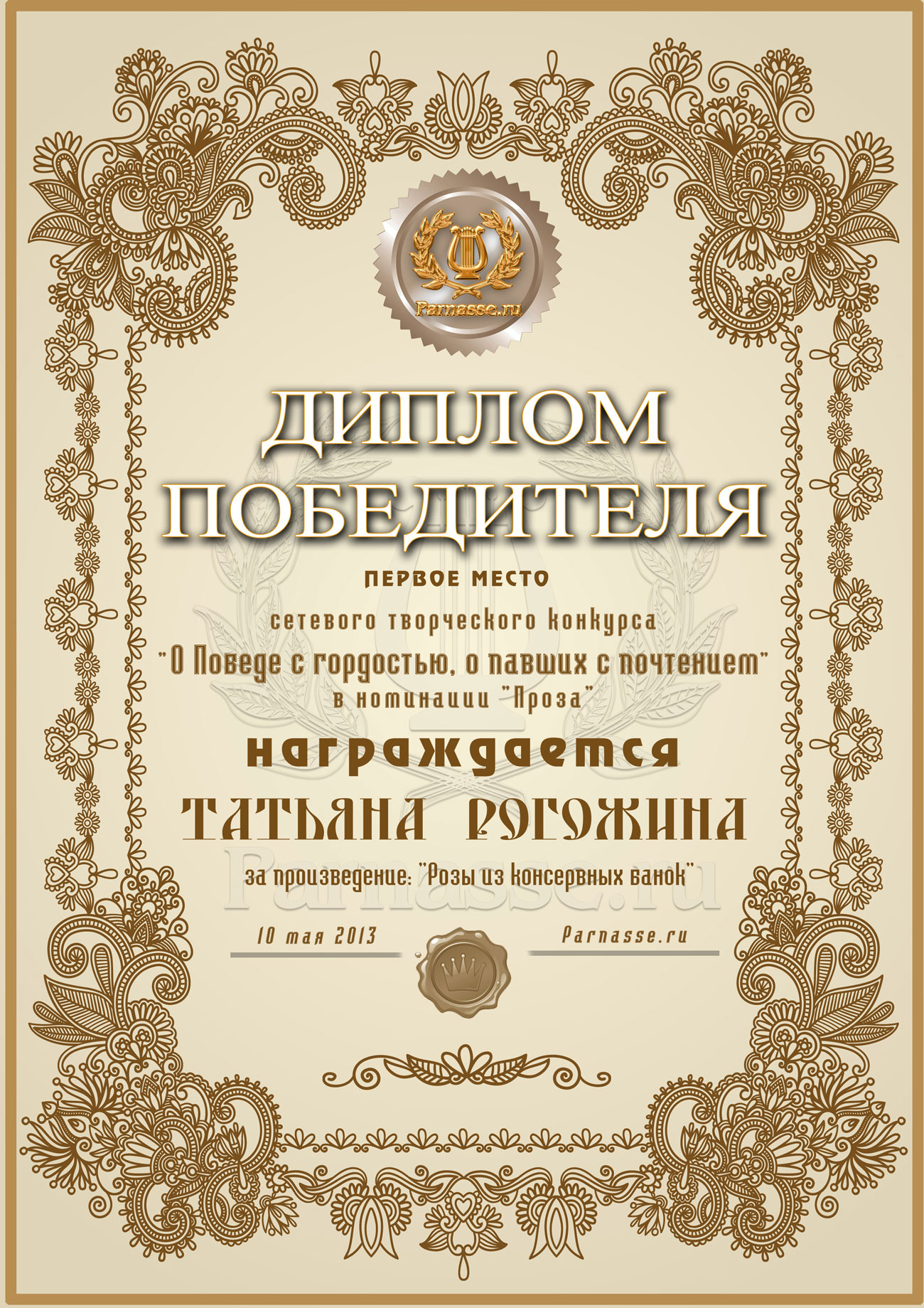 Первое место в музыкально-литературном конкурсе «О Победе с гордостью, о павших – с почтением!» Судейское голосование. Номинация в прозе «Синий платочек»! Произведение «Розы из консервных банок»! Поздравляем с красивой победой!