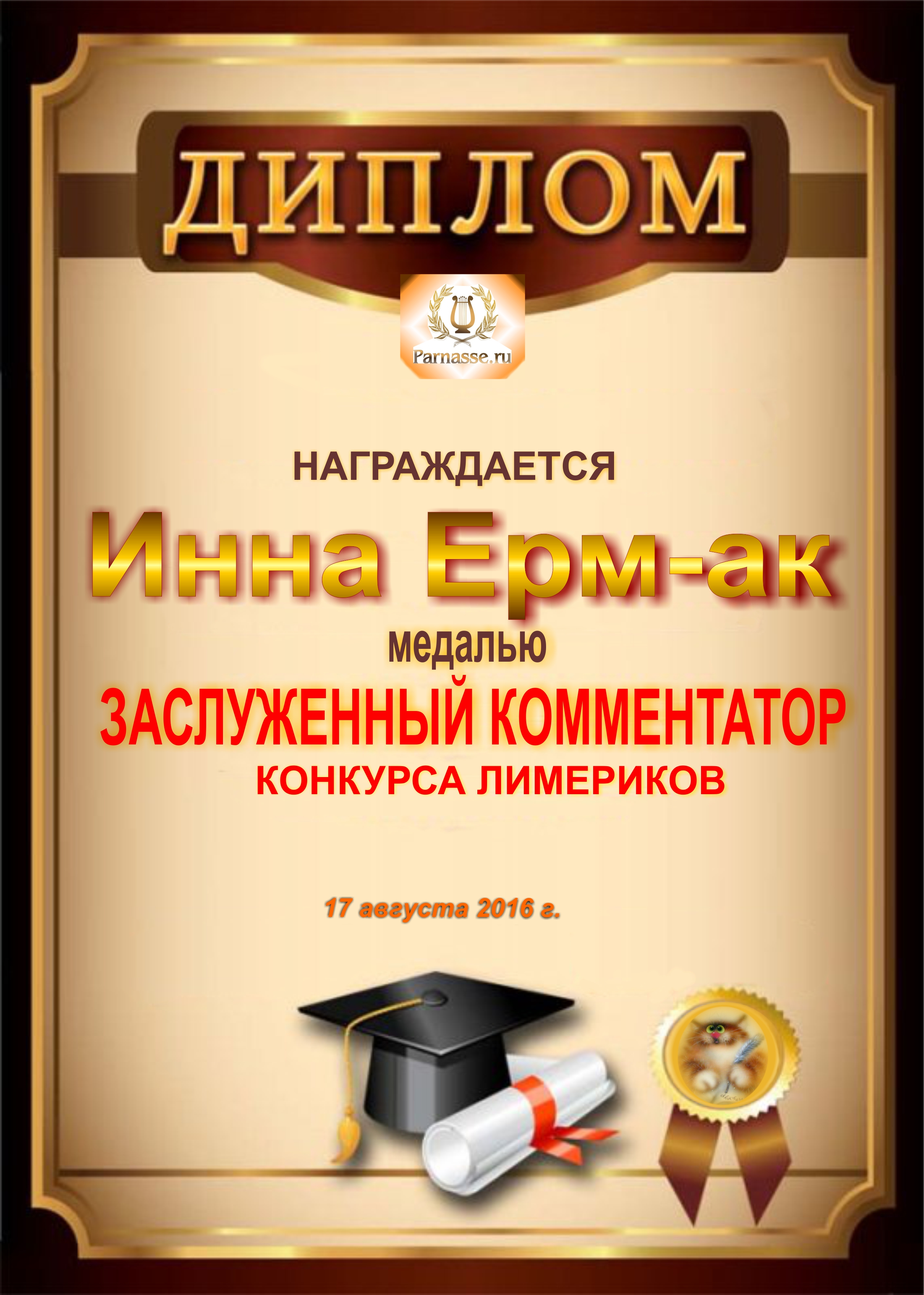 Диплом "Заслуженный комментатор конкурса лимериков" (17.08.2016 г.)