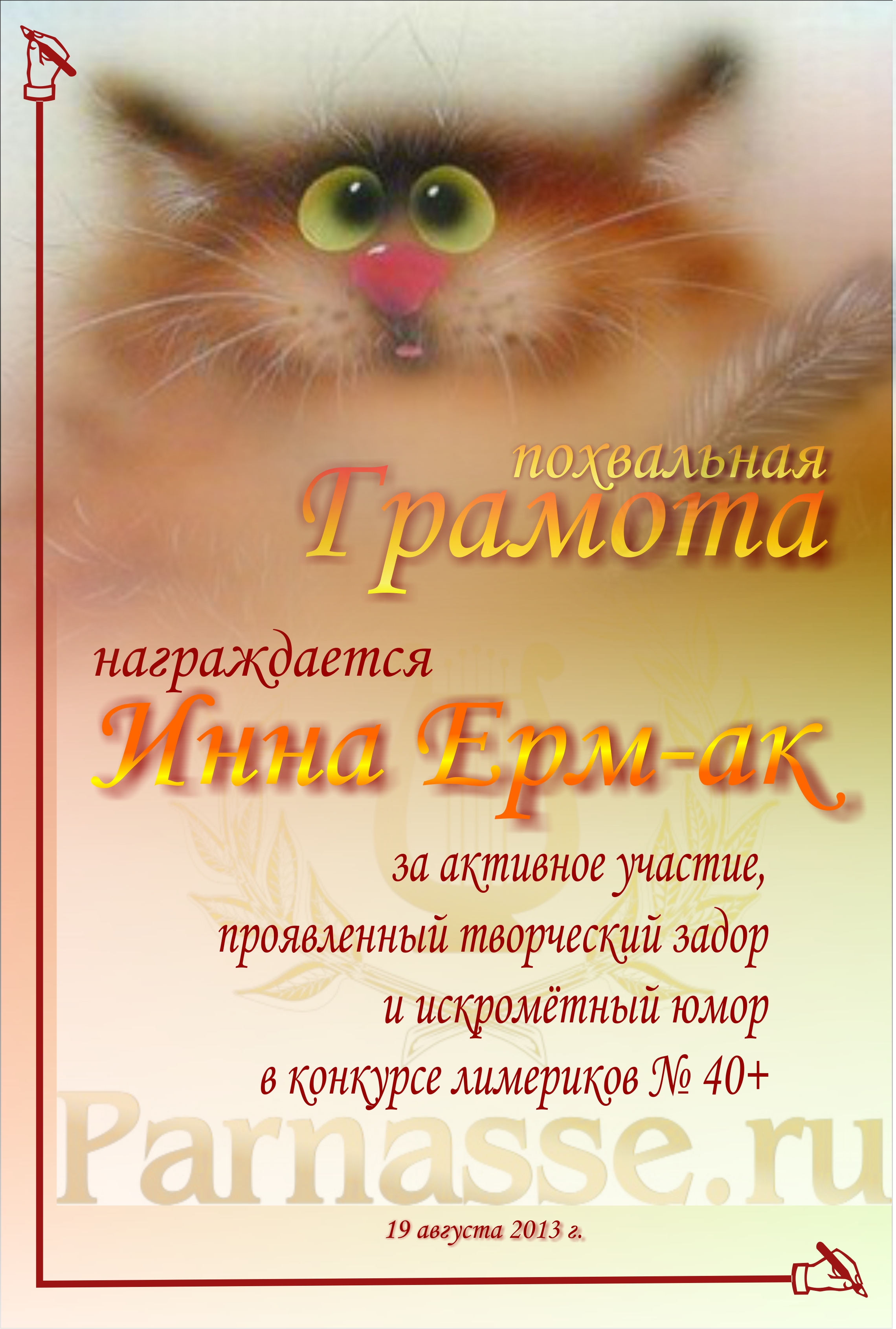 Похвальная грамота за 4 место в конкурсе лимериков № 40+ (19.08.2013 г.)
