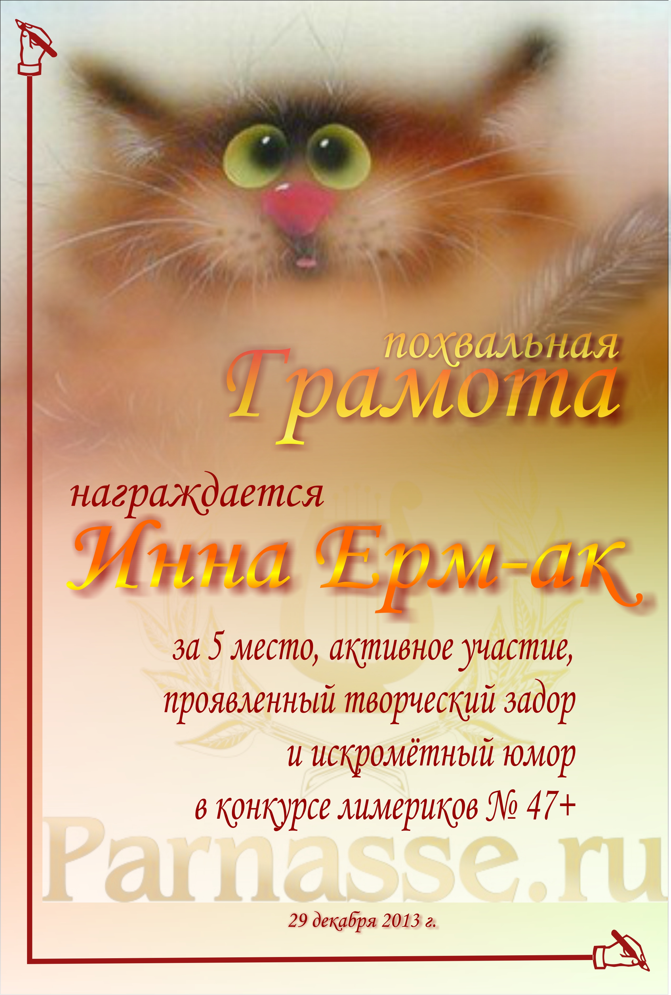 Похвальная грамота за 5 место и активное участие в конкурсе лимериков № 47+ (29.12.2013 г.)