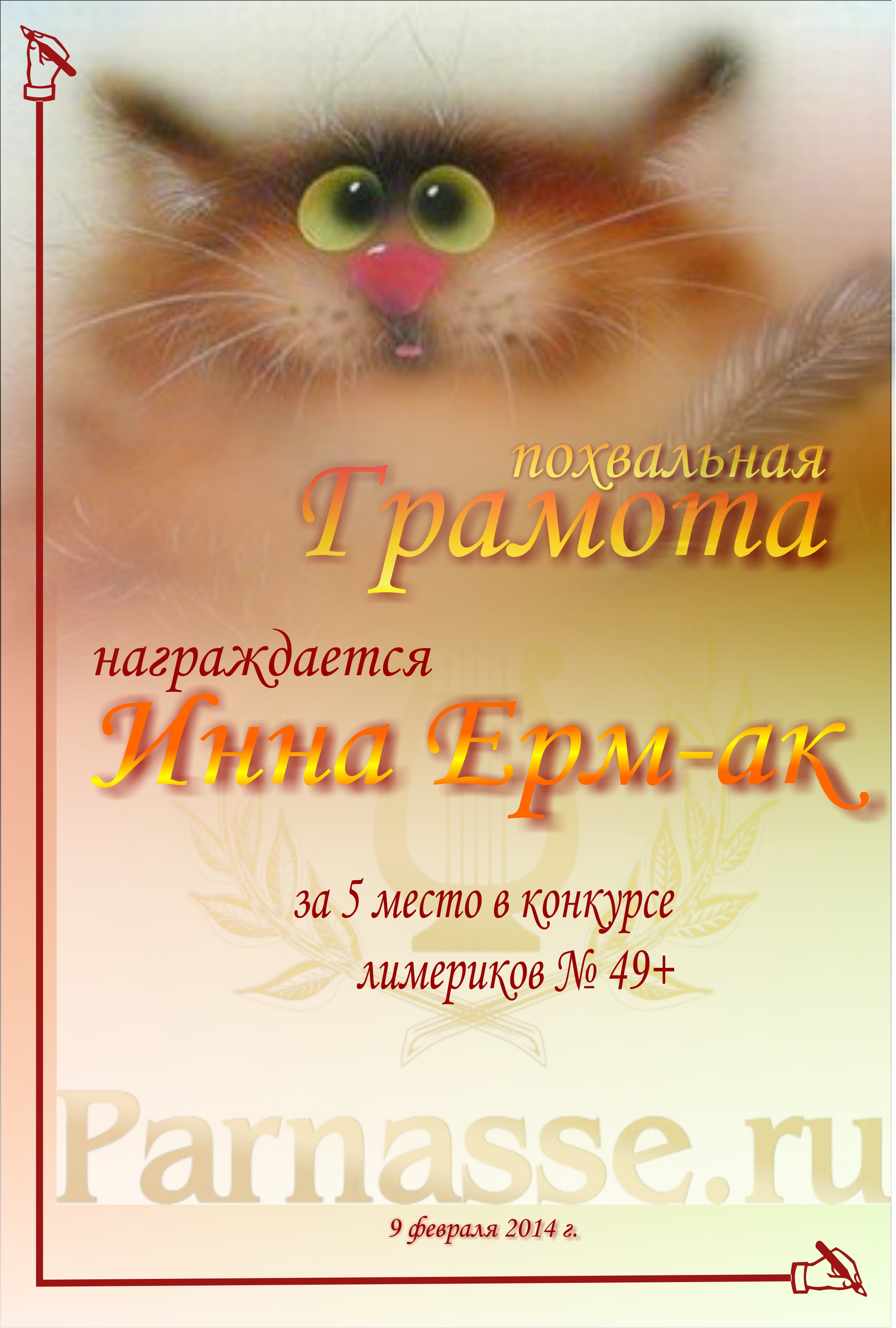 Похвальная грамота за 5 место в конкурсе лимериков № 49+ (9.02.2014 г.)