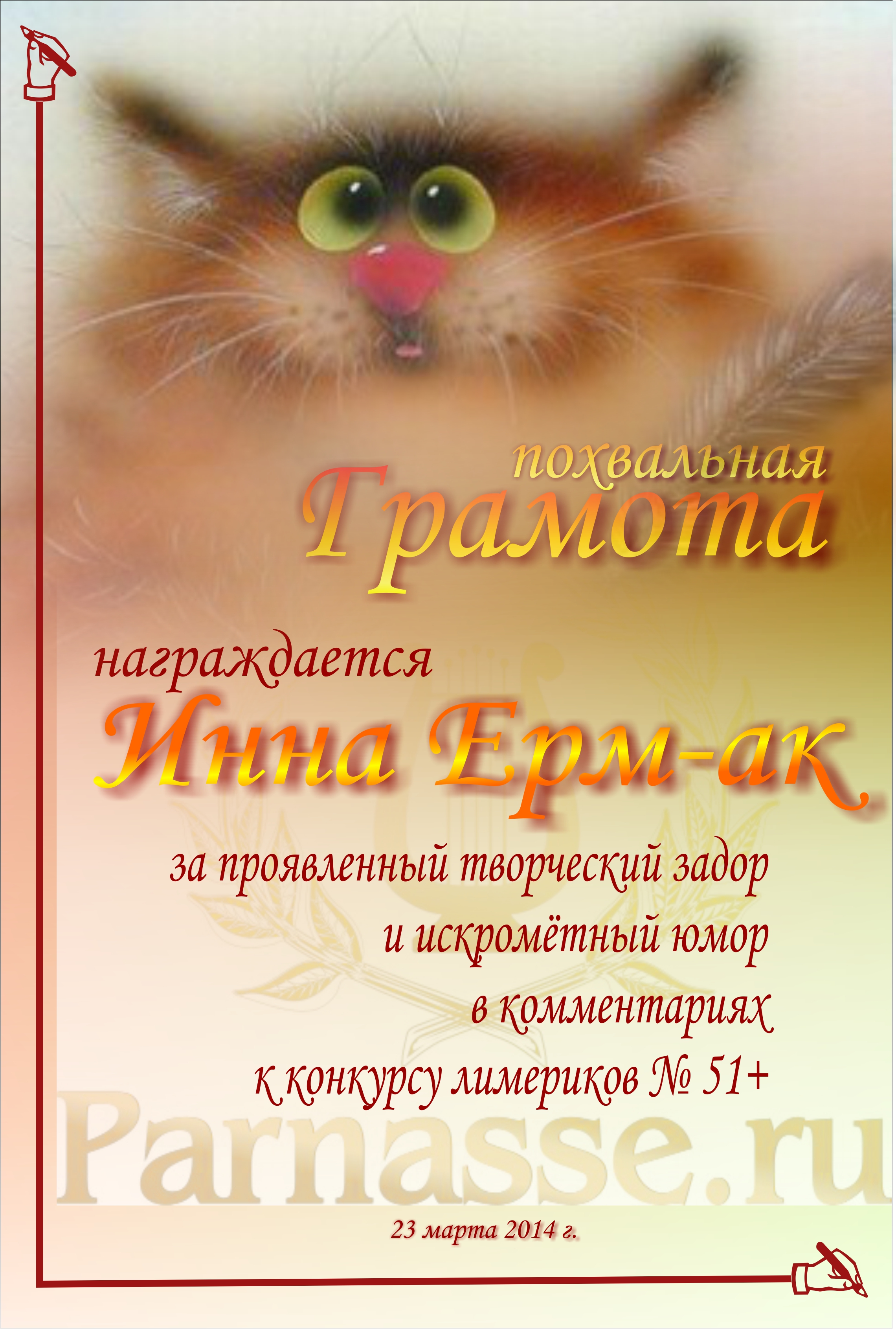 Похвальная грамота за активность в комментариях к конкурсу лимериков № 51+ (23.03.2014 г.)
