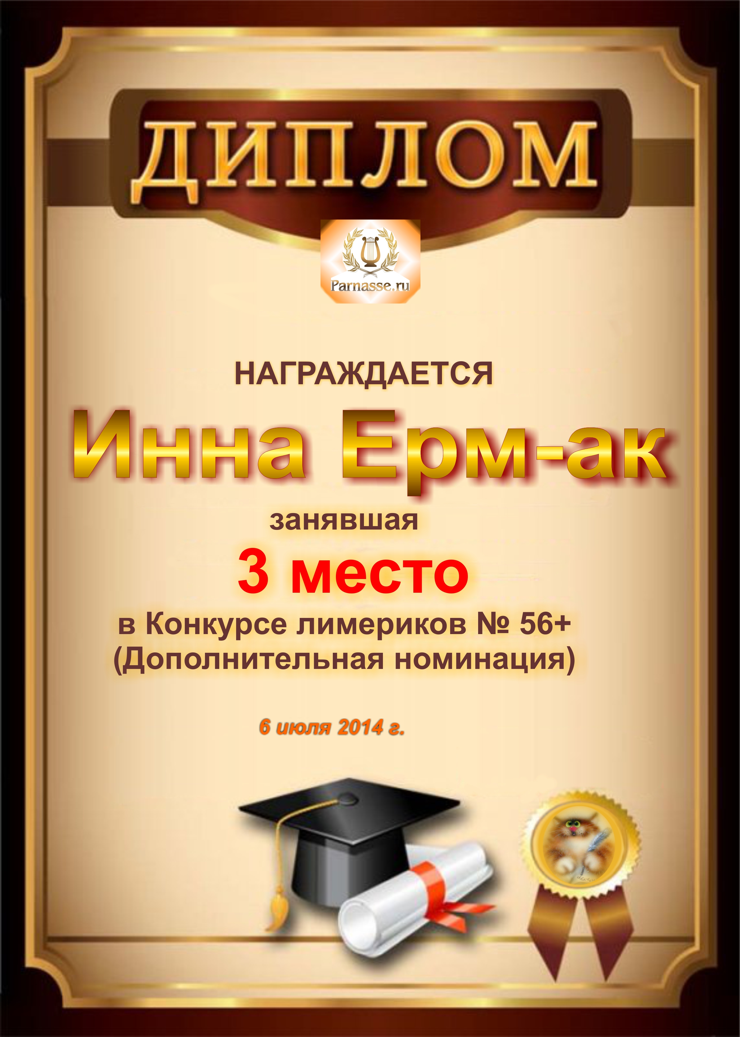Диплом за победу и 3 место в конкурсе лимериков № 56+ (6.07.2014г.)