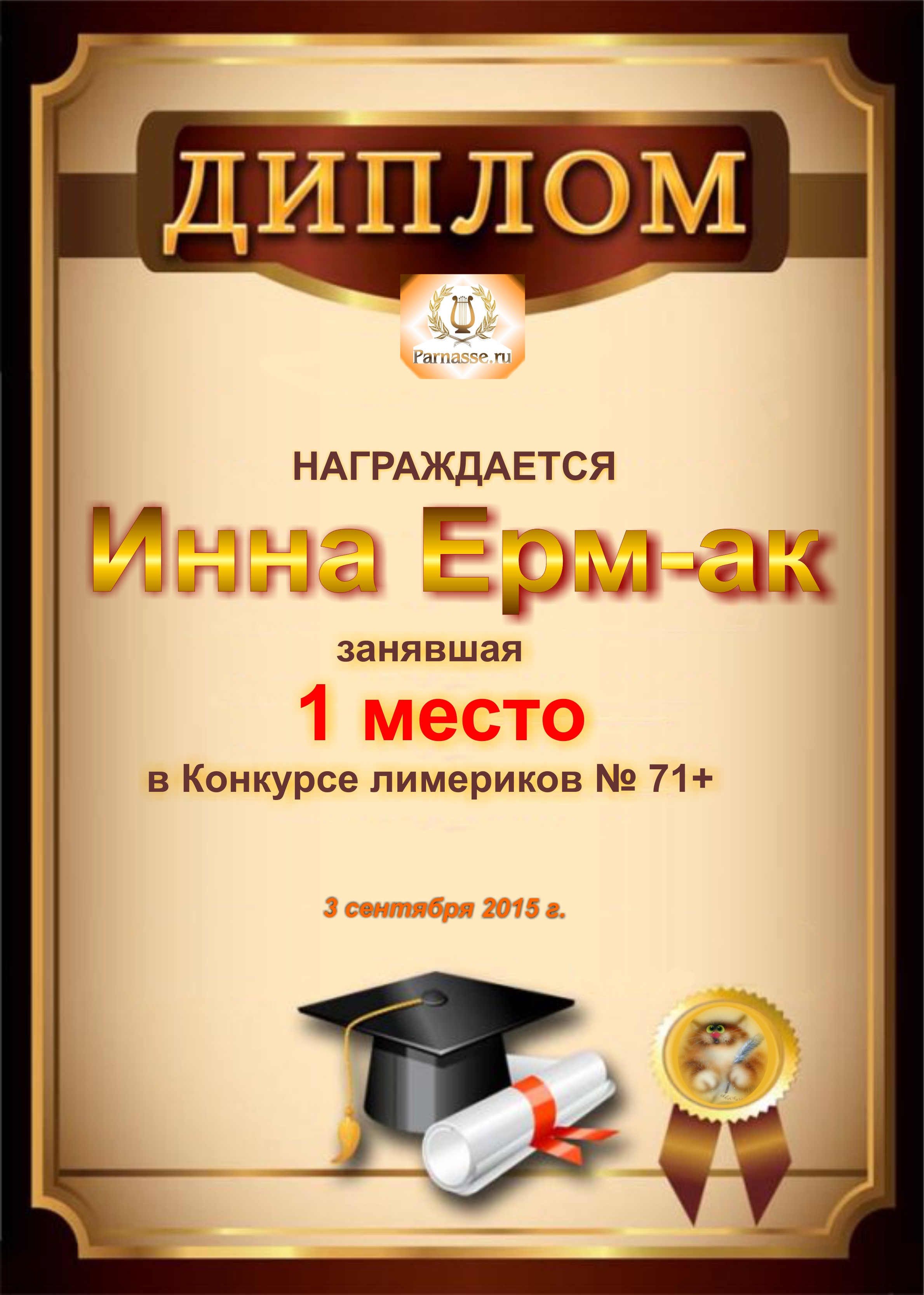 Диплом за победу и 1 место в конкурсе лимериков № 71+ (03.09.2015г.)