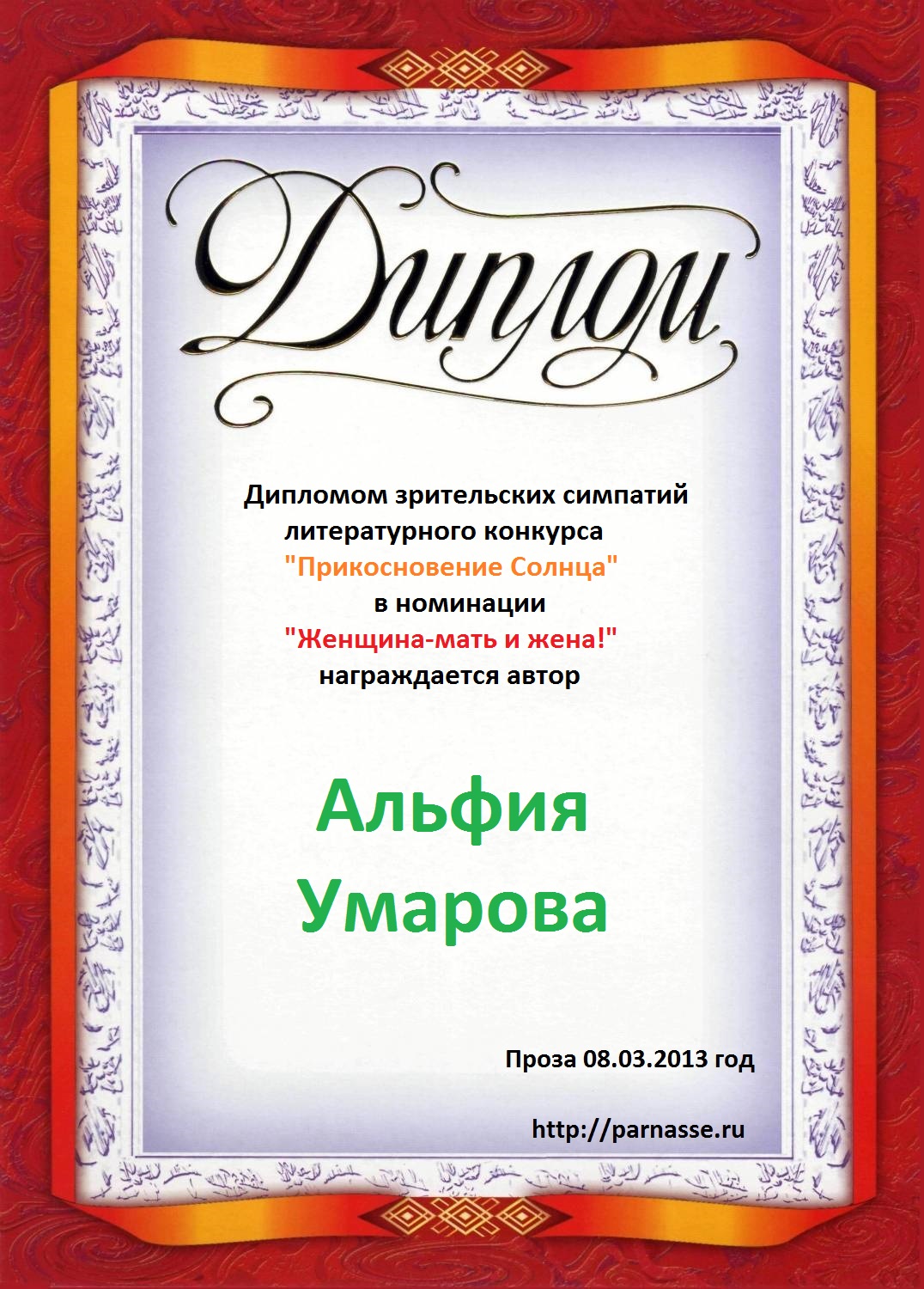 В анонимном конкурсе "Прикосновение Солнца" - ПРОЗА 2013 - номинация «Женщина-мать и жена»