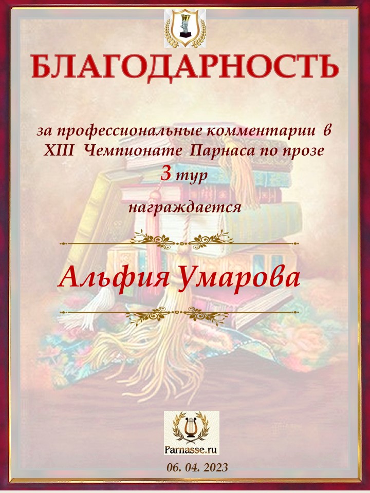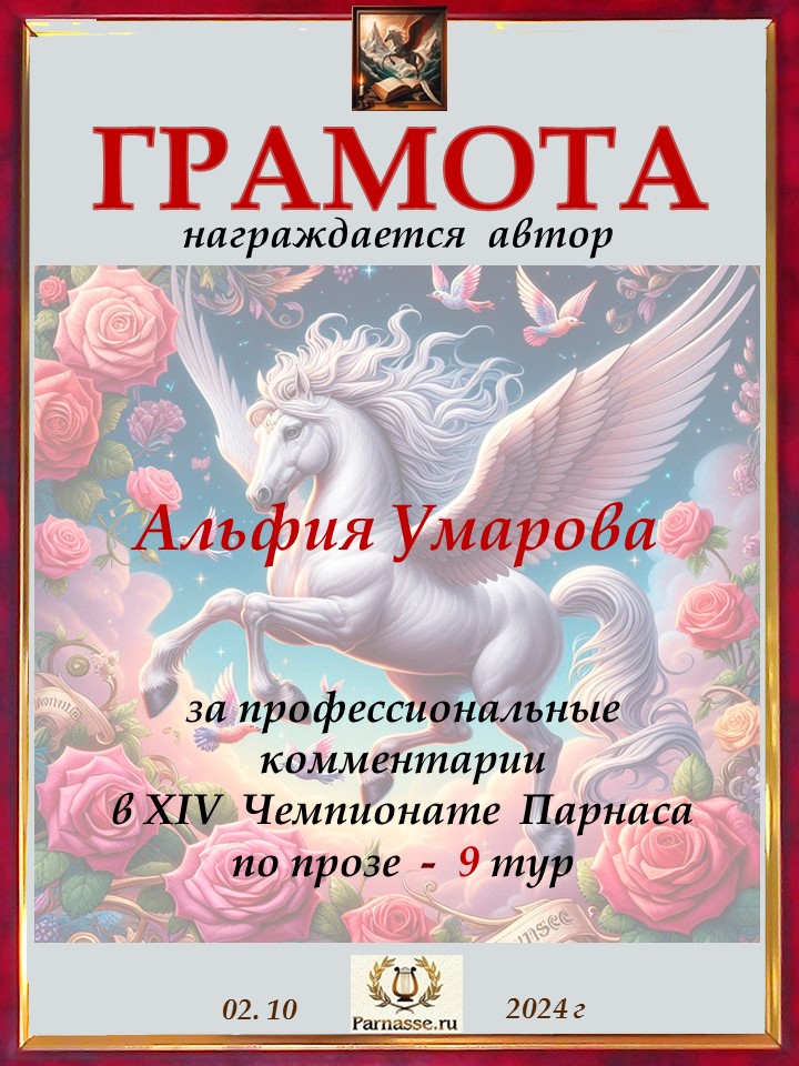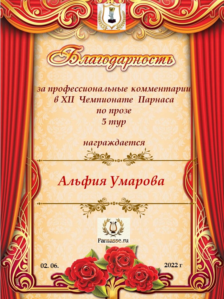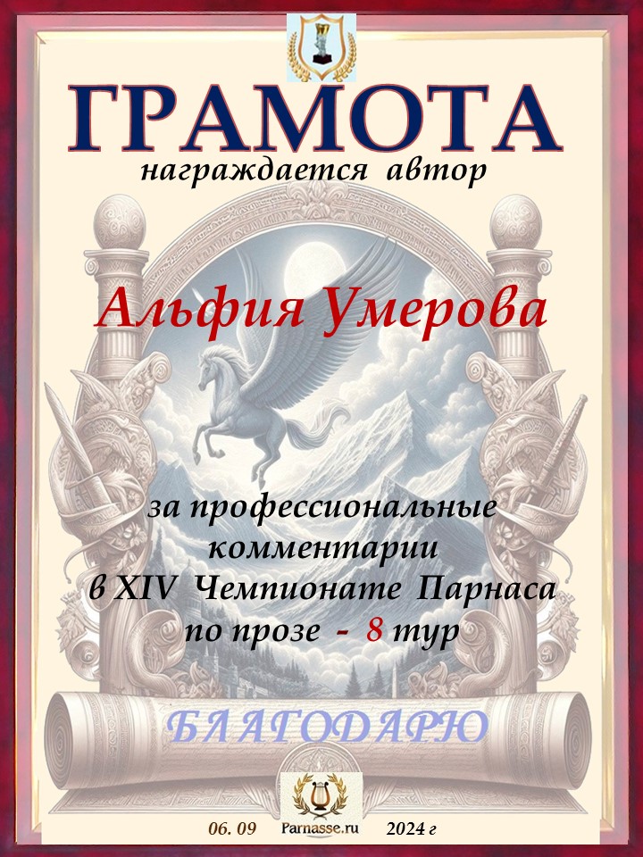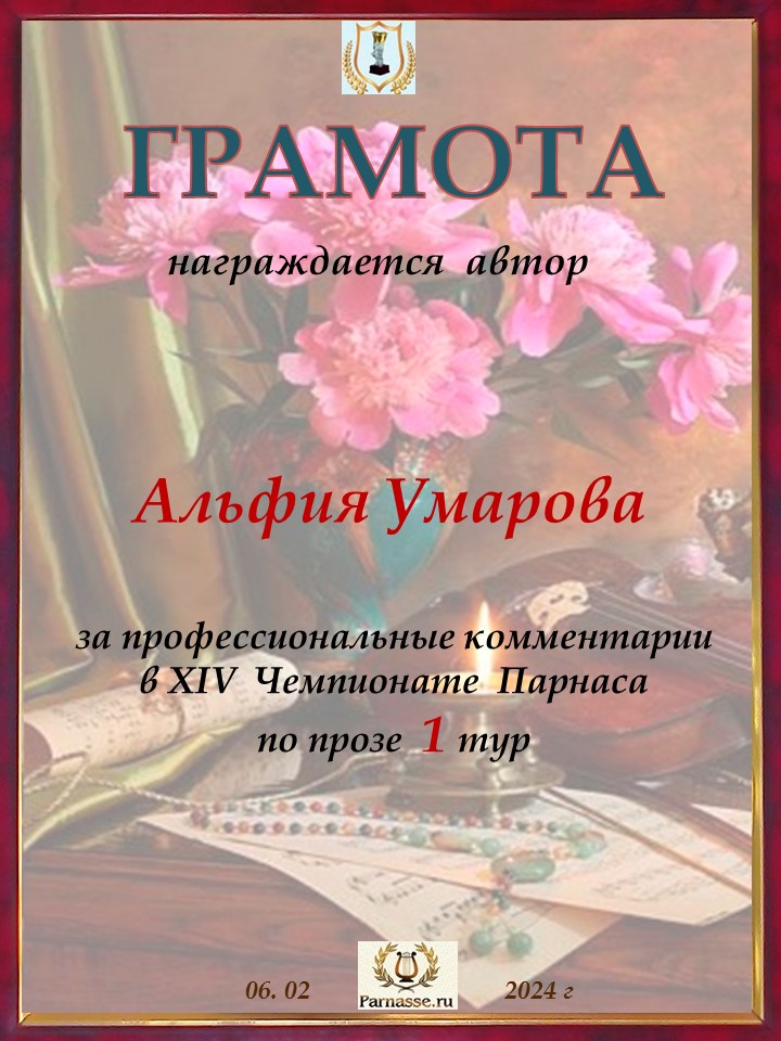 За ПЕРВОЕ место во втором Чемпионате Парнаса по прозе! Поздравляем! Спасибо за активное участие на Чемпионате!