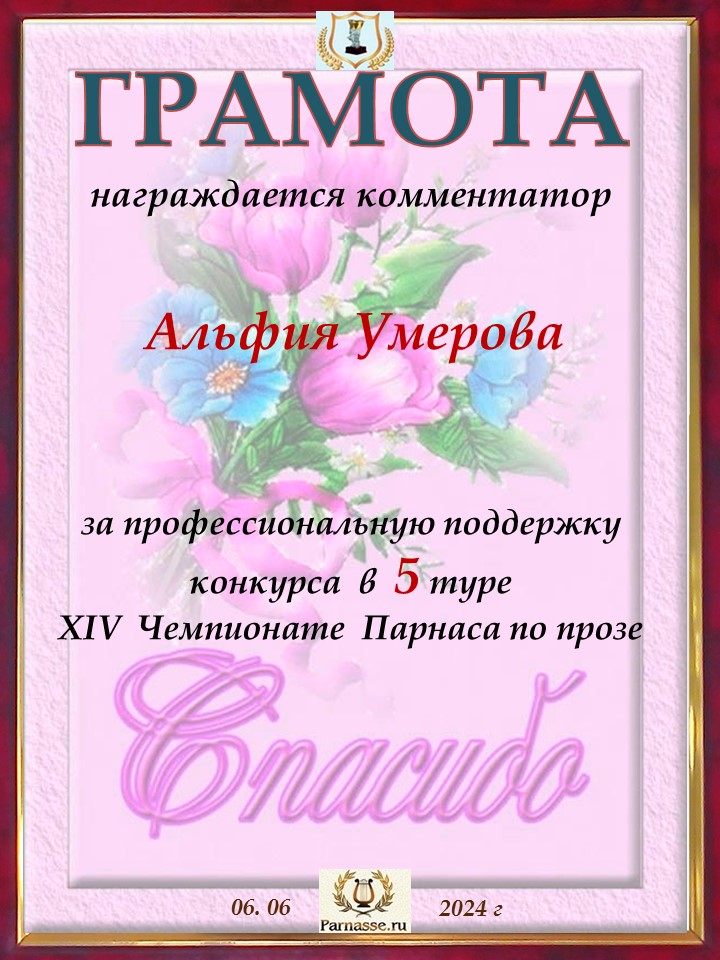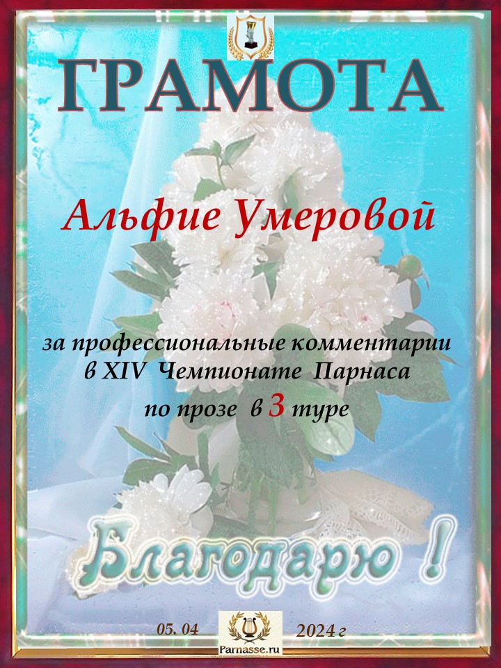 За прекрасное поздравление с Днём Рождения Парнаса! Очень-очень понравилось! БРА-ВО! Благодаря Вам, Альфия, наш общий праздник получился очень ярким, красивым и выразительным! С восхищением, Администрация! Со вторым Днём Рождения Парнаса!