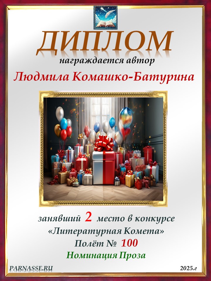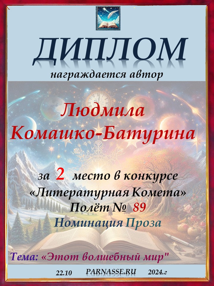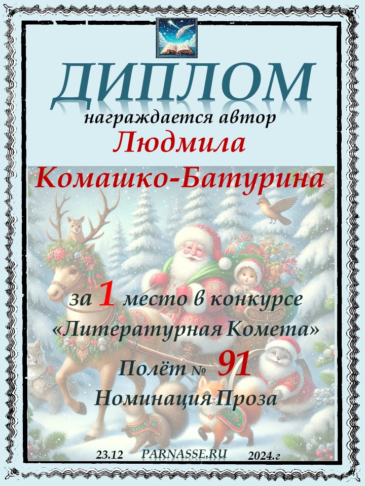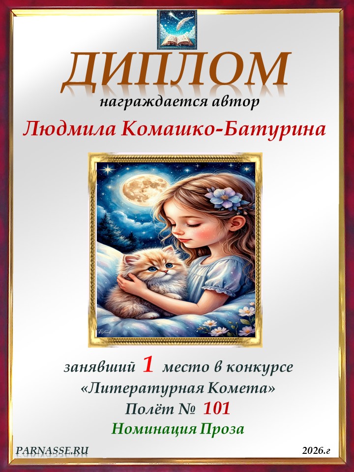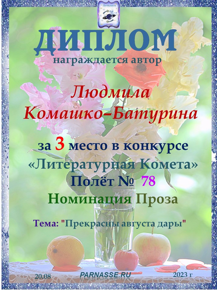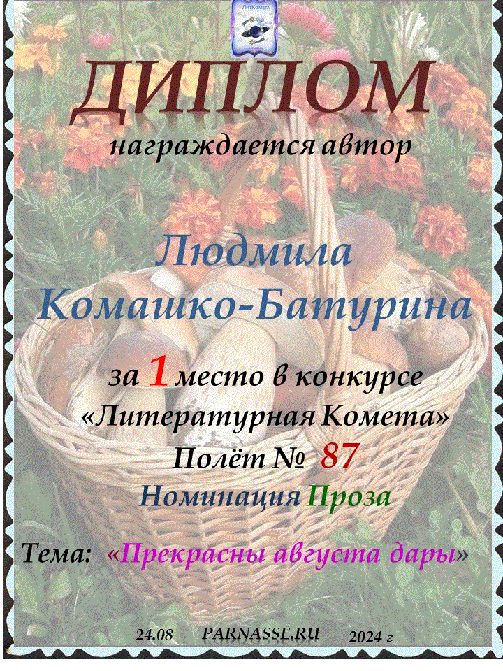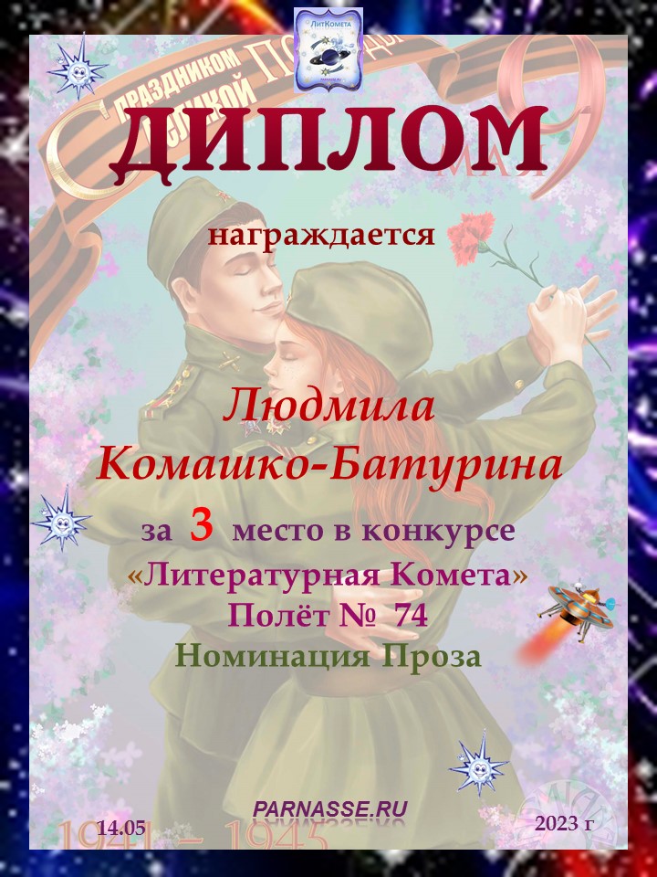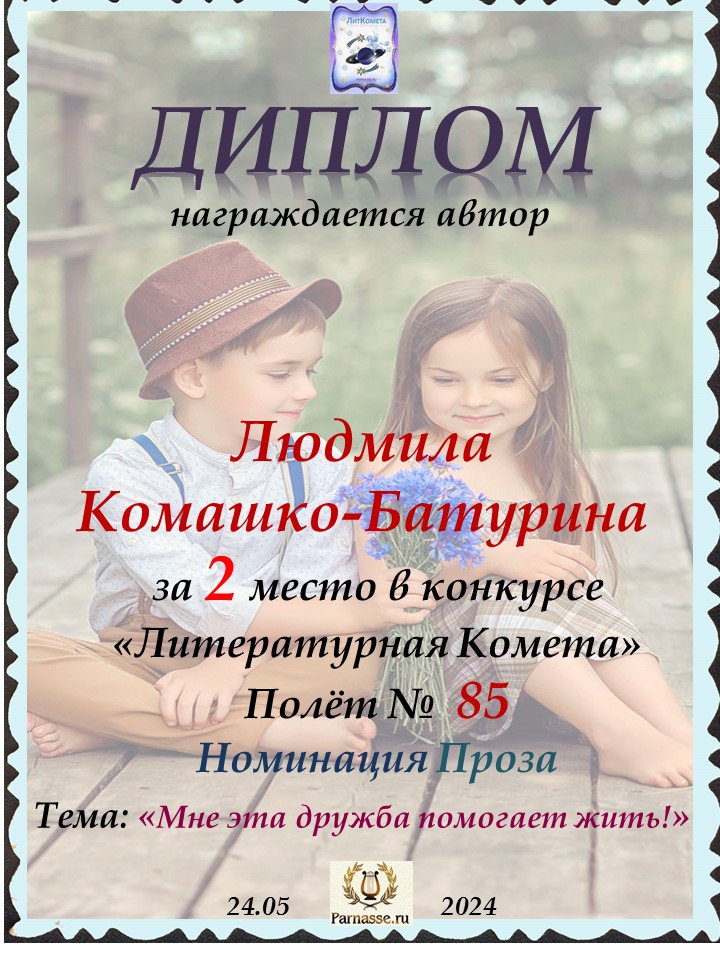 Поздравляю с 1 местом в конкурсе "Литературная Комета - Полёт № 24" номинация Проза! Спасибо за творчество!