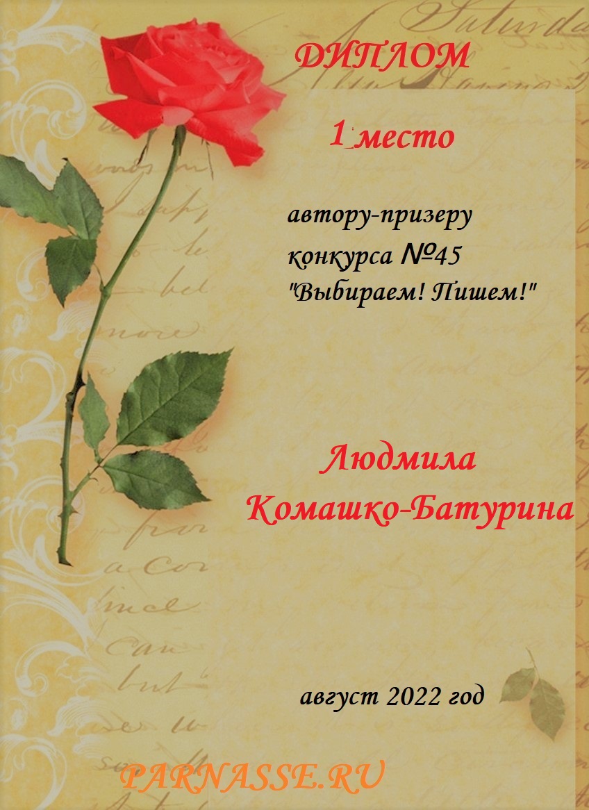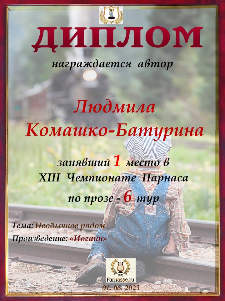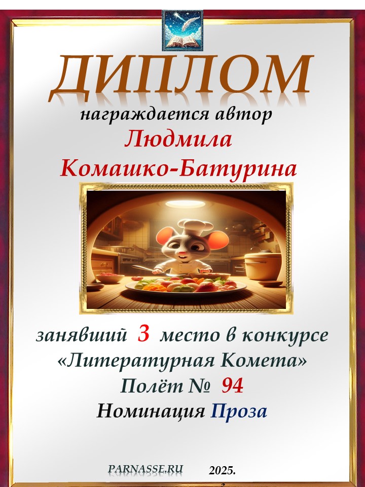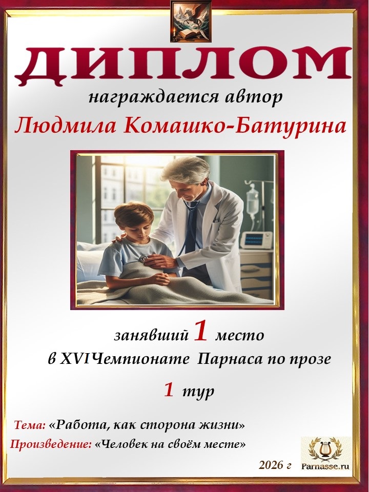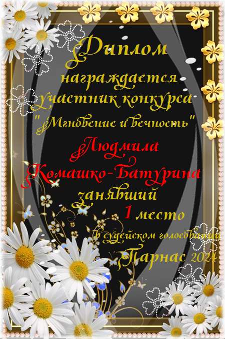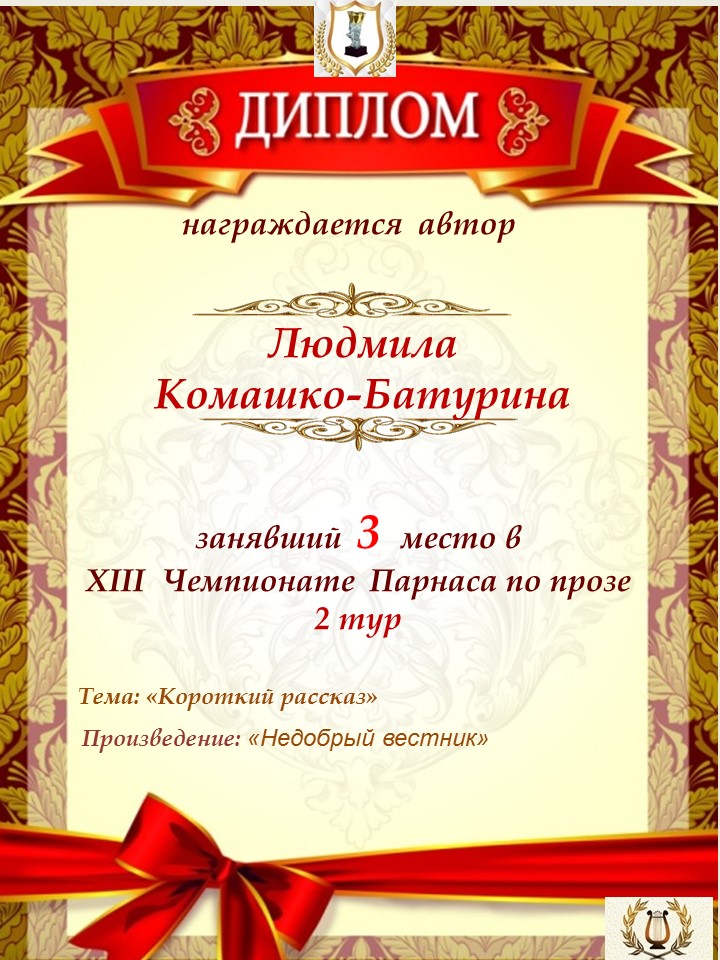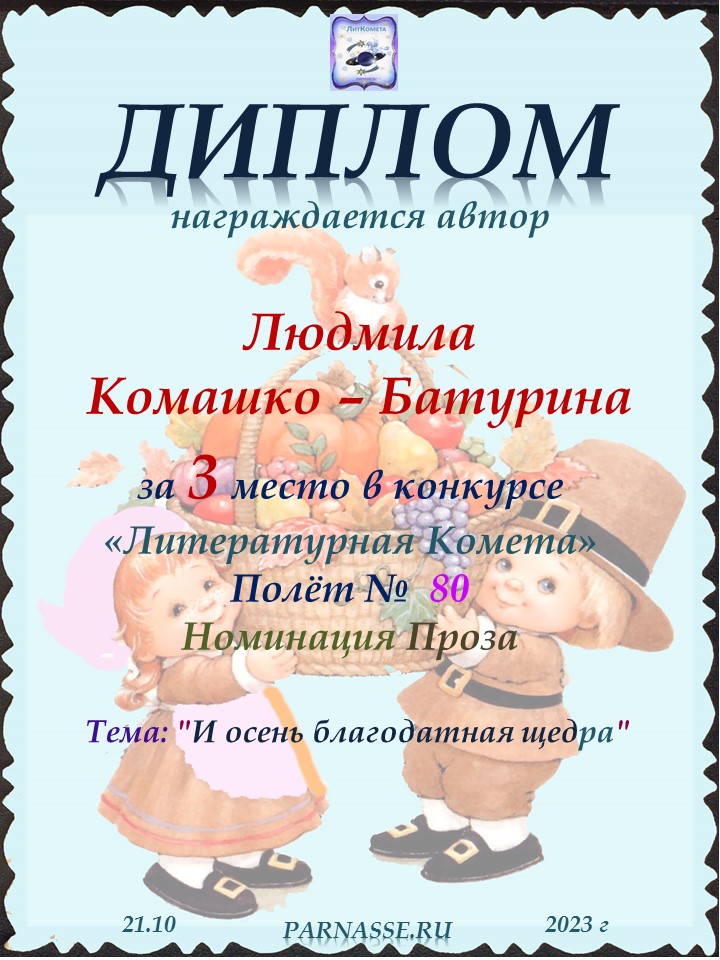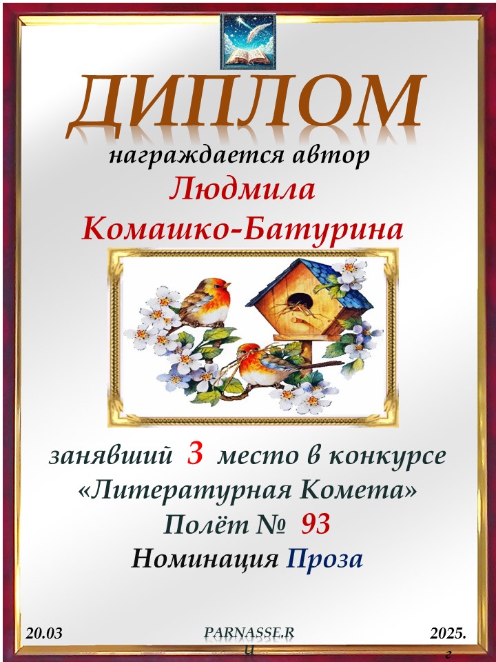 Поздравляю с 1 местом в конкурсе "Литературная Комета - Полёт № 24" номинация Проза! Спасибо за творчество!