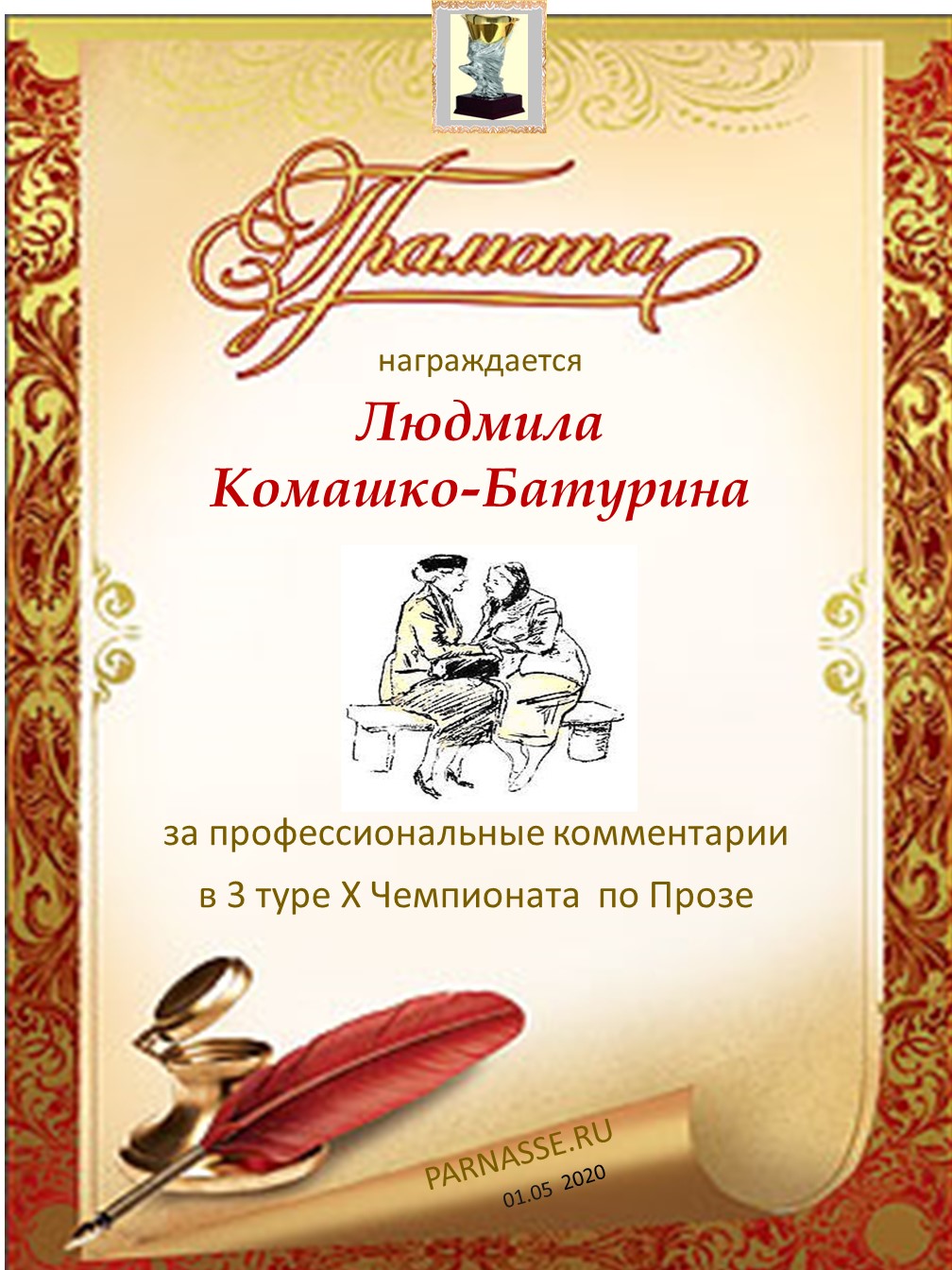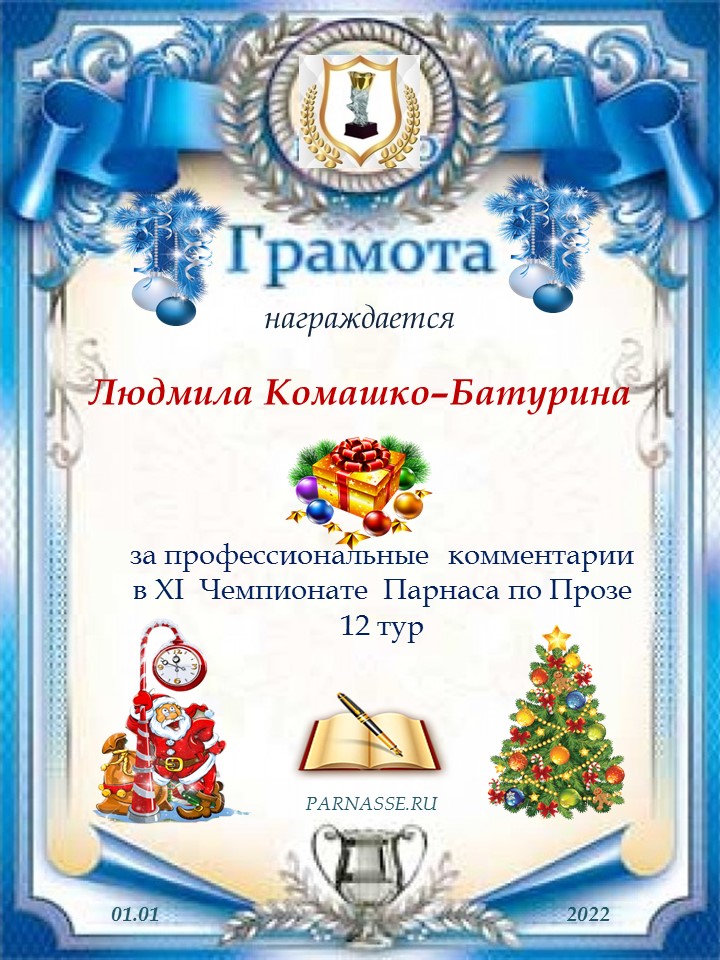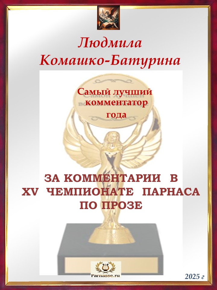 ![]() Медаль комментатора в 12 туре XV Чемпионата Парнаса по прозе