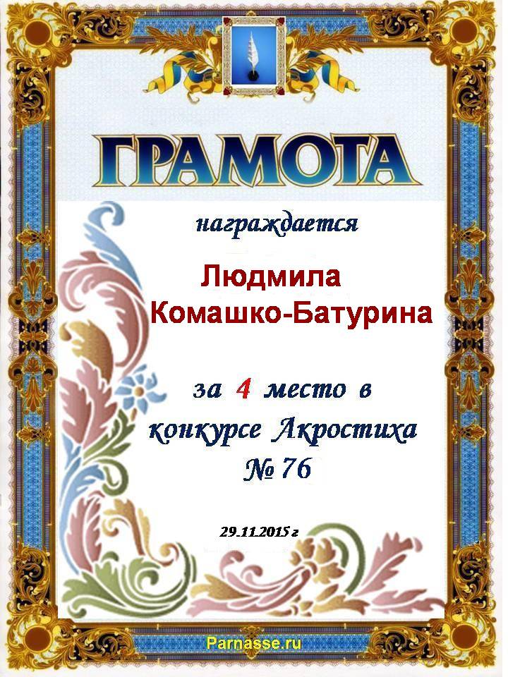 Грамота за 4 место в 96 конкурсе АКРОСТИХА (Альтернатива)! ПОЗДРАВЛЯЮ!