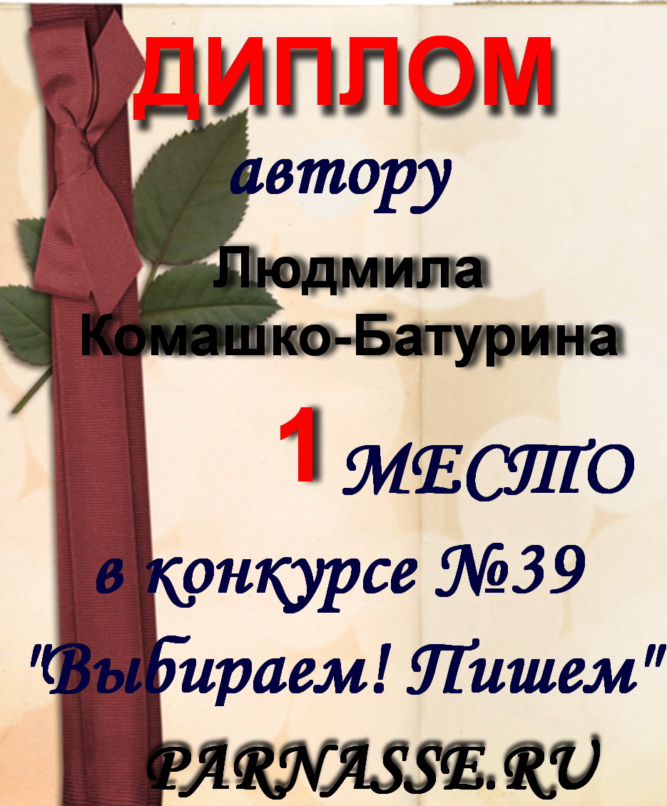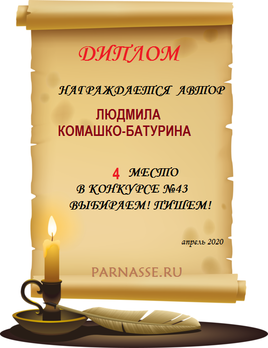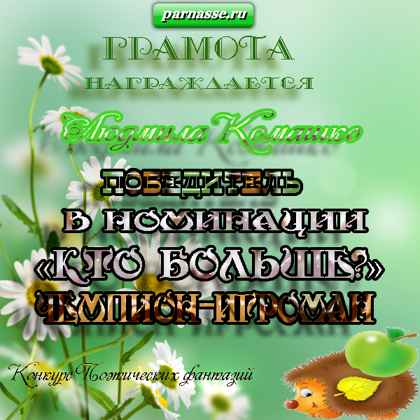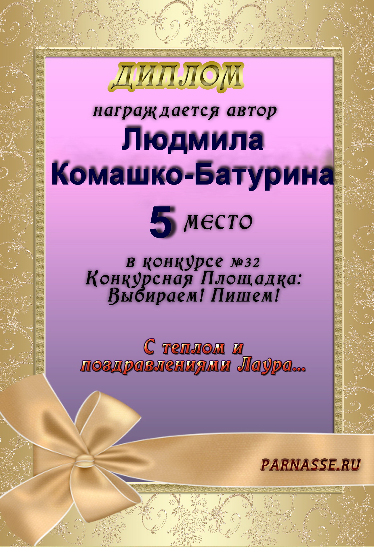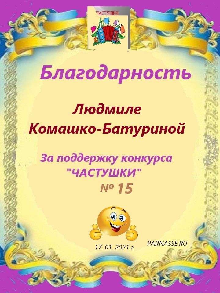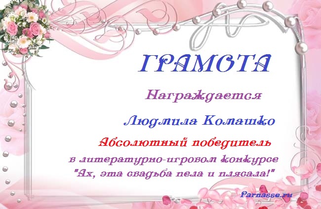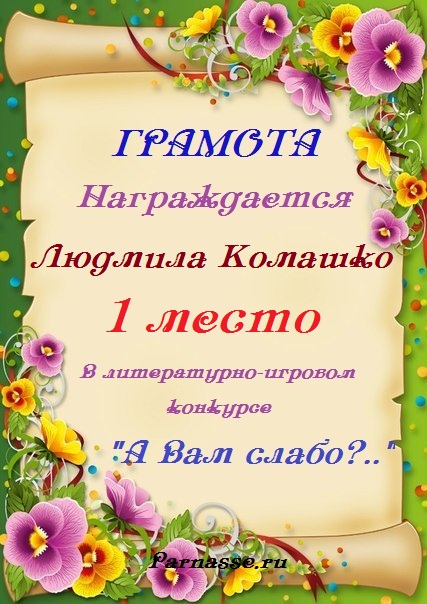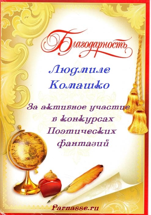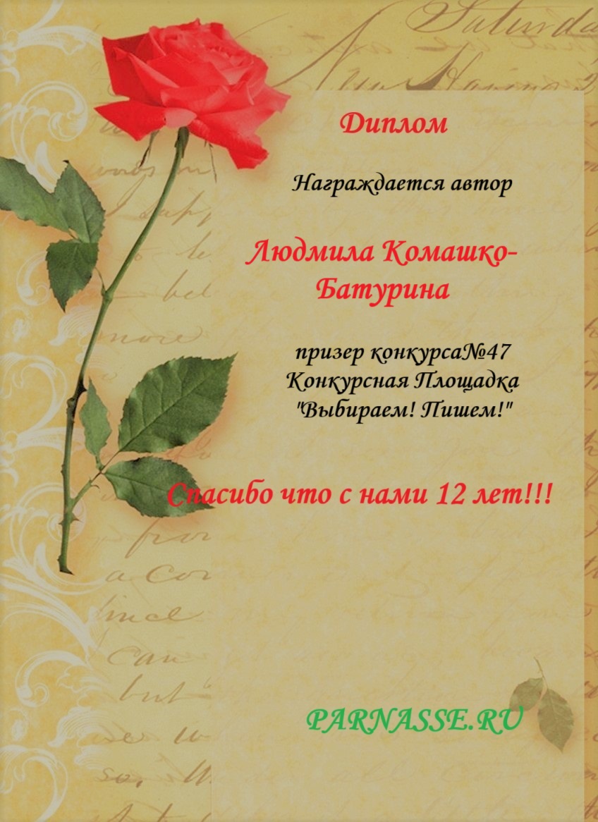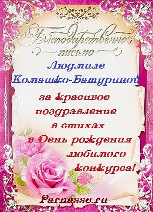 Номинация "Лучшее поздравление Парнасу в прозе".Искренне и от всего сердца благодарим Вас, ЛЮДМИЛА, за участие в юбилейном конкурсе, за Ваши прекрасные, ярчайшие слова благодарности нашему порталу! Мы желаем Вам крепкого здоровья, жизнелюбия, творческой Музы и исполнения самых заветных желаний, которые только у Вас есть!
