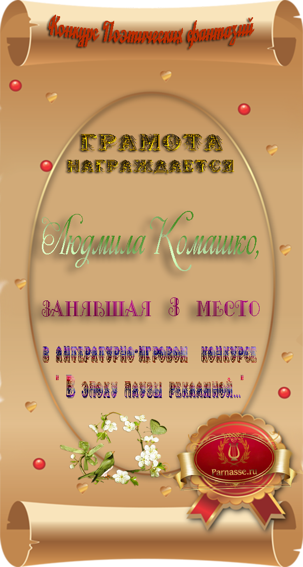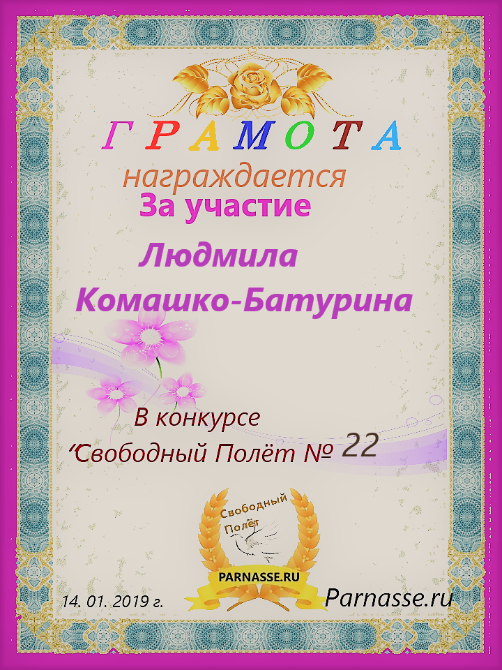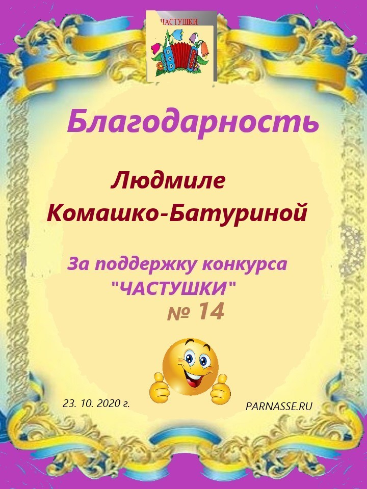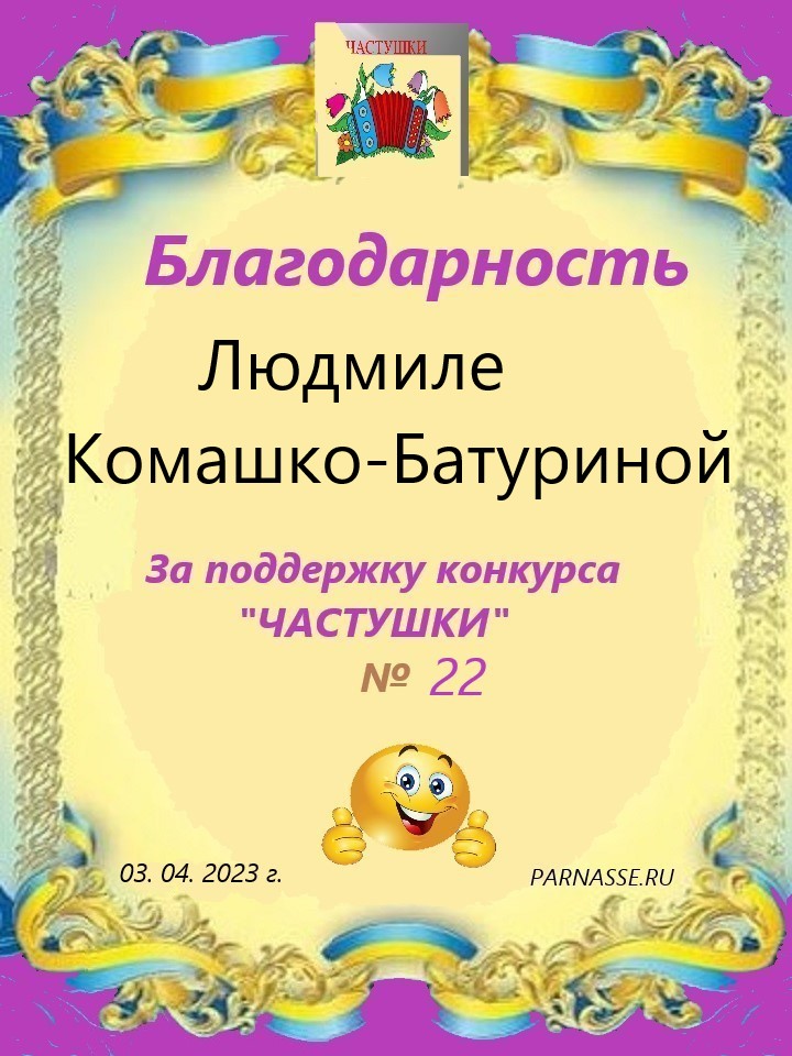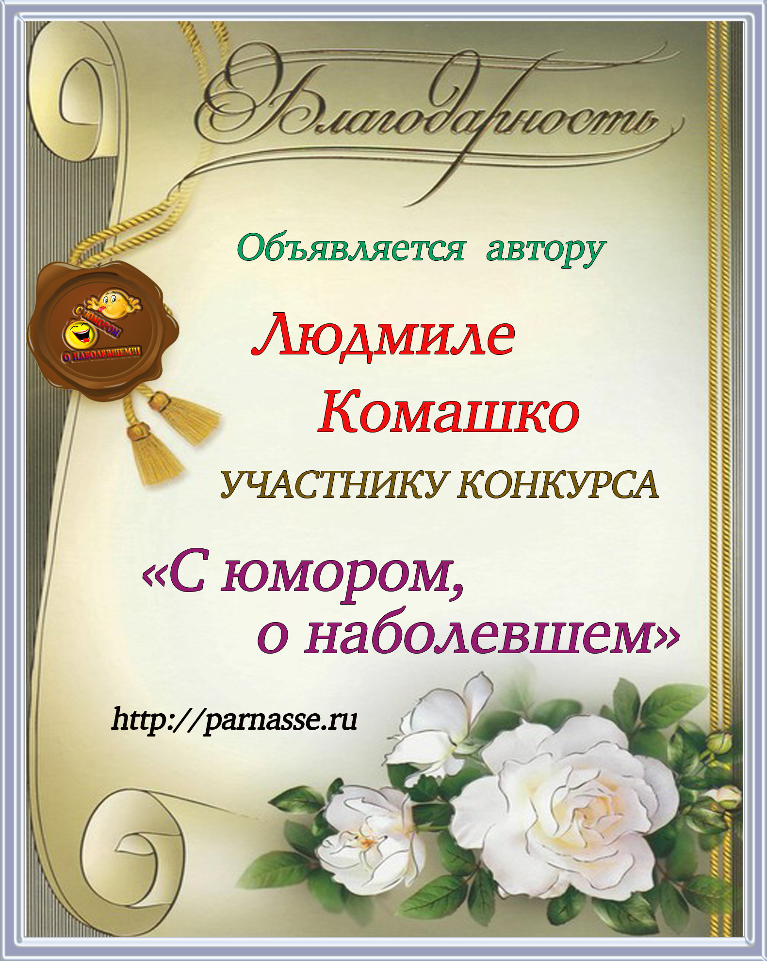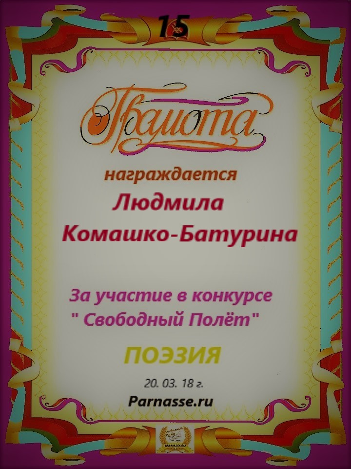 Номинация "Лучшее поздравление Парнасу в прозе".Искренне и от всего сердца благодарим Вас, ЛЮДМИЛА, за участие в юбилейном конкурсе, за Ваши прекрасные, ярчайшие слова благодарности нашему порталу! Мы желаем Вам крепкого здоровья, жизнелюбия, творческой Музы и исполнения самых заветных желаний, которые только у Вас есть!