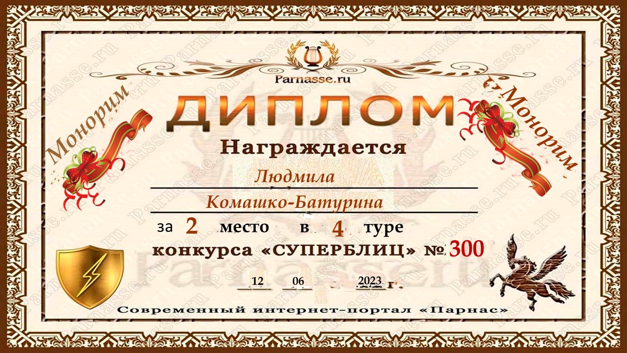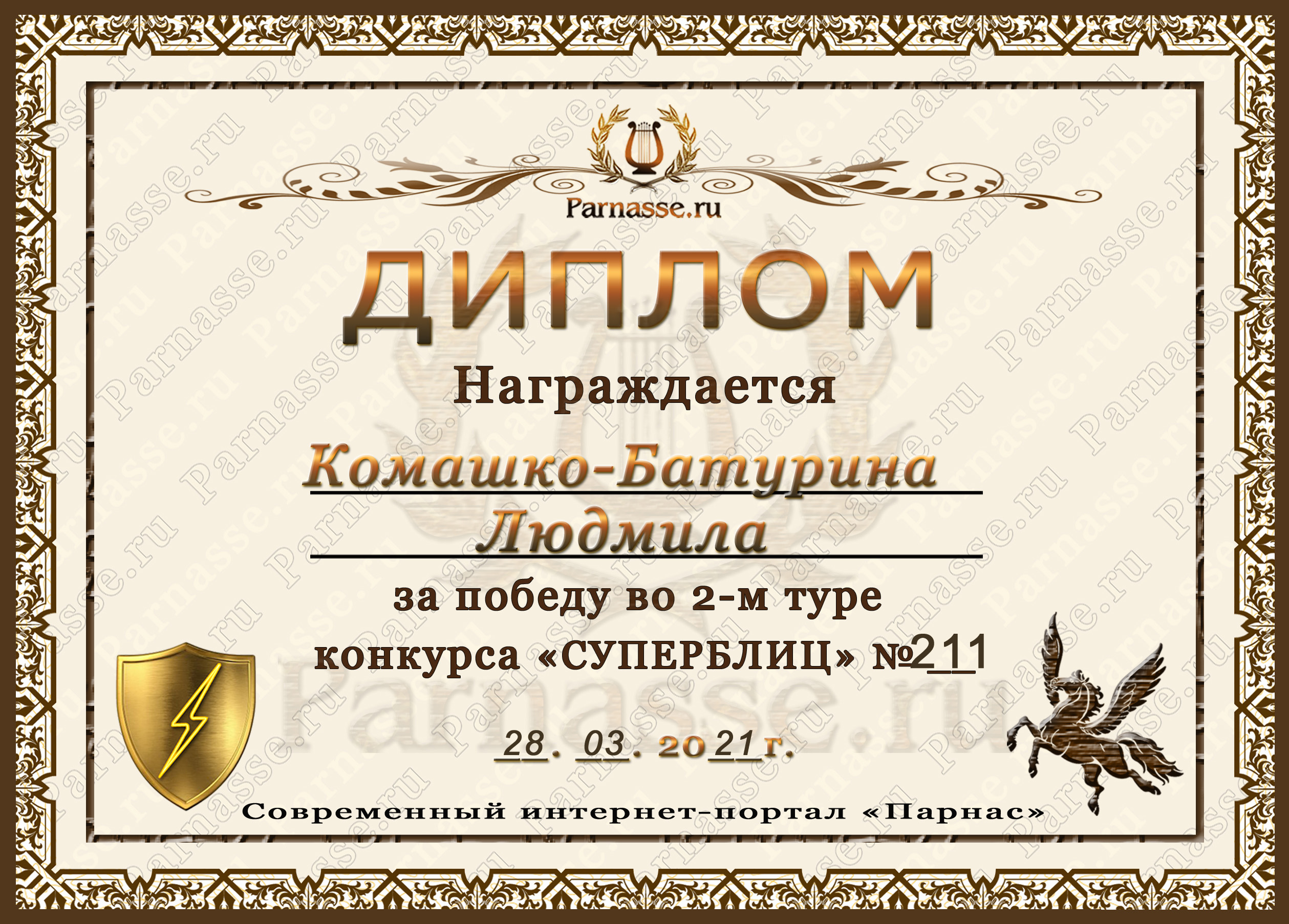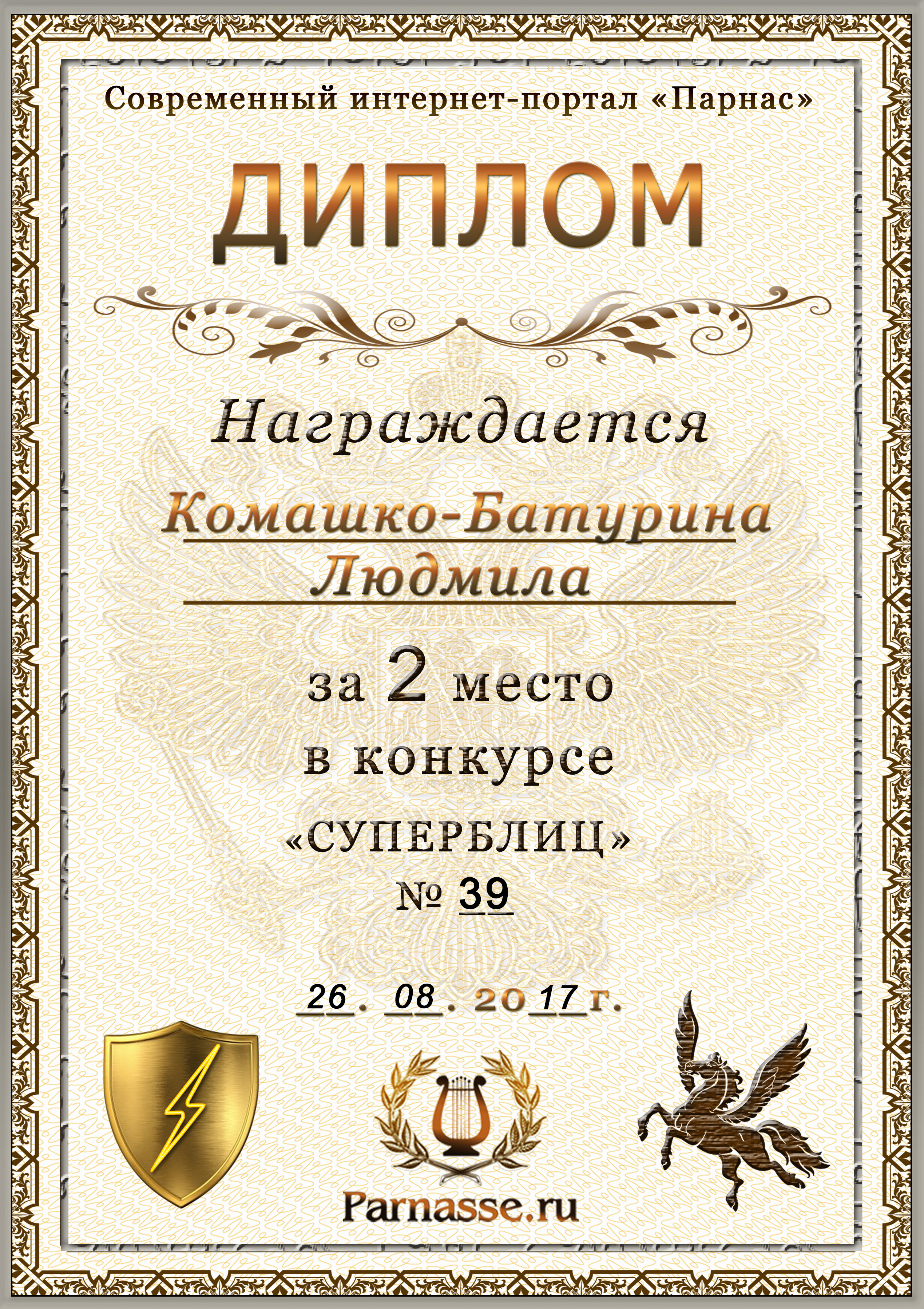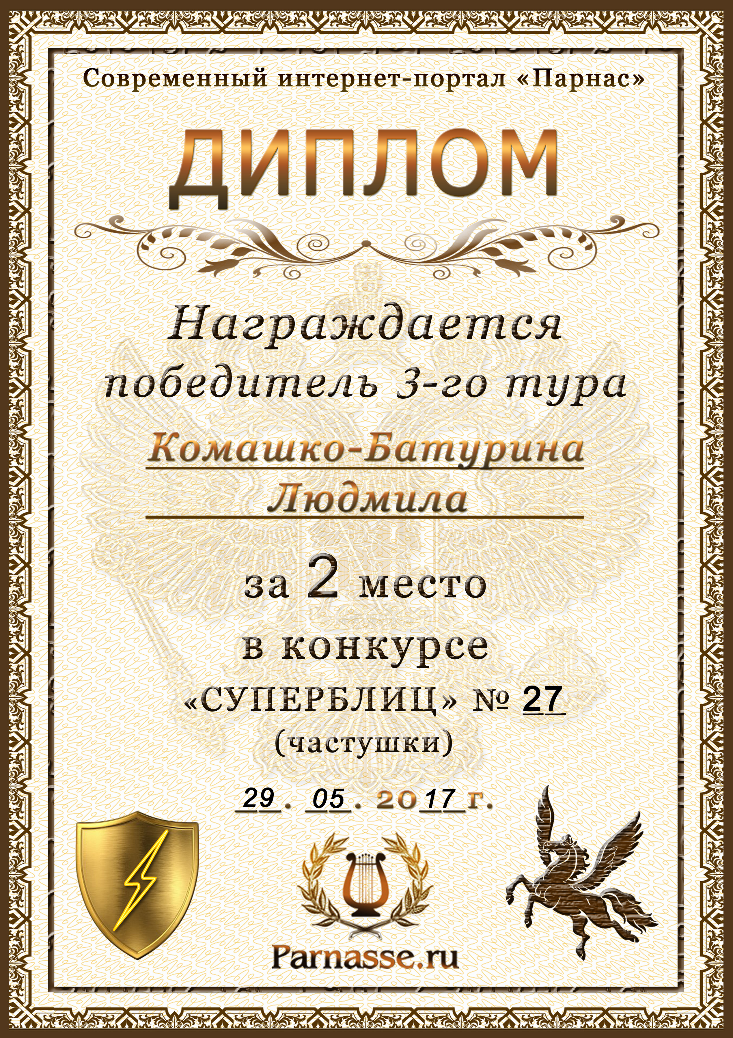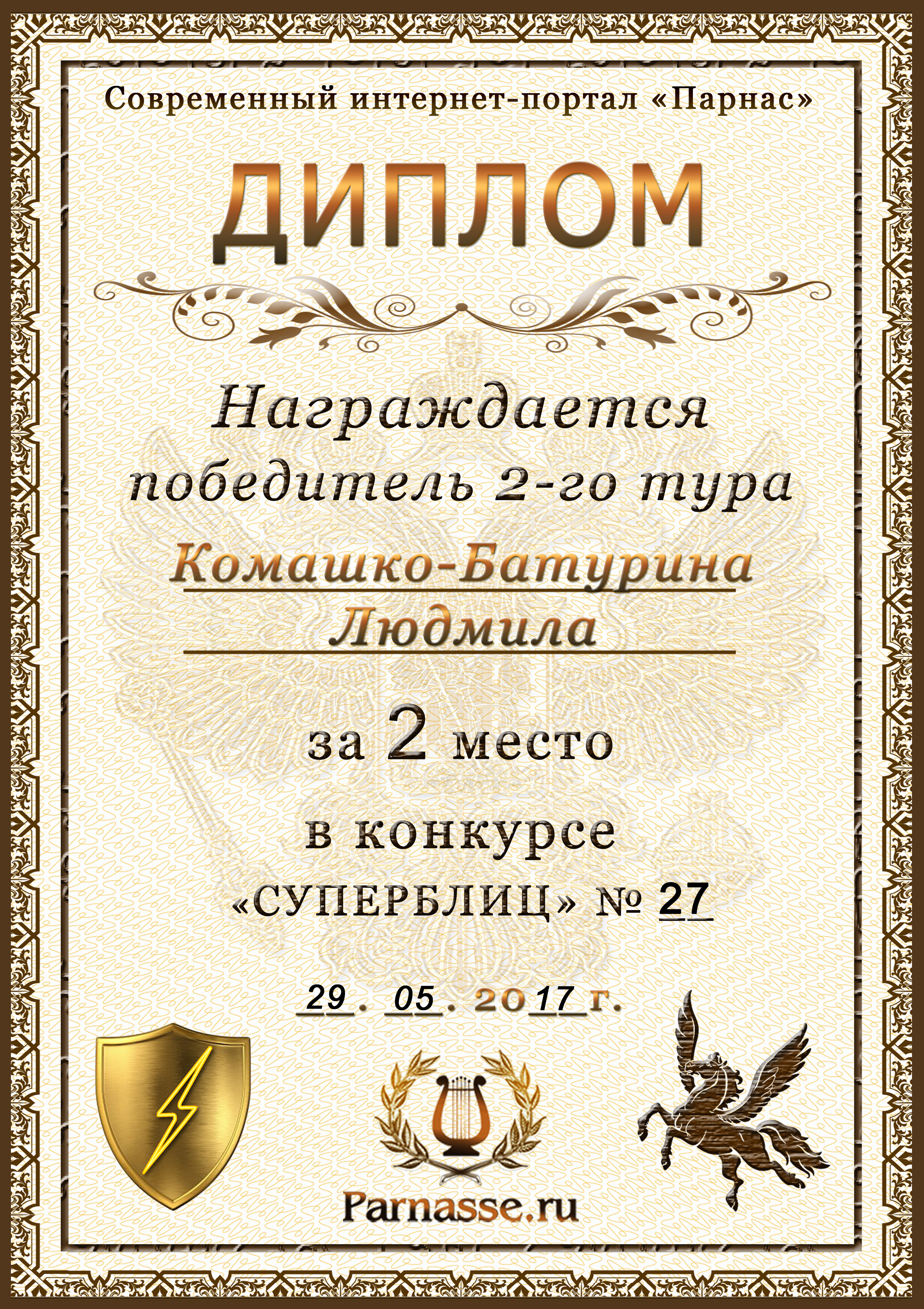 Диплом за 2 место во 2 туре в конкурсе СУПЕРБЛИЦА № 27!ПОЗДРАВЛЯЮ!