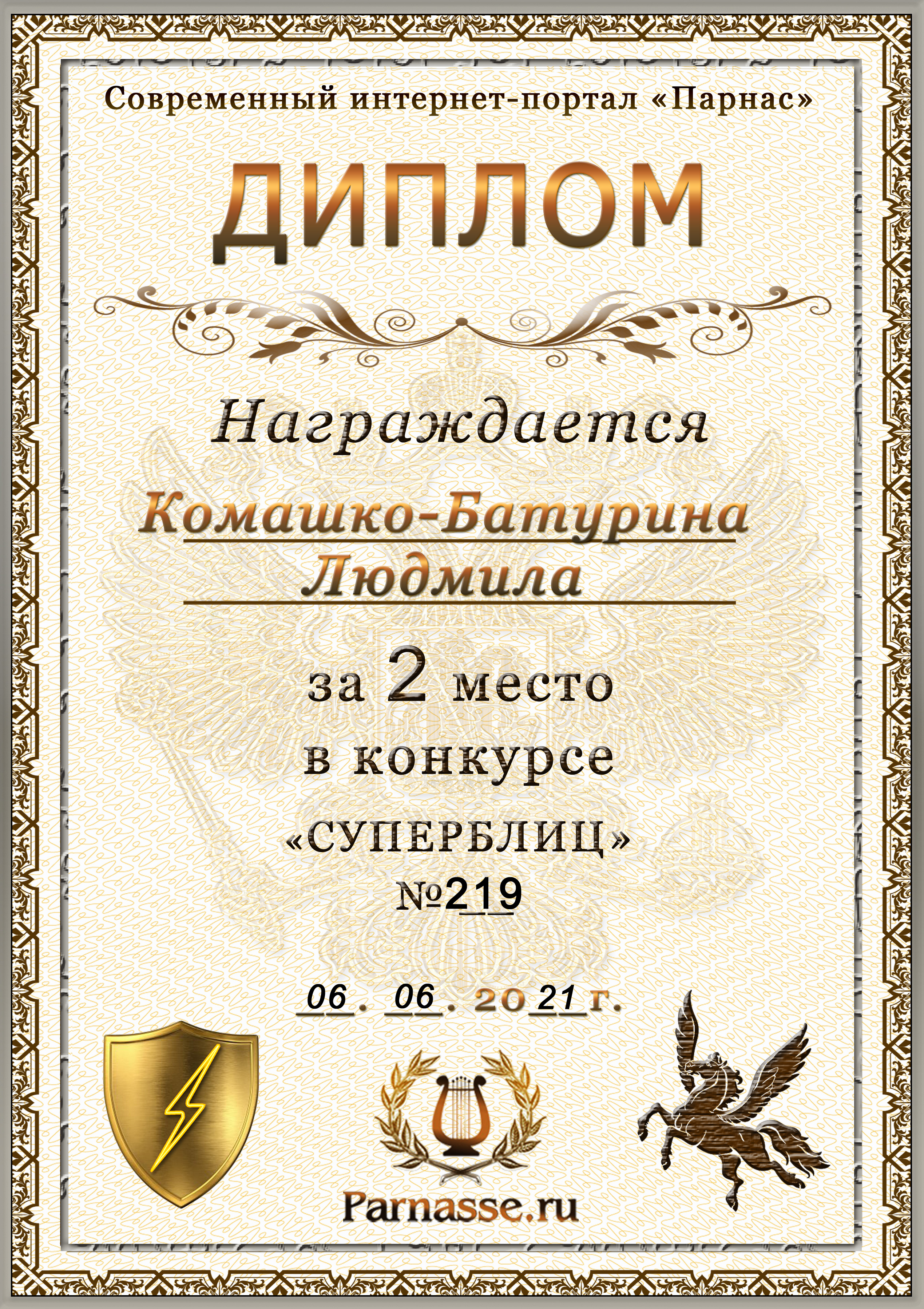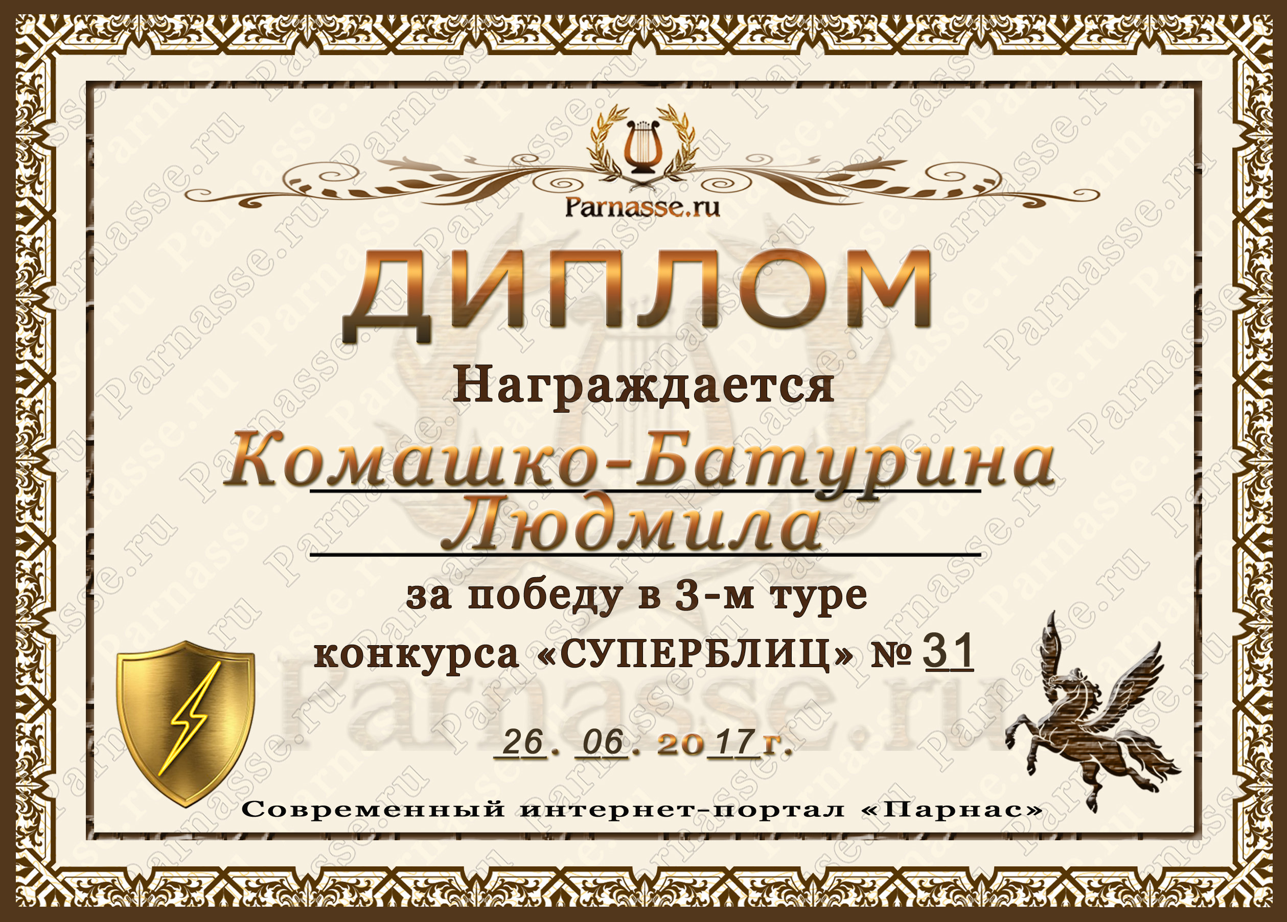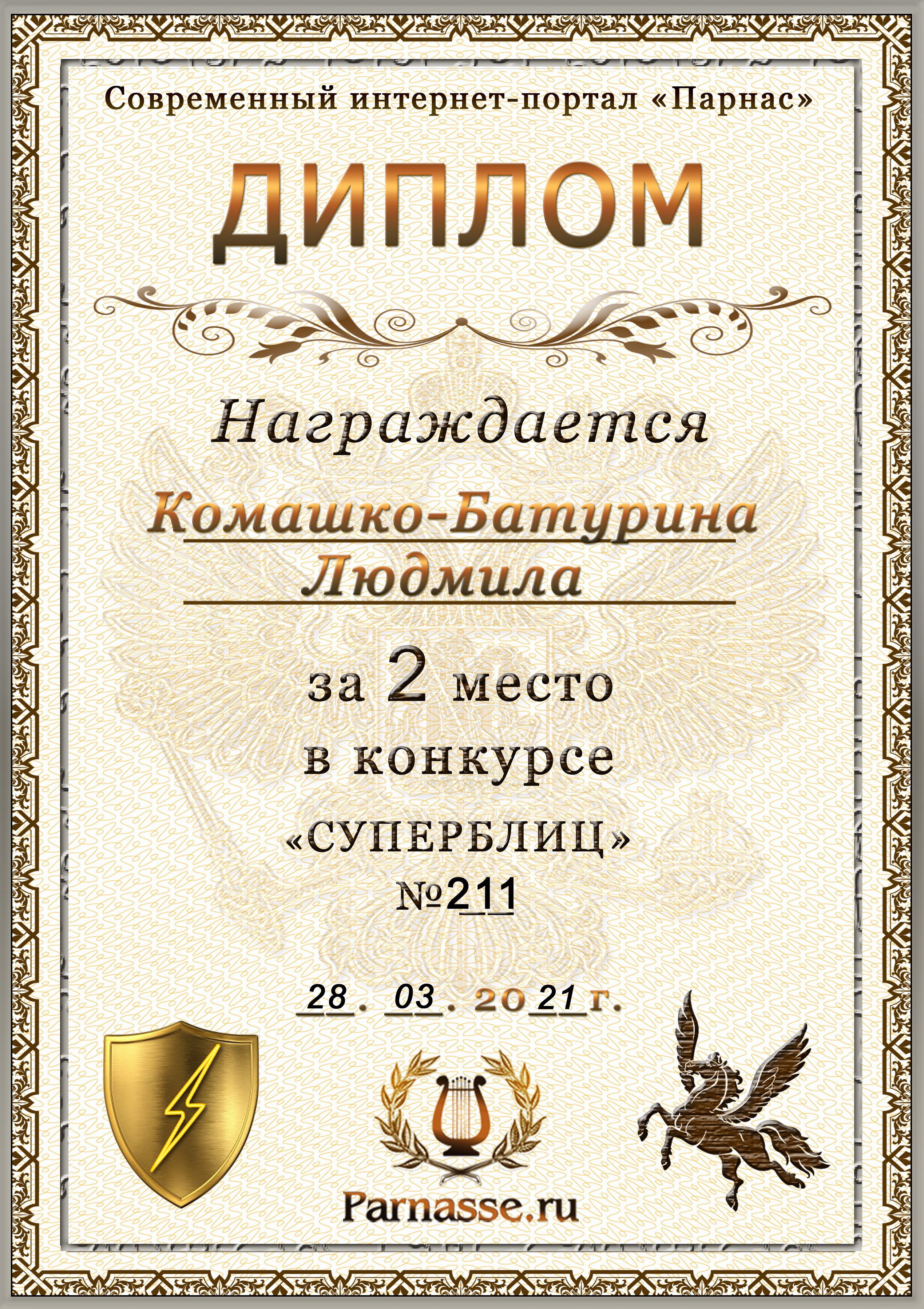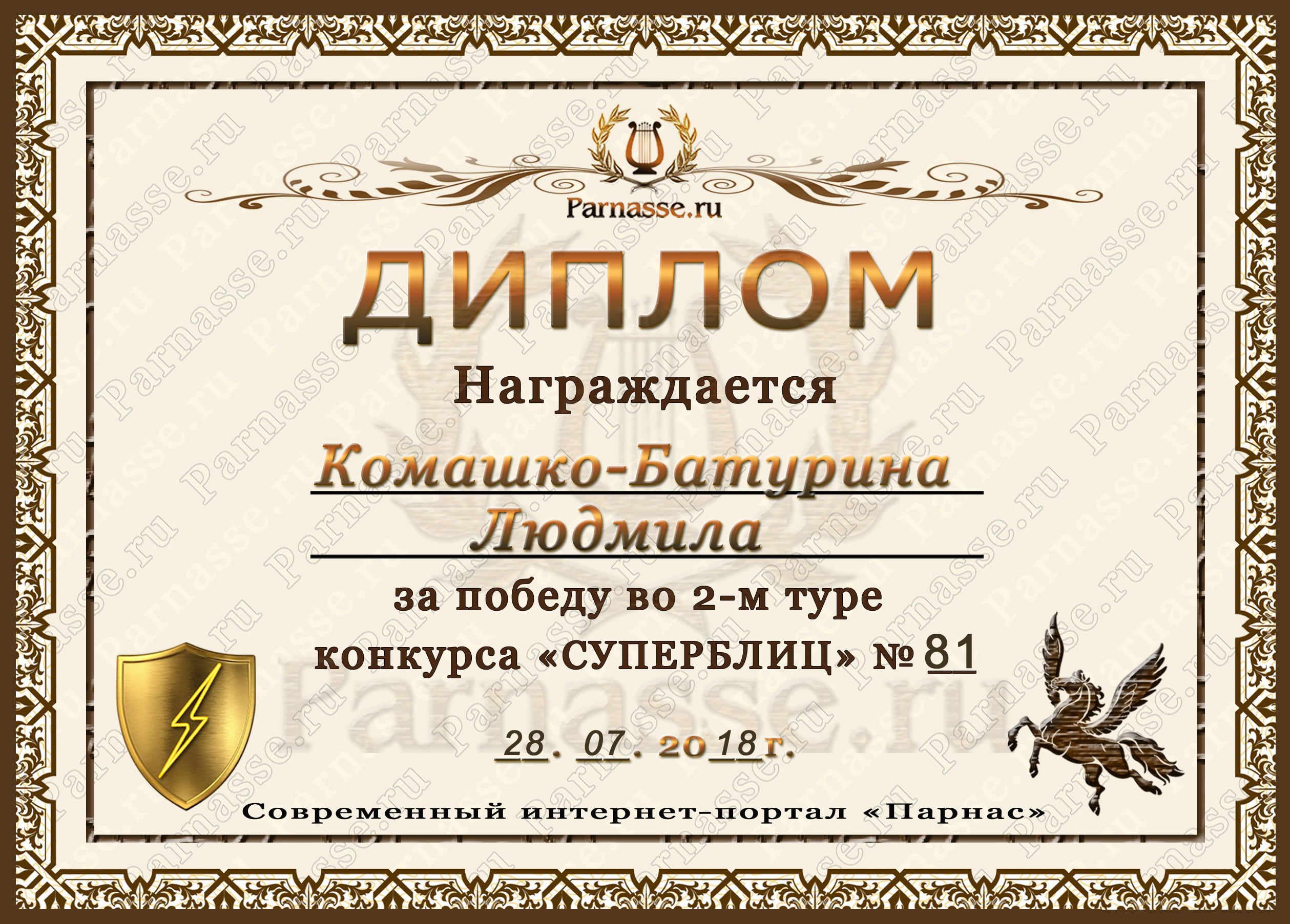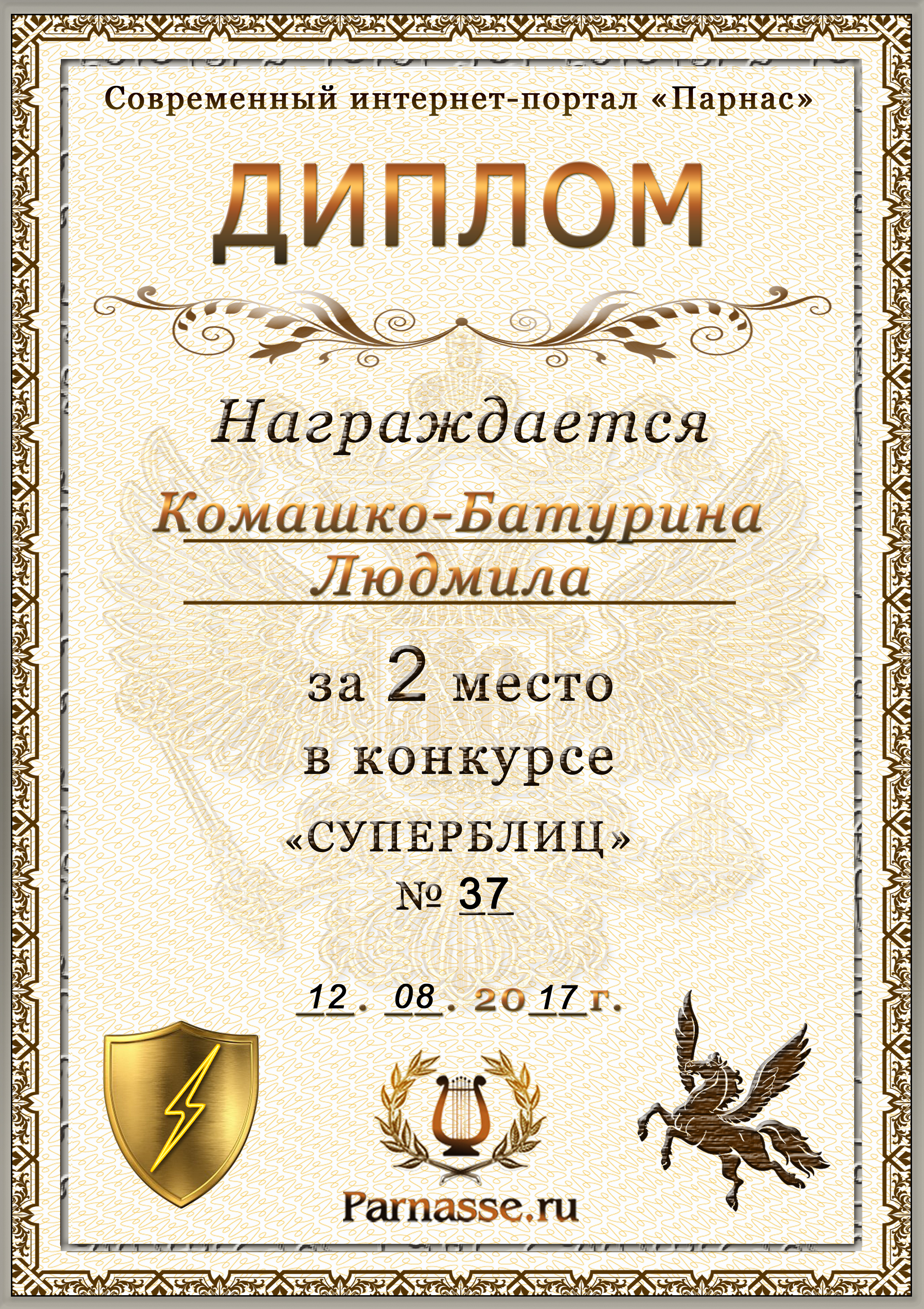 Диплом за 2 место во 2 туре в конкурсе СУПЕРБЛИЦА № 27!ПОЗДРАВЛЯЮ!
