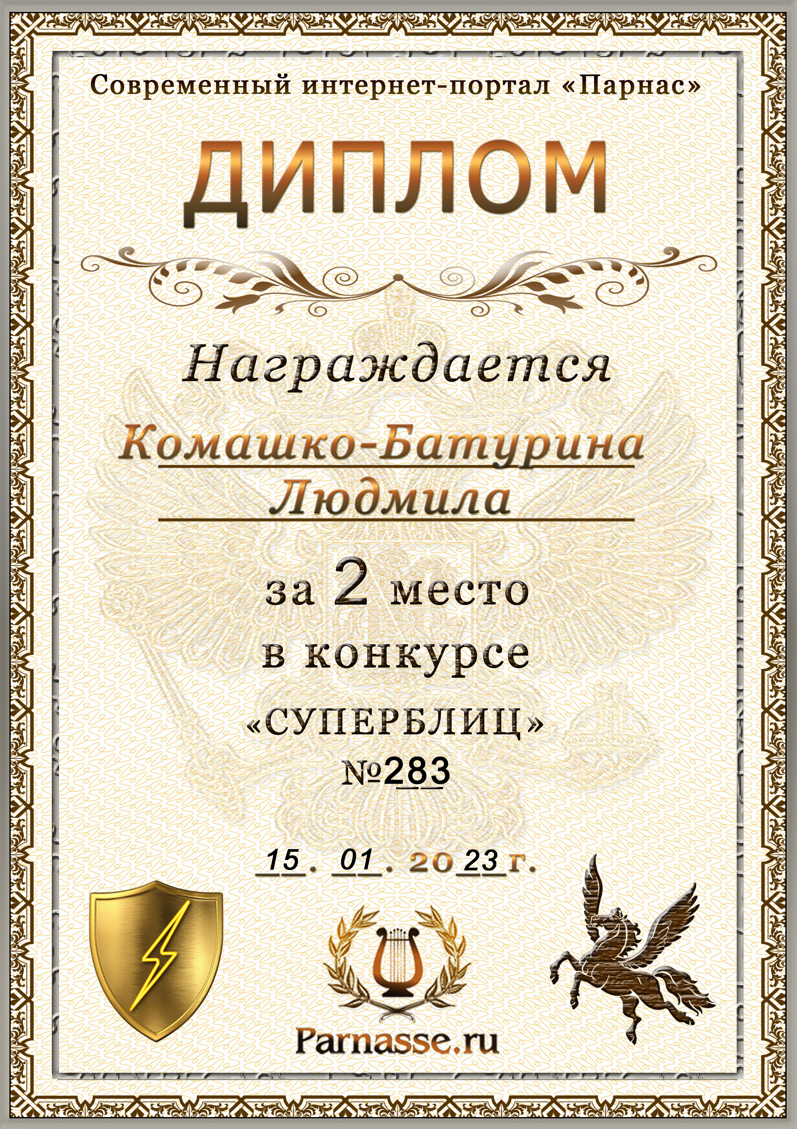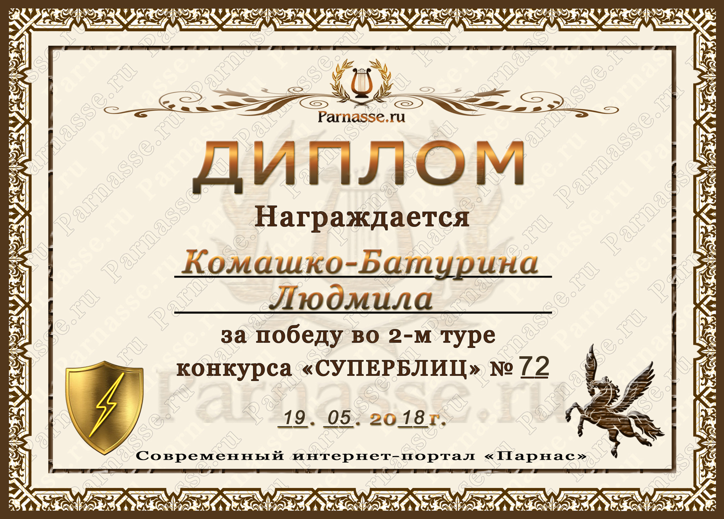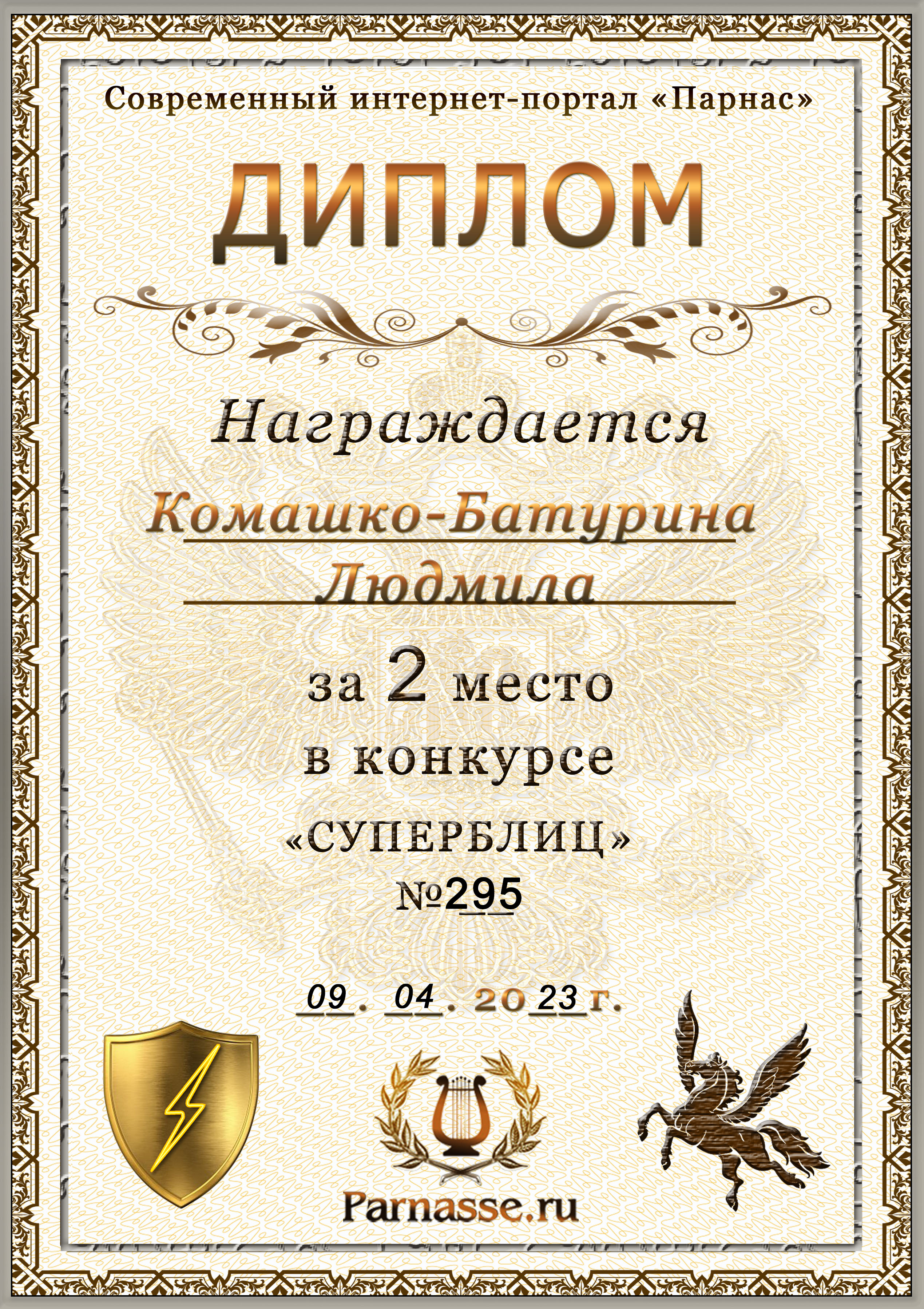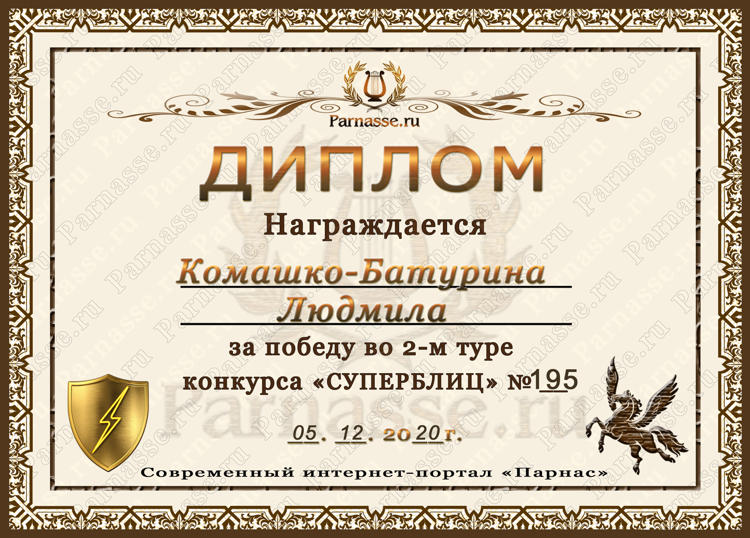 Диплом за 2 место во 2 туре в конкурсе СУПЕРБЛИЦА № 27!ПОЗДРАВЛЯЮ!
