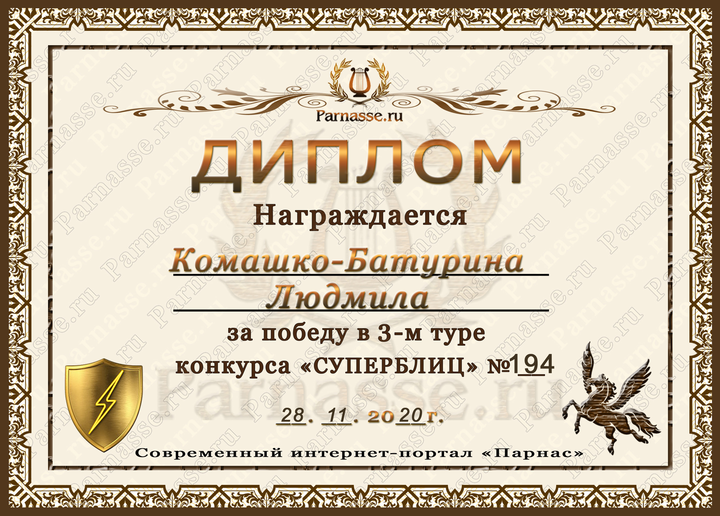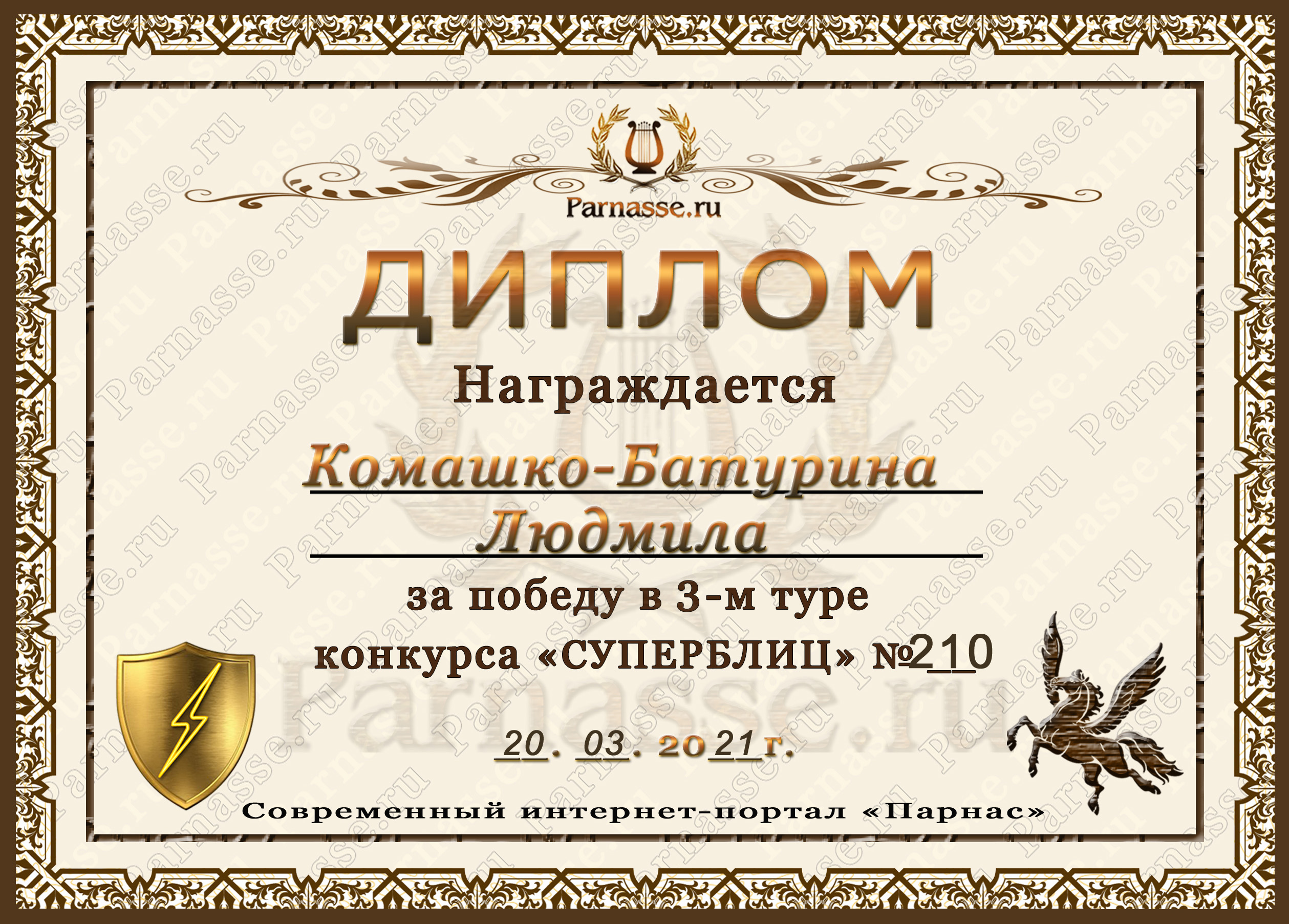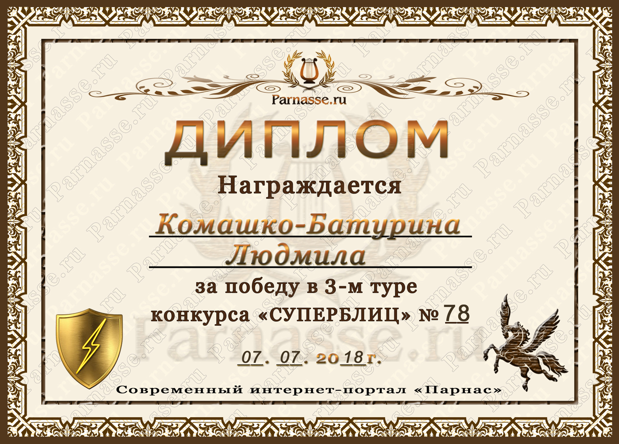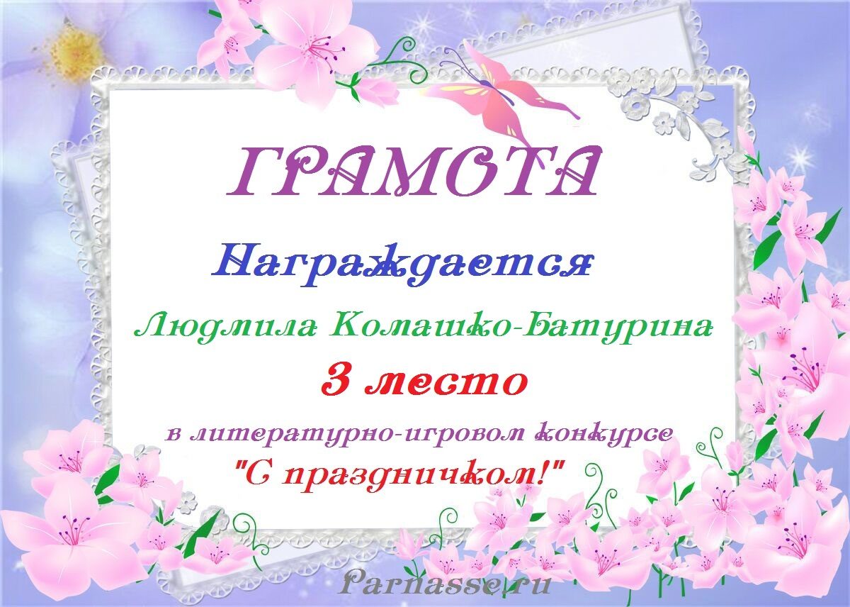 Диплом Победителя за 1 место в праздничном конкурсе "Поздравим Парнас с трёхлетием вместе!"