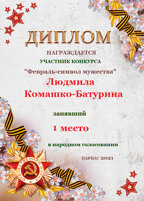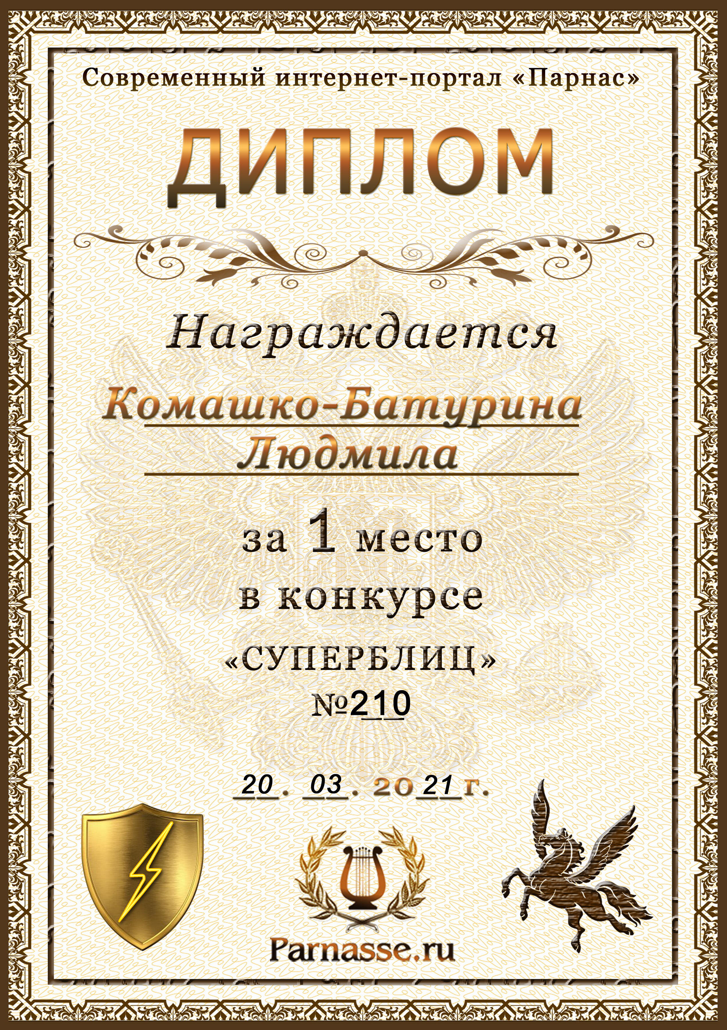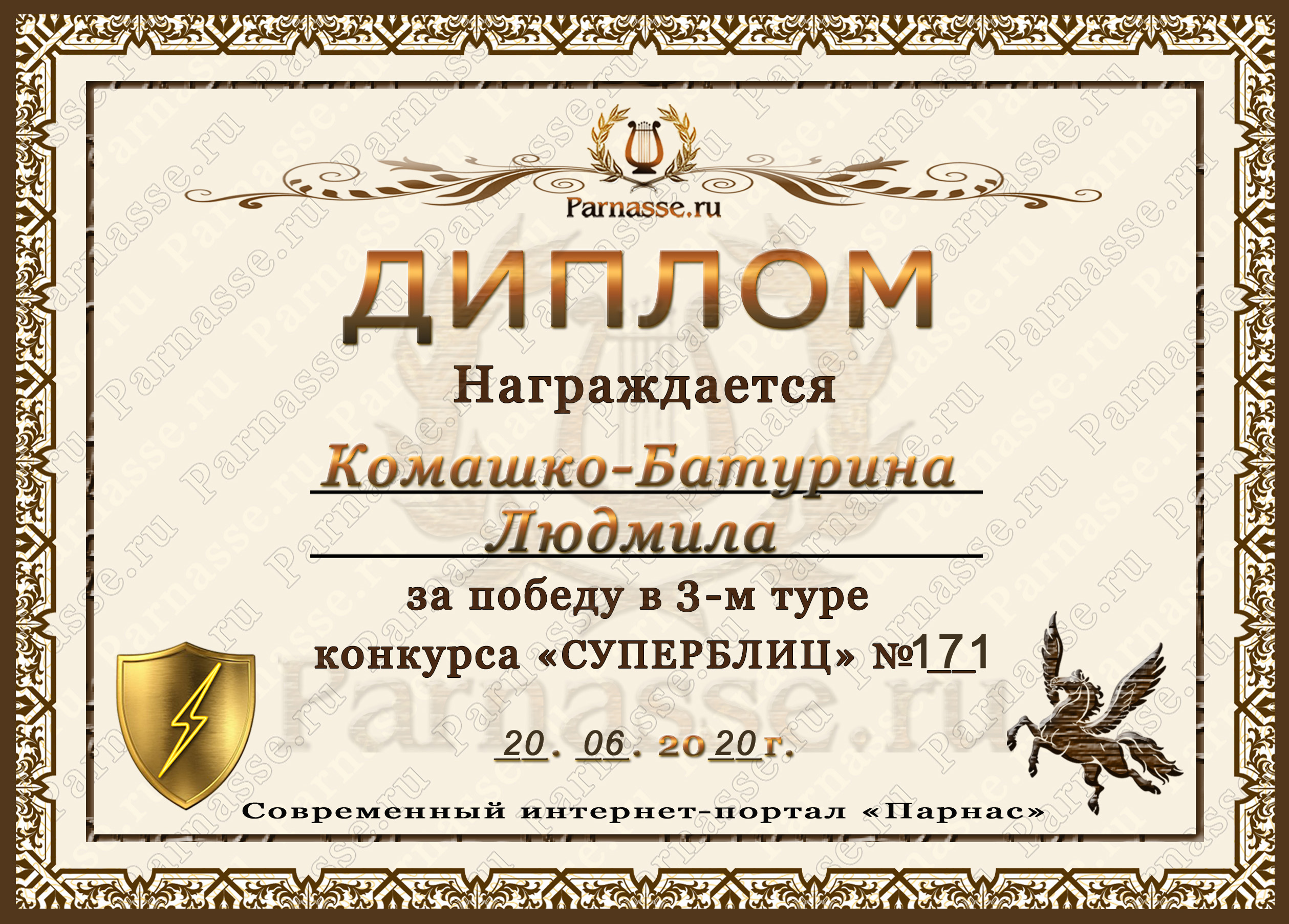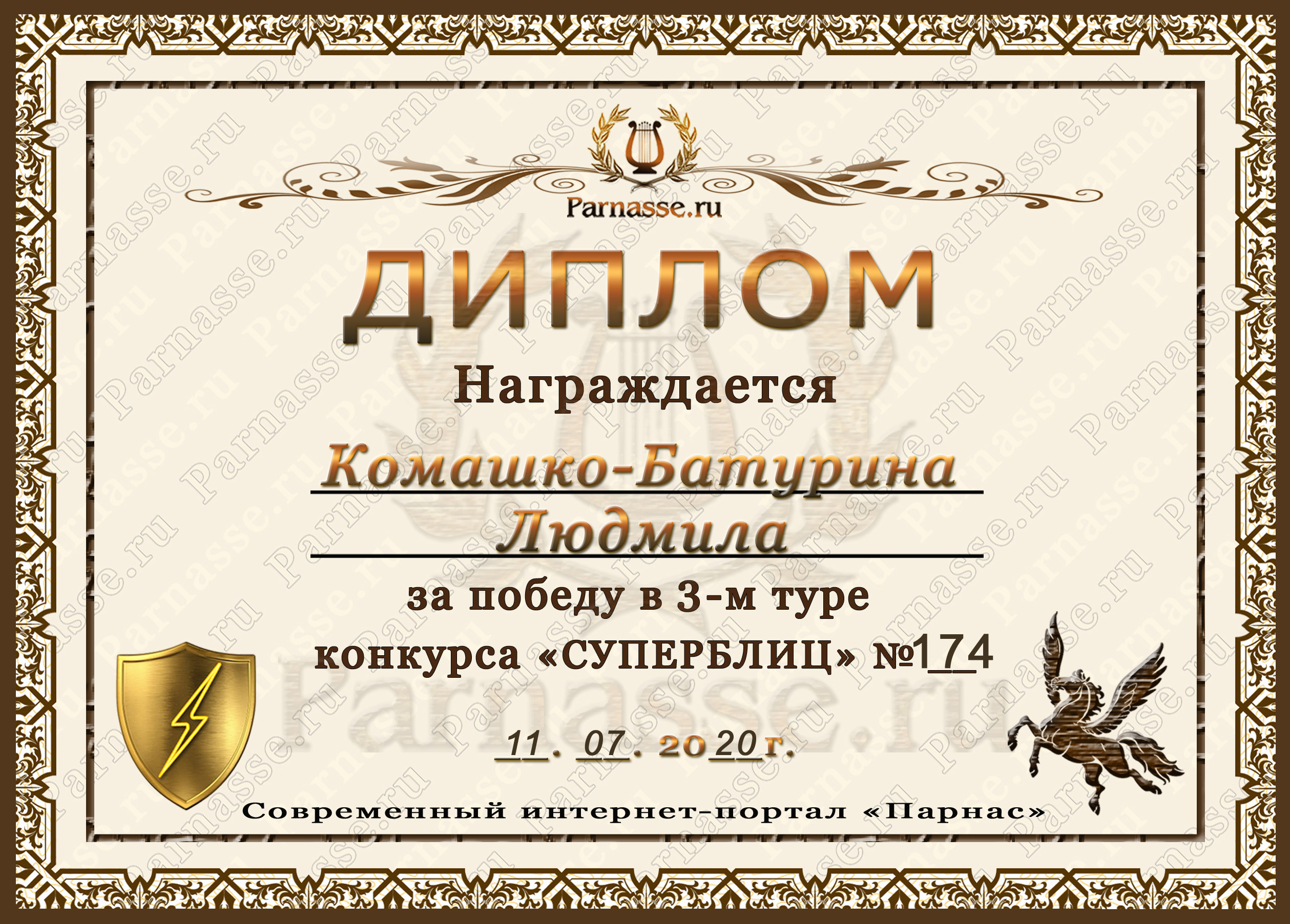 Диплом Победителя за 1 место в праздничном конкурсе "Поздравим Парнас с трёхлетием вместе!"