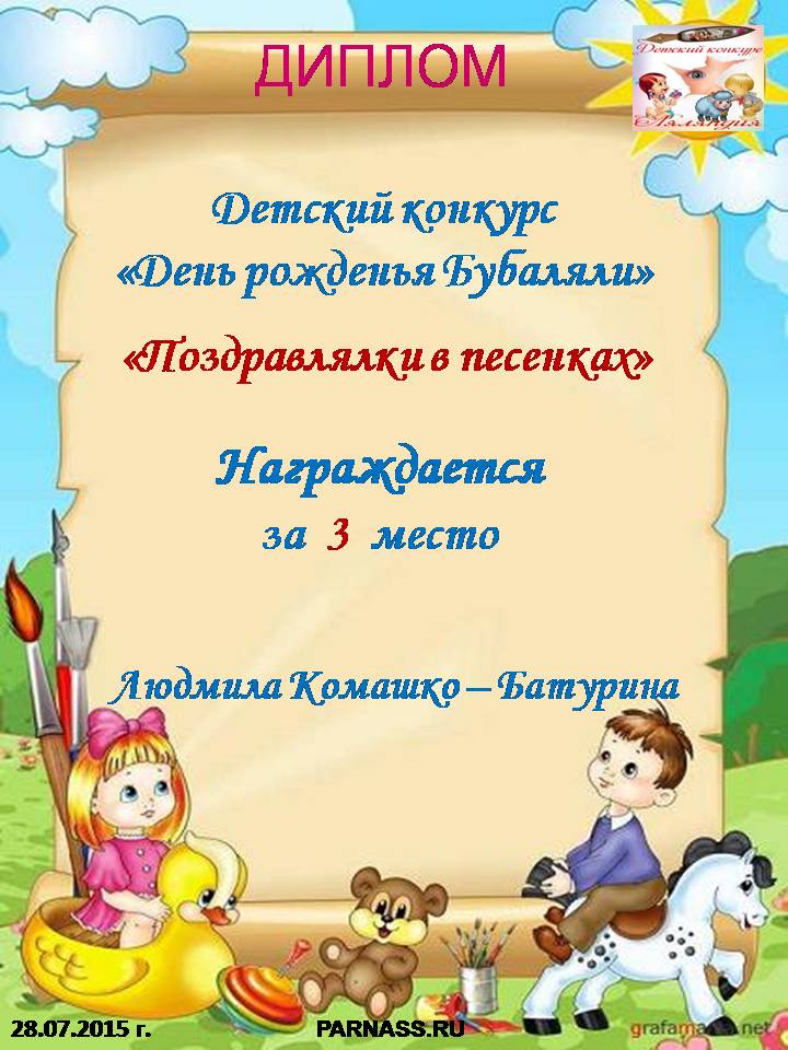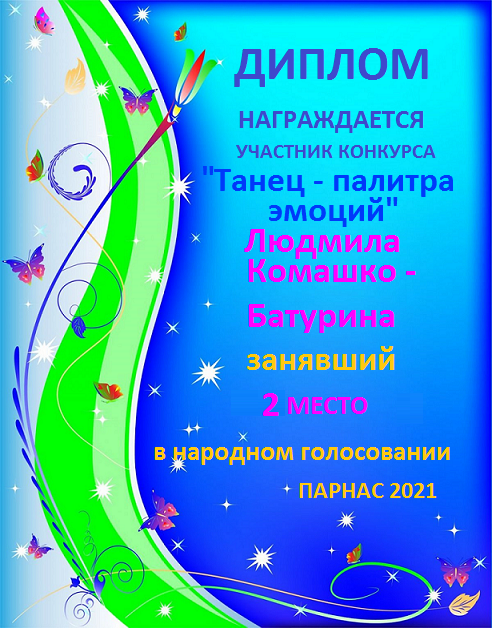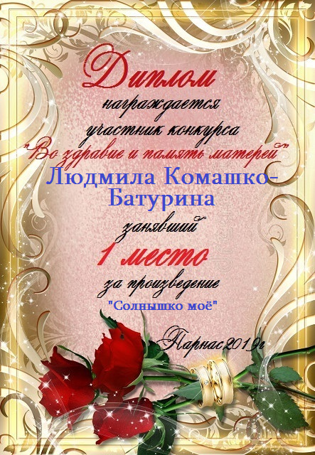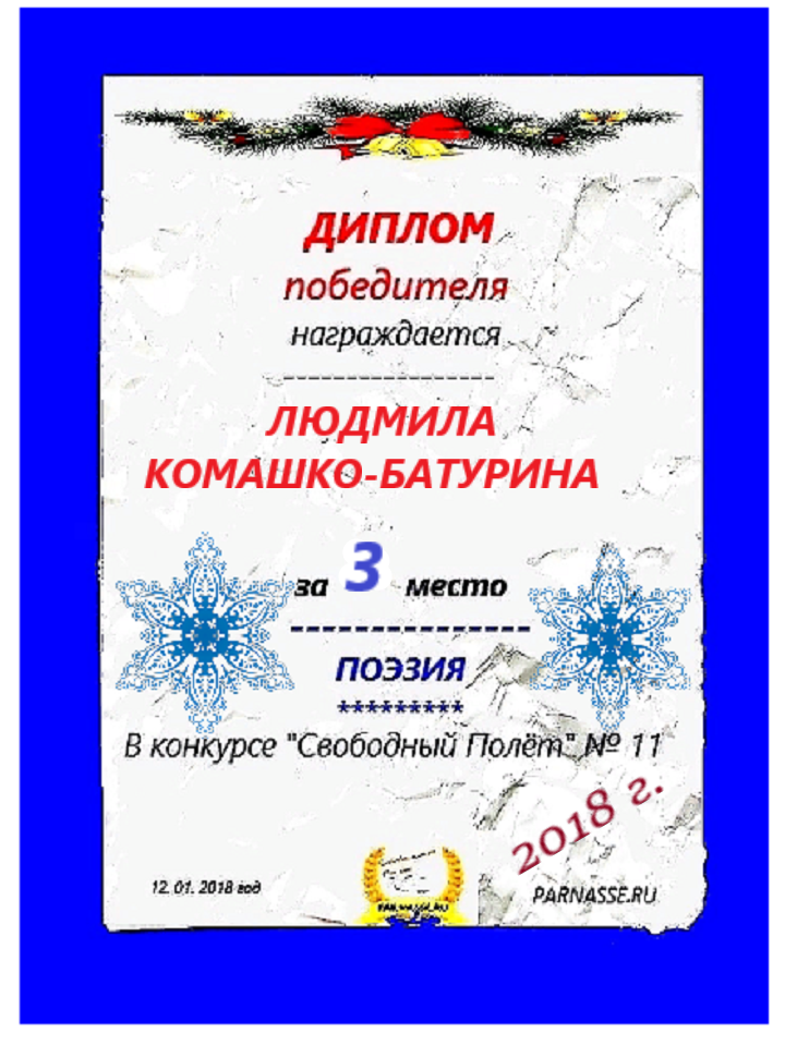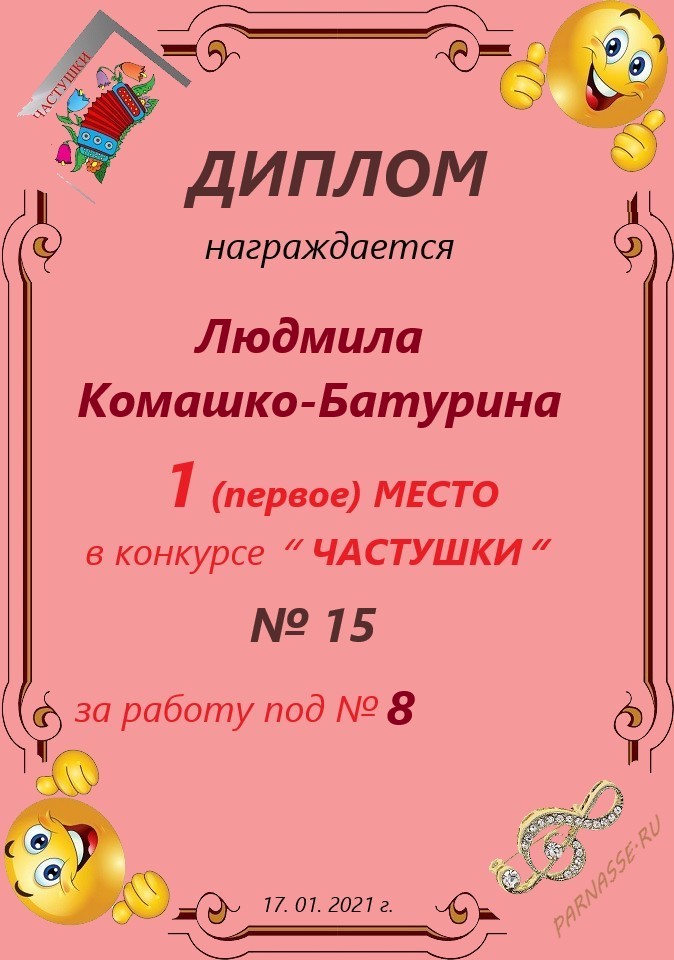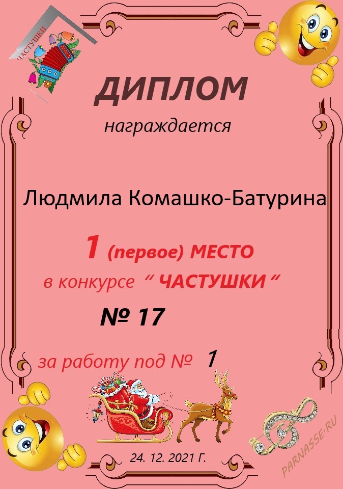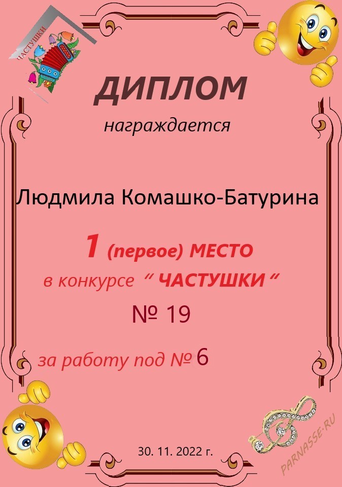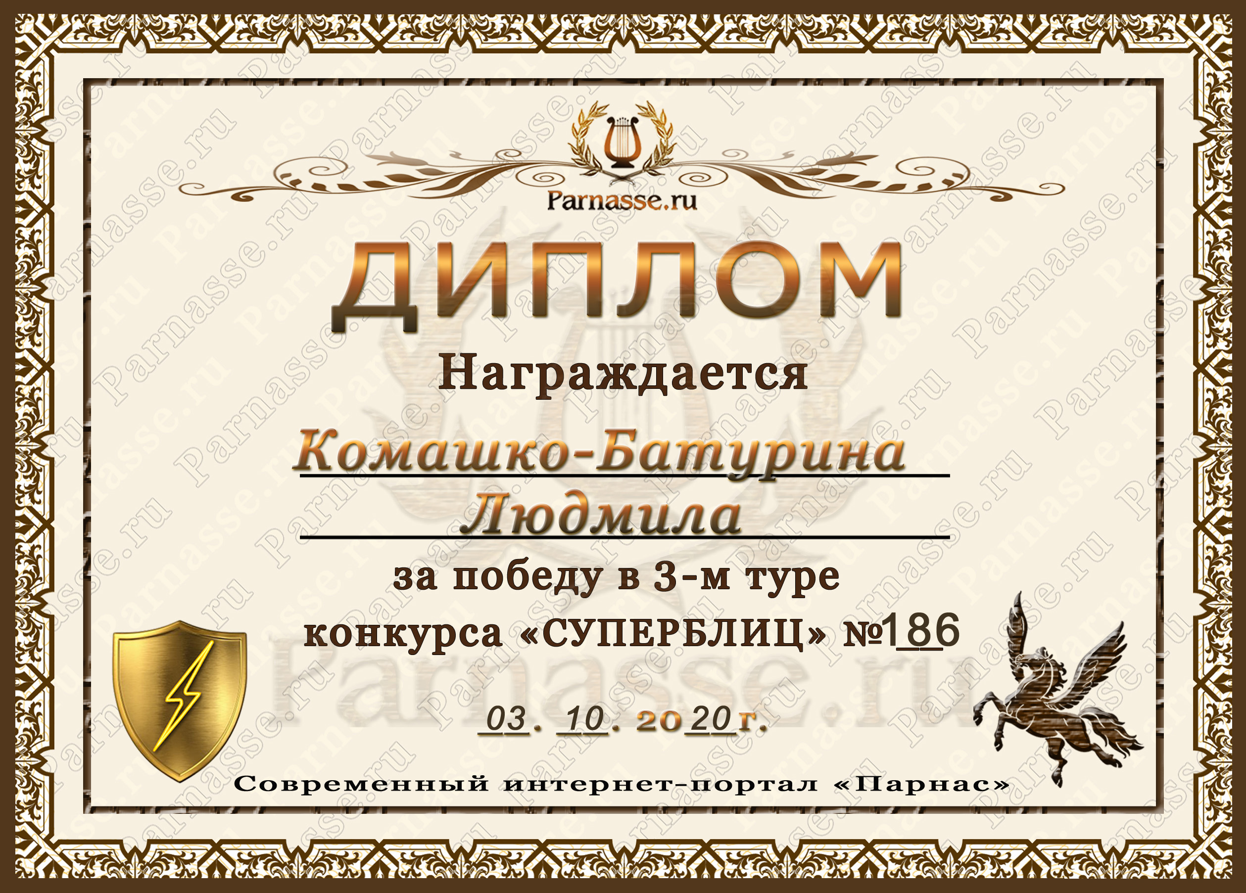 Диплом Победителя за 1 место в праздничном конкурсе "Поздравим Парнас с трёхлетием вместе!"
