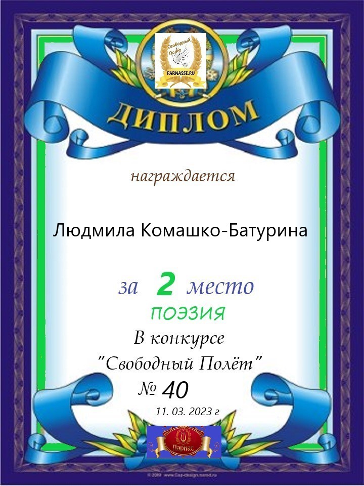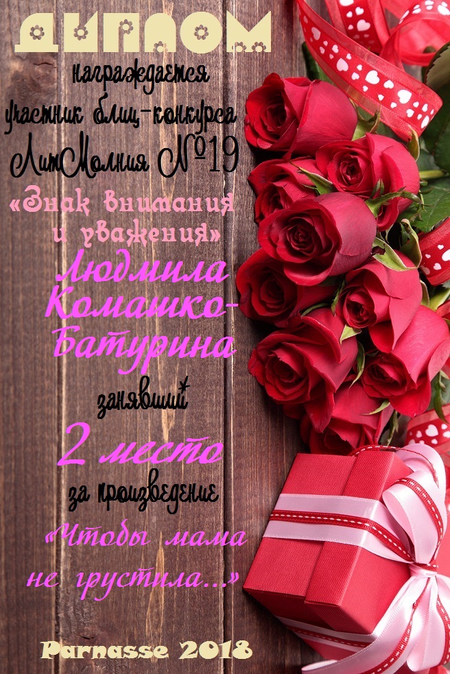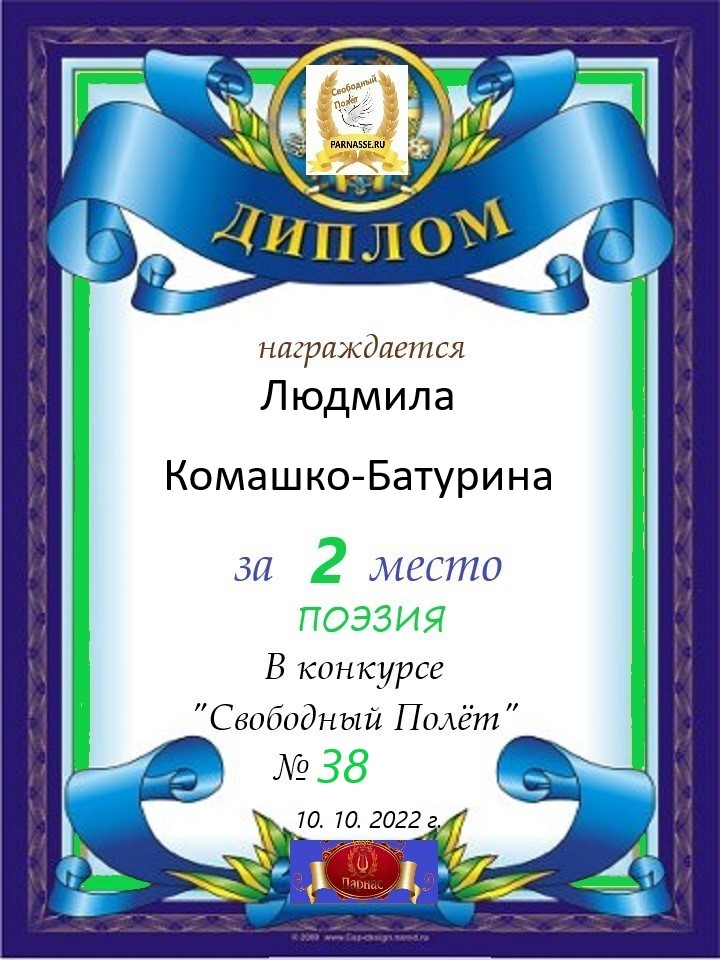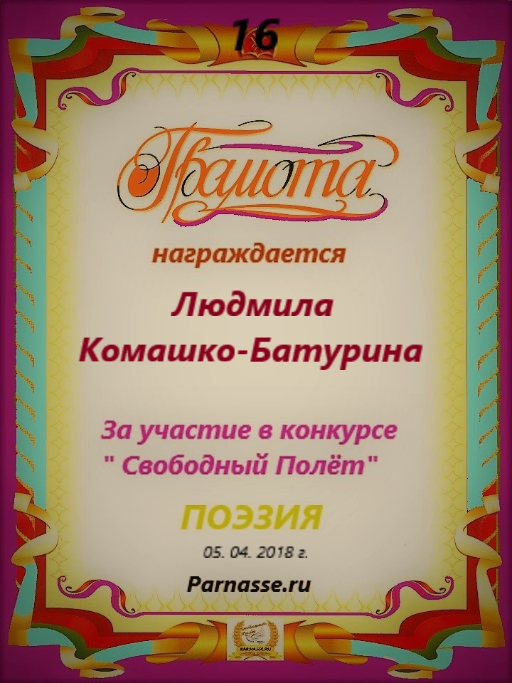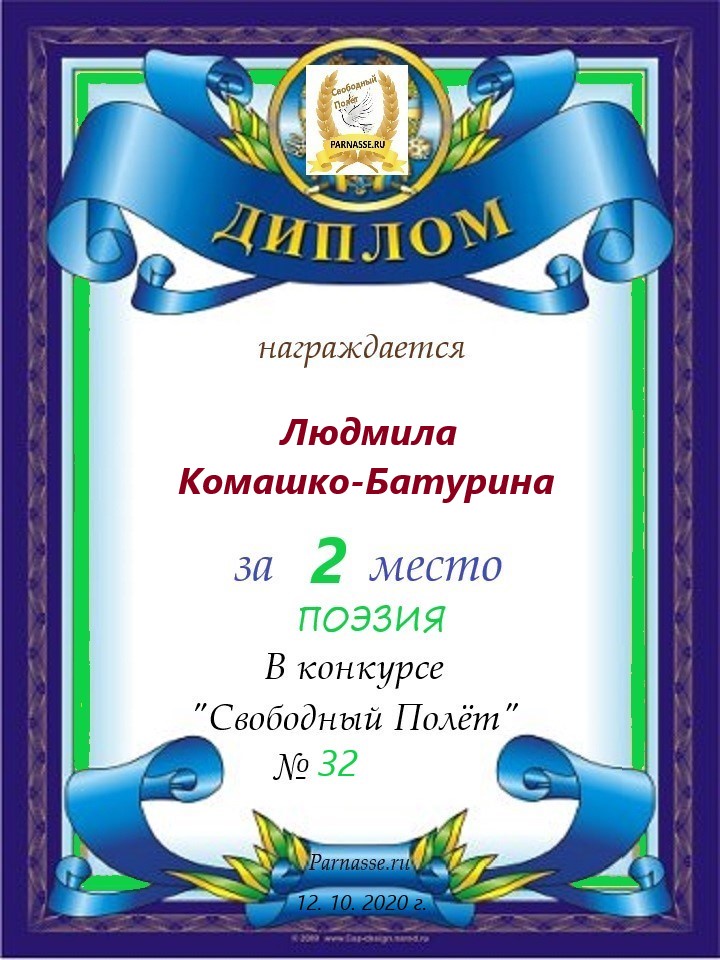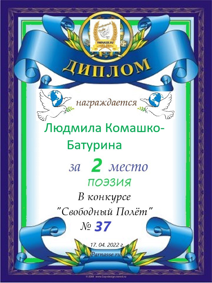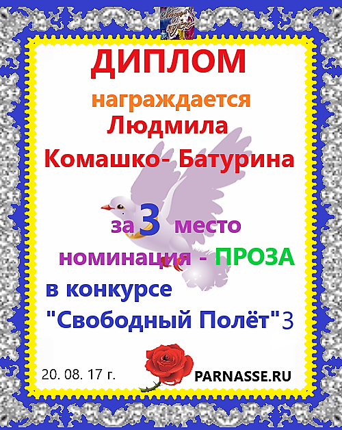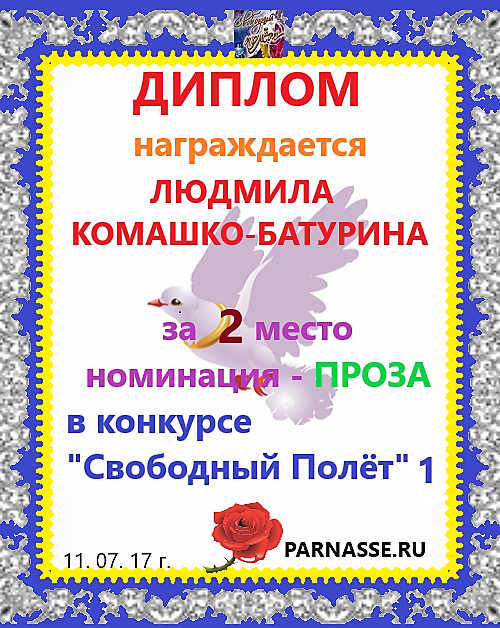 Диплом за 2 место "Полёт № 16", номинация - проза. Желаю новых творческих побед!