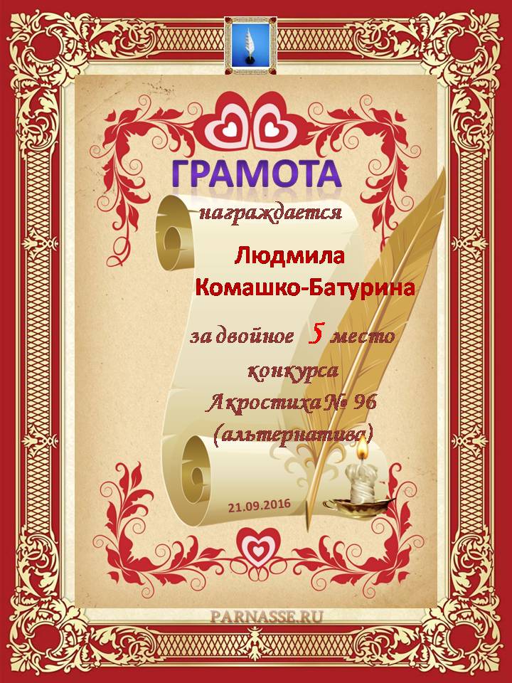 Грамота за двойное 5 место в 96 конкурсе АКРОСТИХА (Альтернатива)! ПОЗДРАВЛЯЮ!