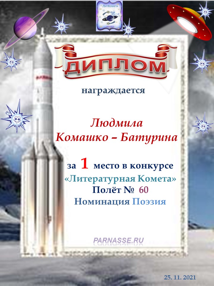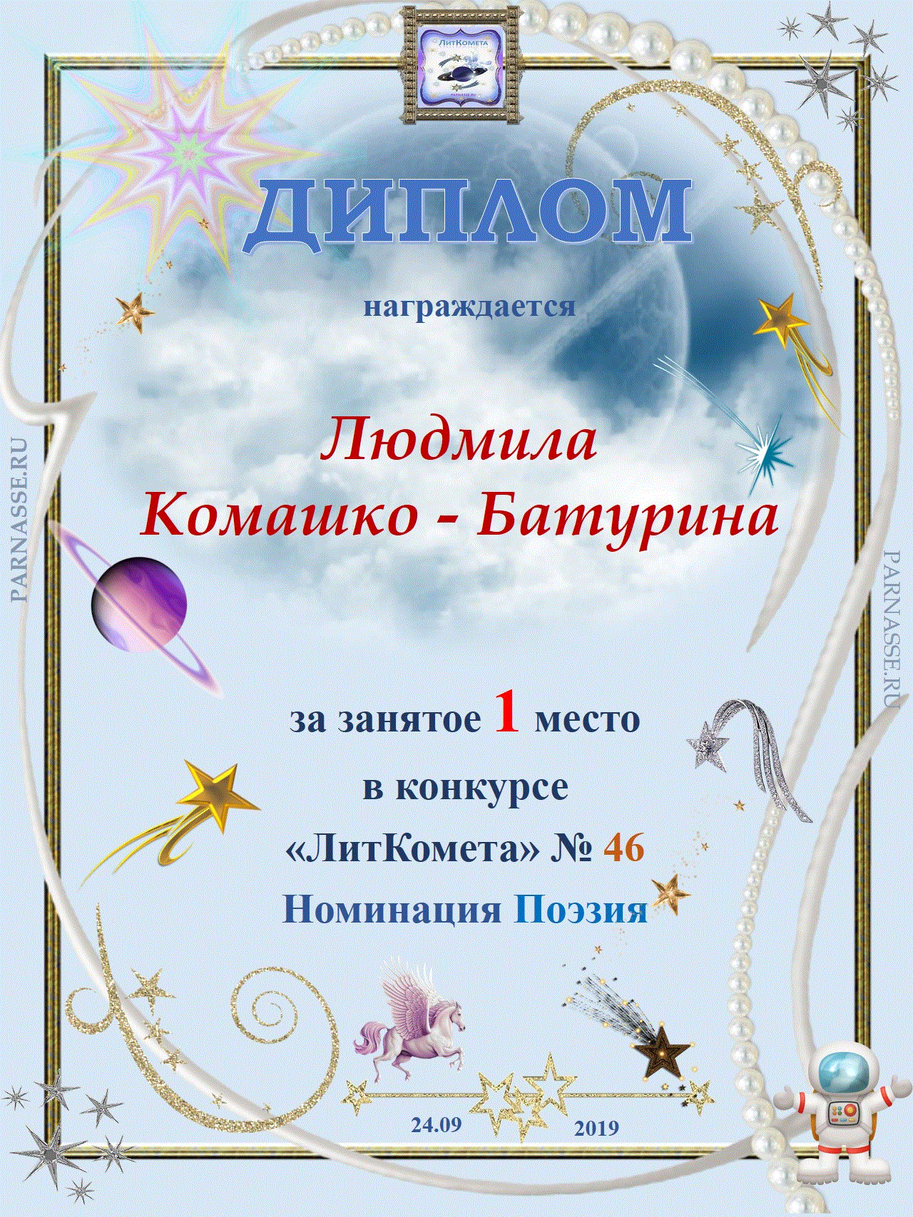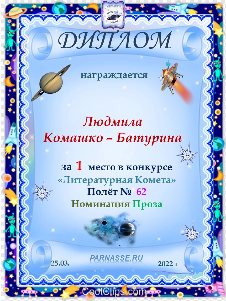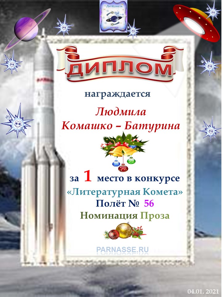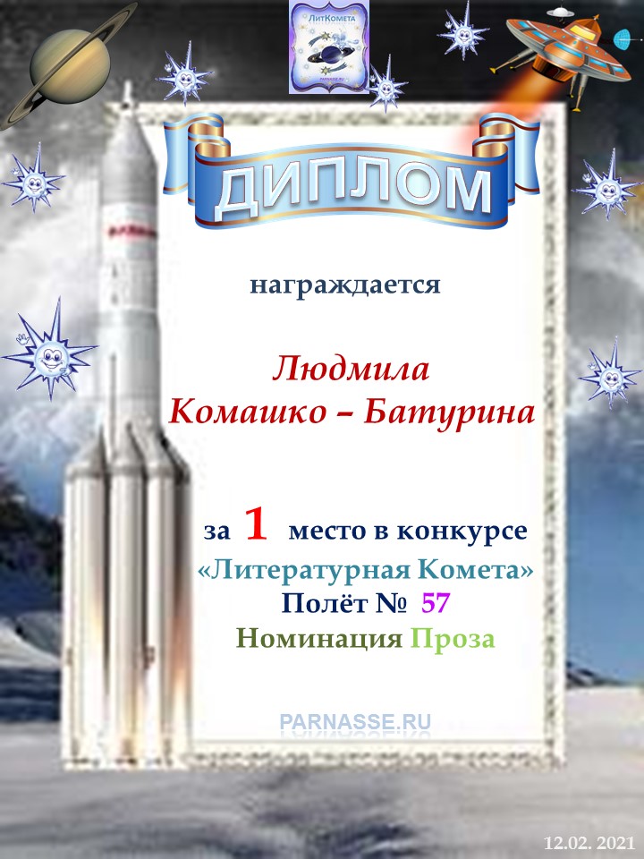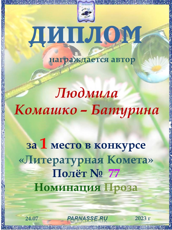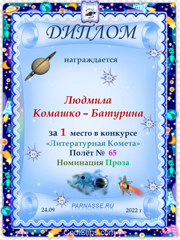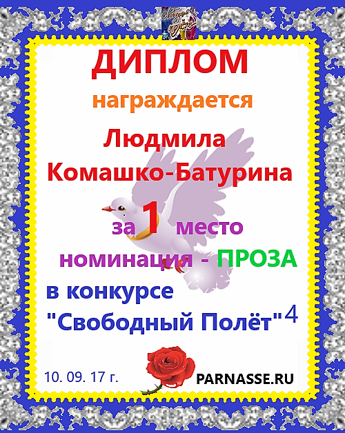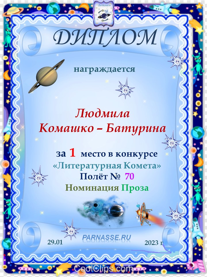 Диплом за 1 место в конкурсе "ЛитКомета"- Полёт № 9 - проза