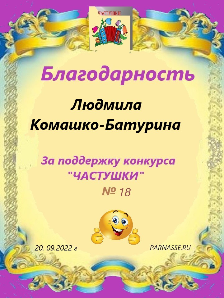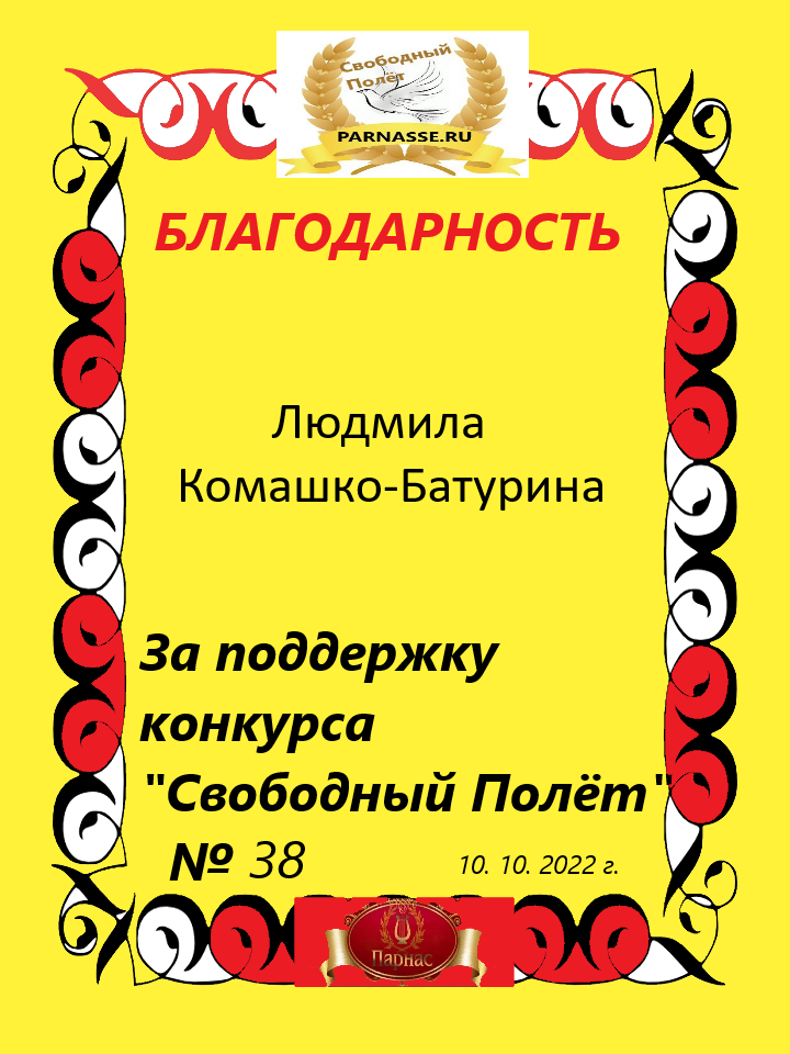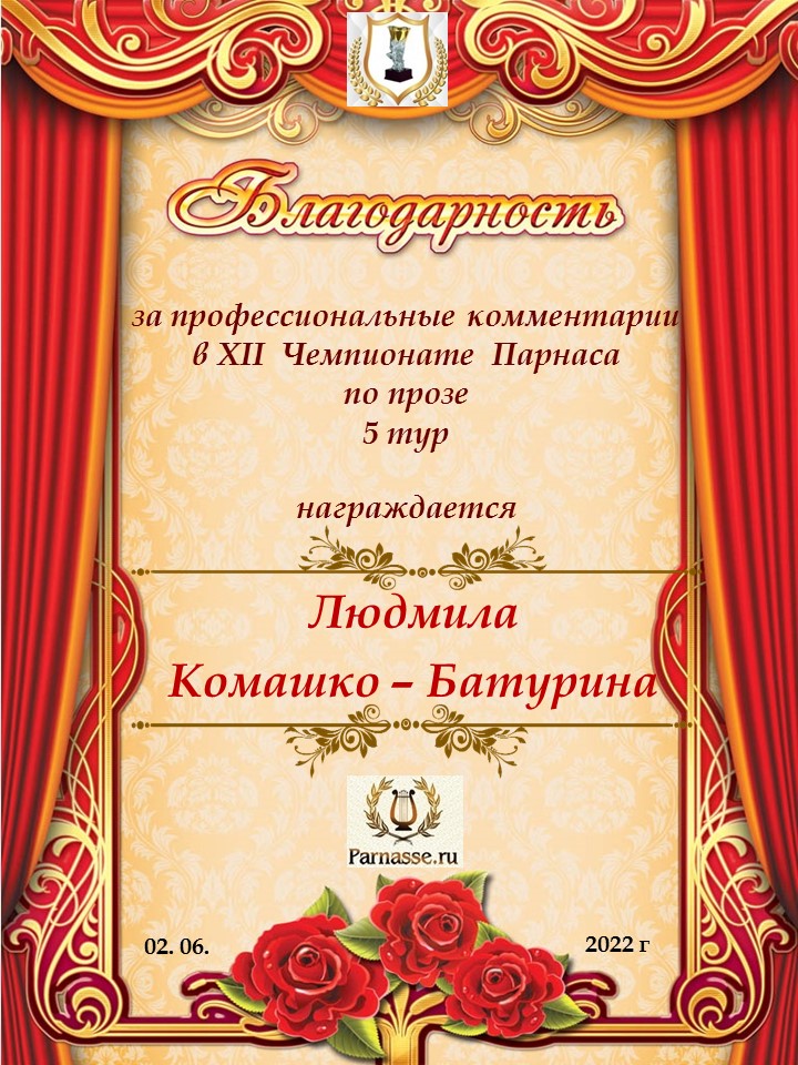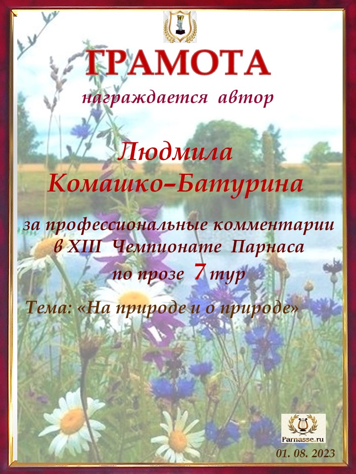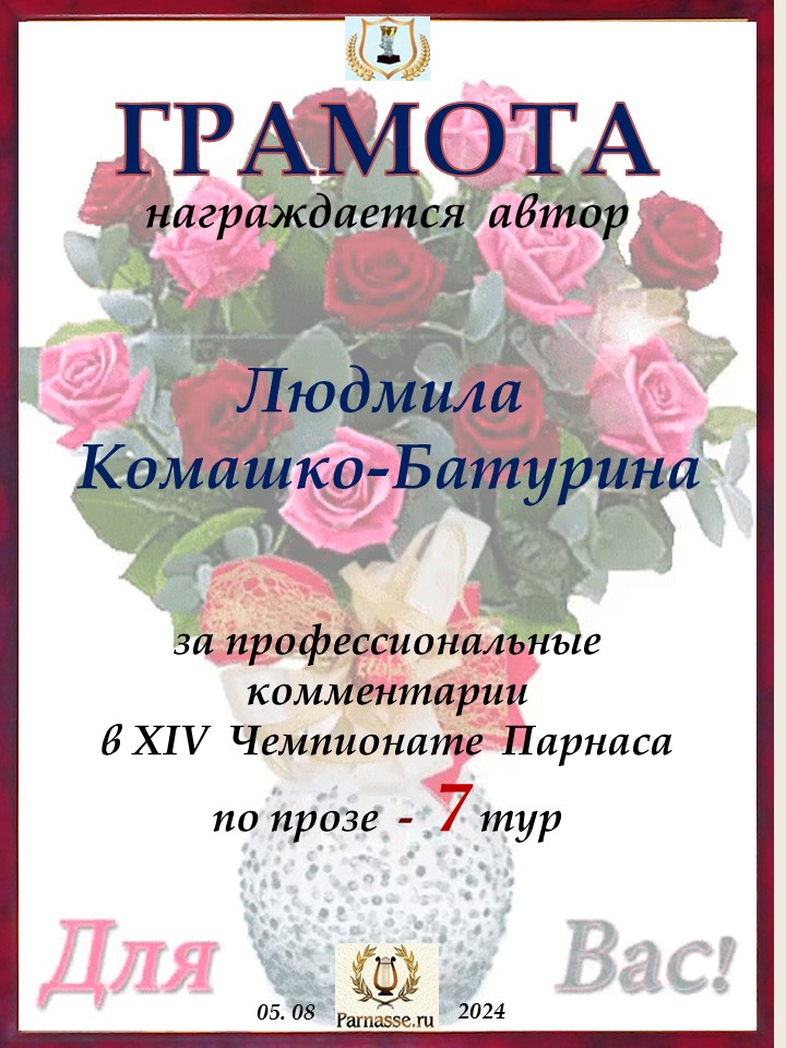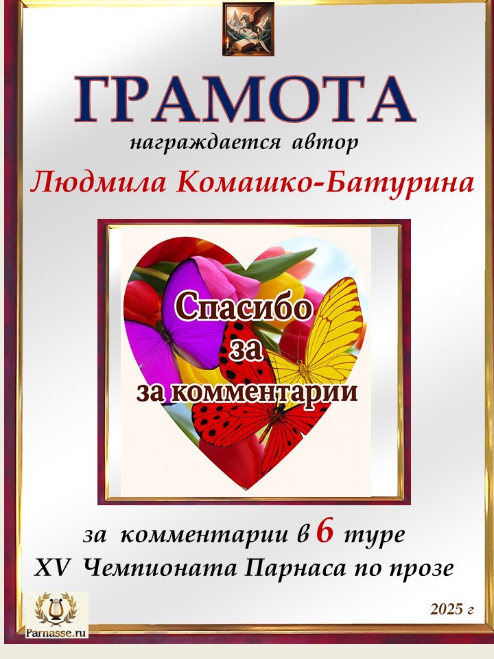 Спасибо за активную поддержку Седьмого Чемпионата по прозе! Вы не только украшали его своими произведениями, но и многочисленными комментариями, а это очень важно!Спасибо Вам, Людмила!