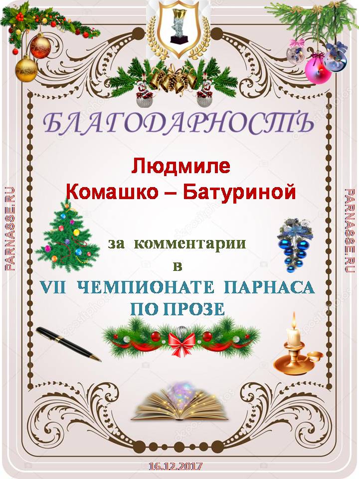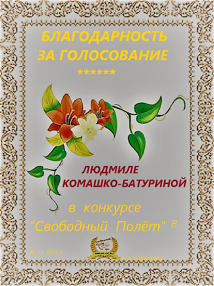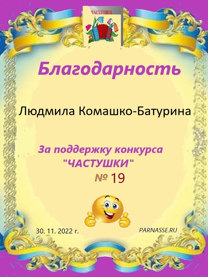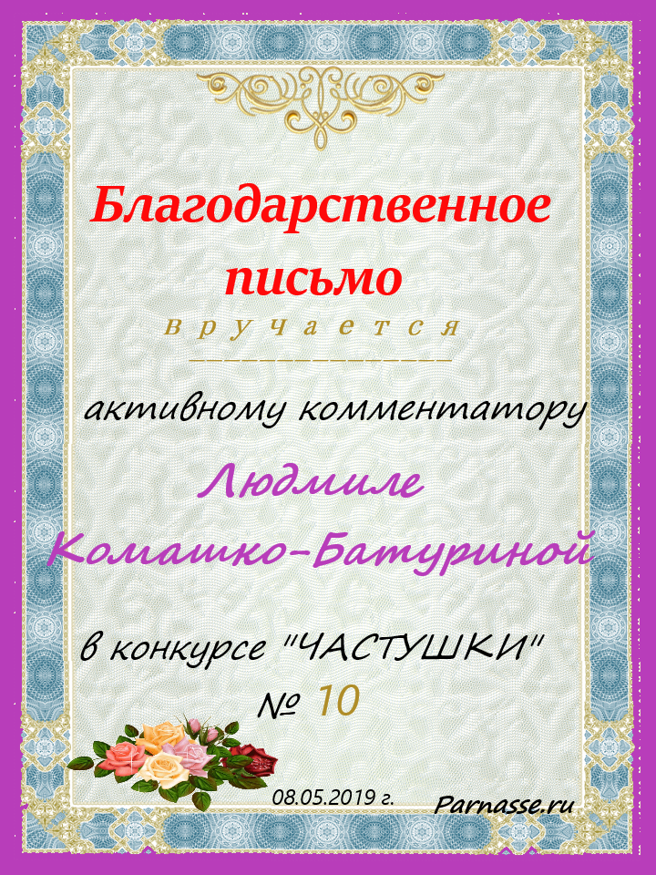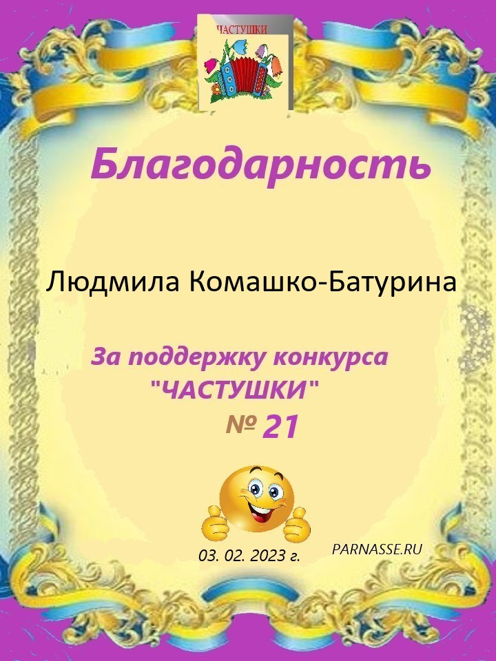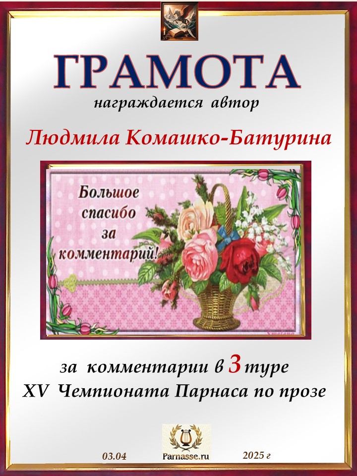 Спасибо за активную поддержку Седьмого Чемпионата по прозе! Вы не только украшали его своими произведениями, но и многочисленными комментариями, а это очень важно!Спасибо Вам, Людмила!