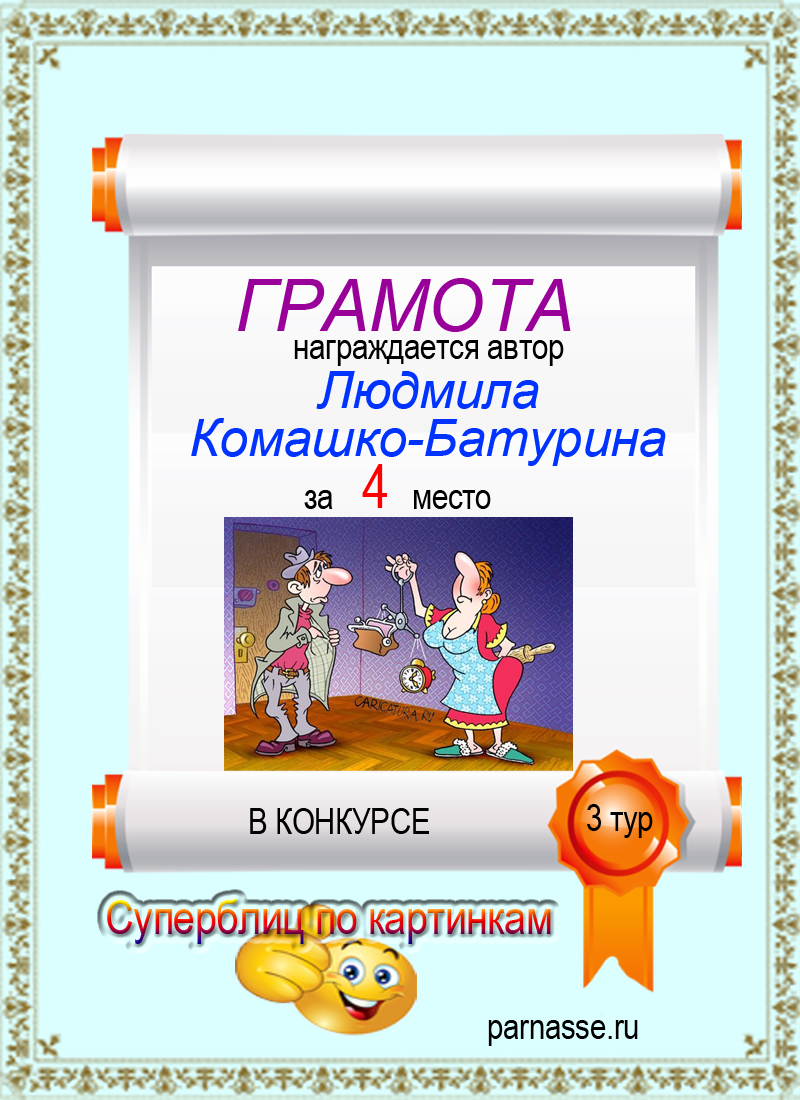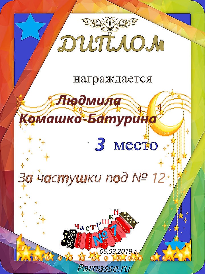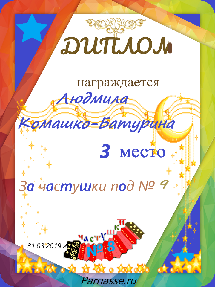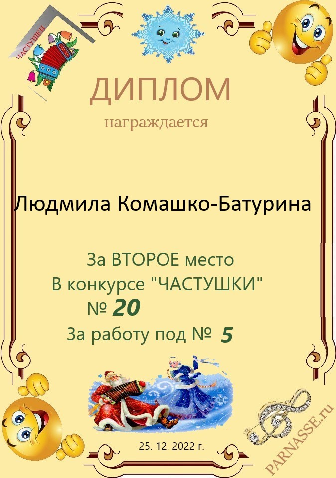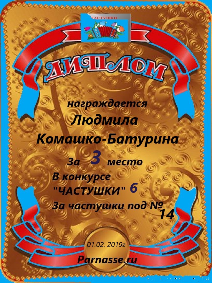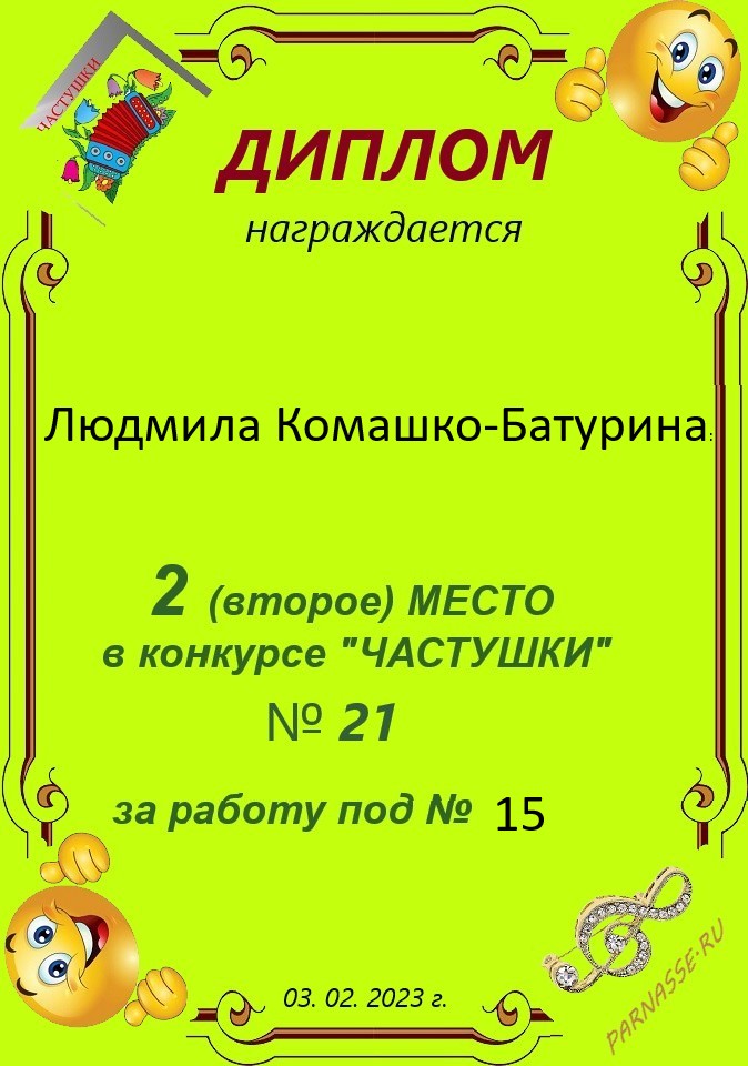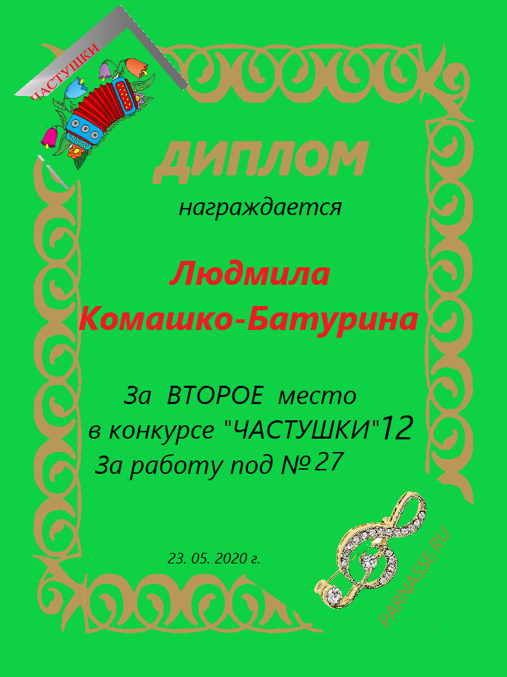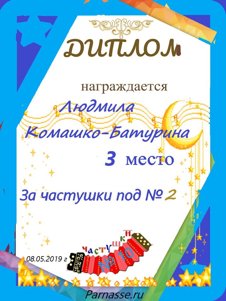 Диплом за 2 место в 3 туре (частушки) в конкурсе СУПЕРБЛИЦА № 27!ПОЗДРАВЛЯЮ!