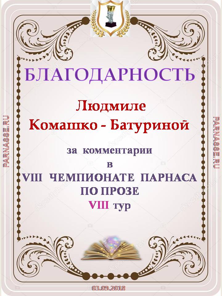 ![]() Медаль комментатора в 8 туре XV Чемпионата Парнаса по прозе