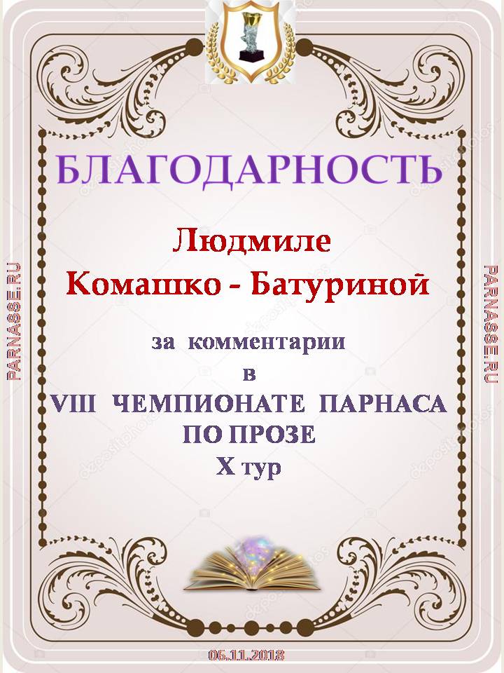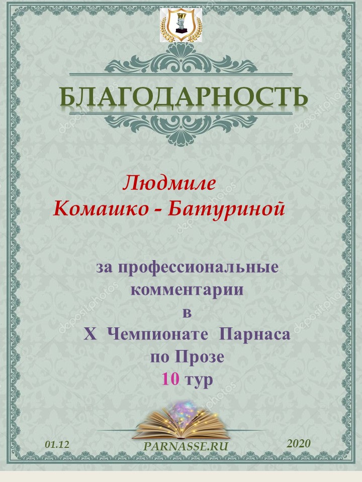 ![]() Медаль комментатора в 10 туре XV Чемпионата Парнаса по прозе