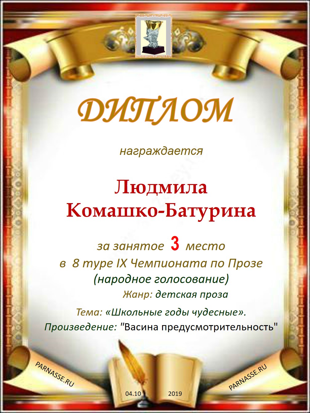 ![]() Медаль за 3 место в 8 туре XV Чемпионата Парнаса по прозе