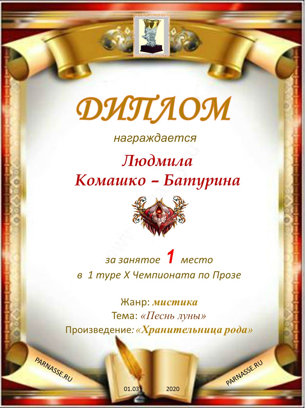 ![]() Медаль за 1 место в 6 туре XV Чемпионата Парнаса по прозе
