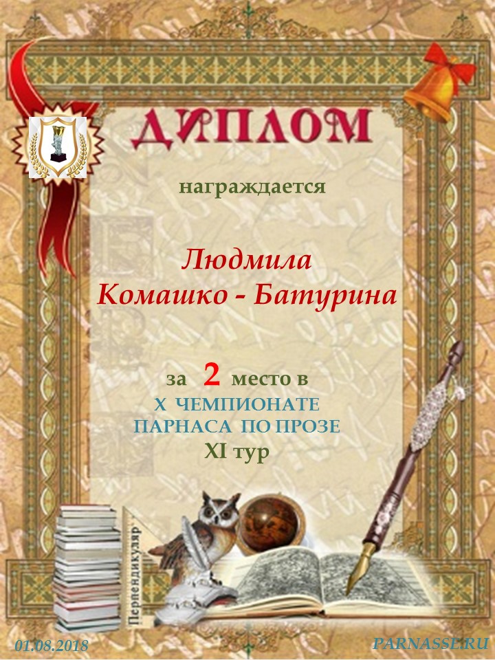 Вручается медаль за 2 место в 11 туре XV Чемпионата Парнаса по прозе