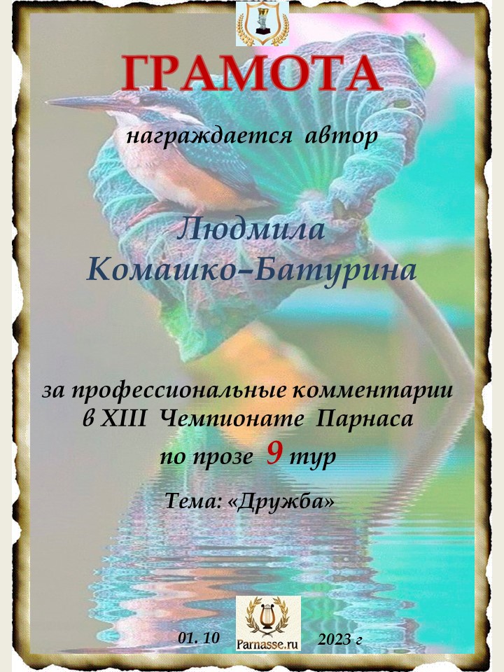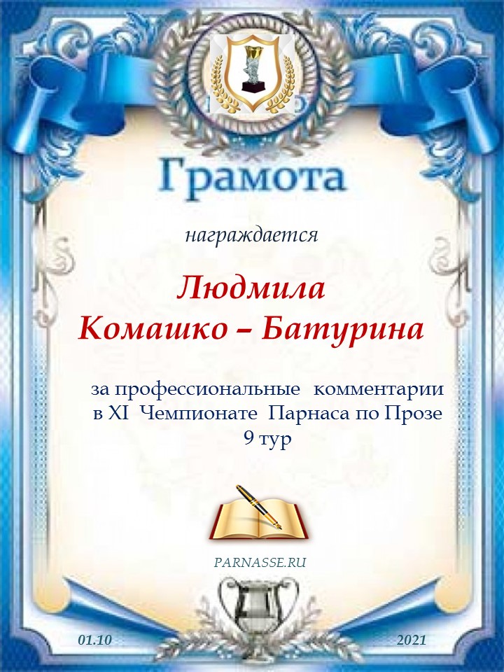 ![]() Медаль комментатора в 9 туре XV Чемпионата Парнаса по прозе
