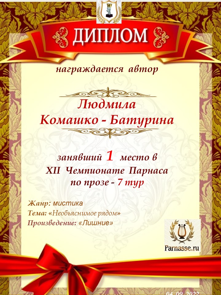 Поздравляю с 1 местом в номинации - Проза! Спасибо за Ваше творчество!