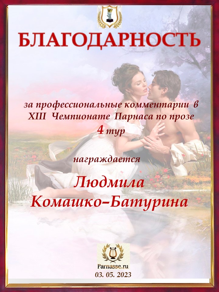 ![]() Медаль активного комментатора в 4 туре XV Чемпионата Парнаса по прозе