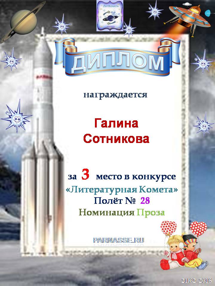 Поздравляю с 3 местом в конкурсе "ЛитКомета" Полёт № 28 - номинация Проза!