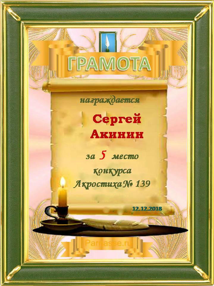 Грамота за 5 место в 140 конкурсе АКРОСТИХА (Альтернатива)! ПОЗДРАВЛЯЮ!