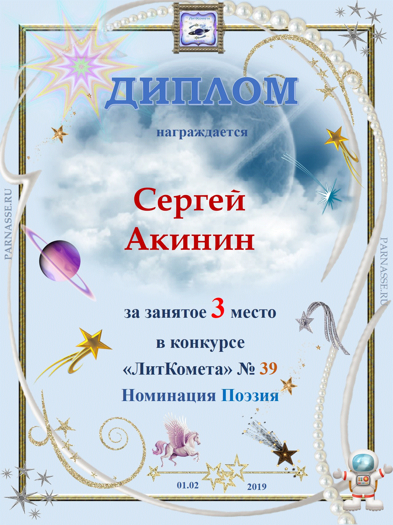 Поздравляю с занятым 3 местом в конкурсе "Литературная Комета - Полёт № 47" - Номинация Поэзия!