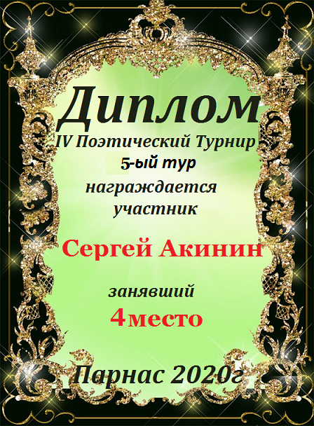 Шестое место в 4-м туре Четвёртого Поэтического Турнира «Добро и зло – две грани нашей жизни», за произведение «Добром на зло». Поздравляем!