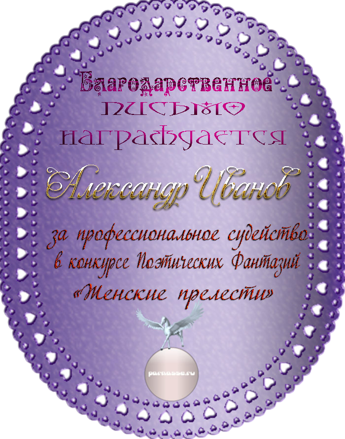 За неугасающую и неисчерпаемую творческую активность, постоянный контакт с Музой и признание сообществом "Парнасцев".От всей души желаем Вам, Александр, здоровья, любви, успехов, благополучия, удачи и творческого вдохновения!
