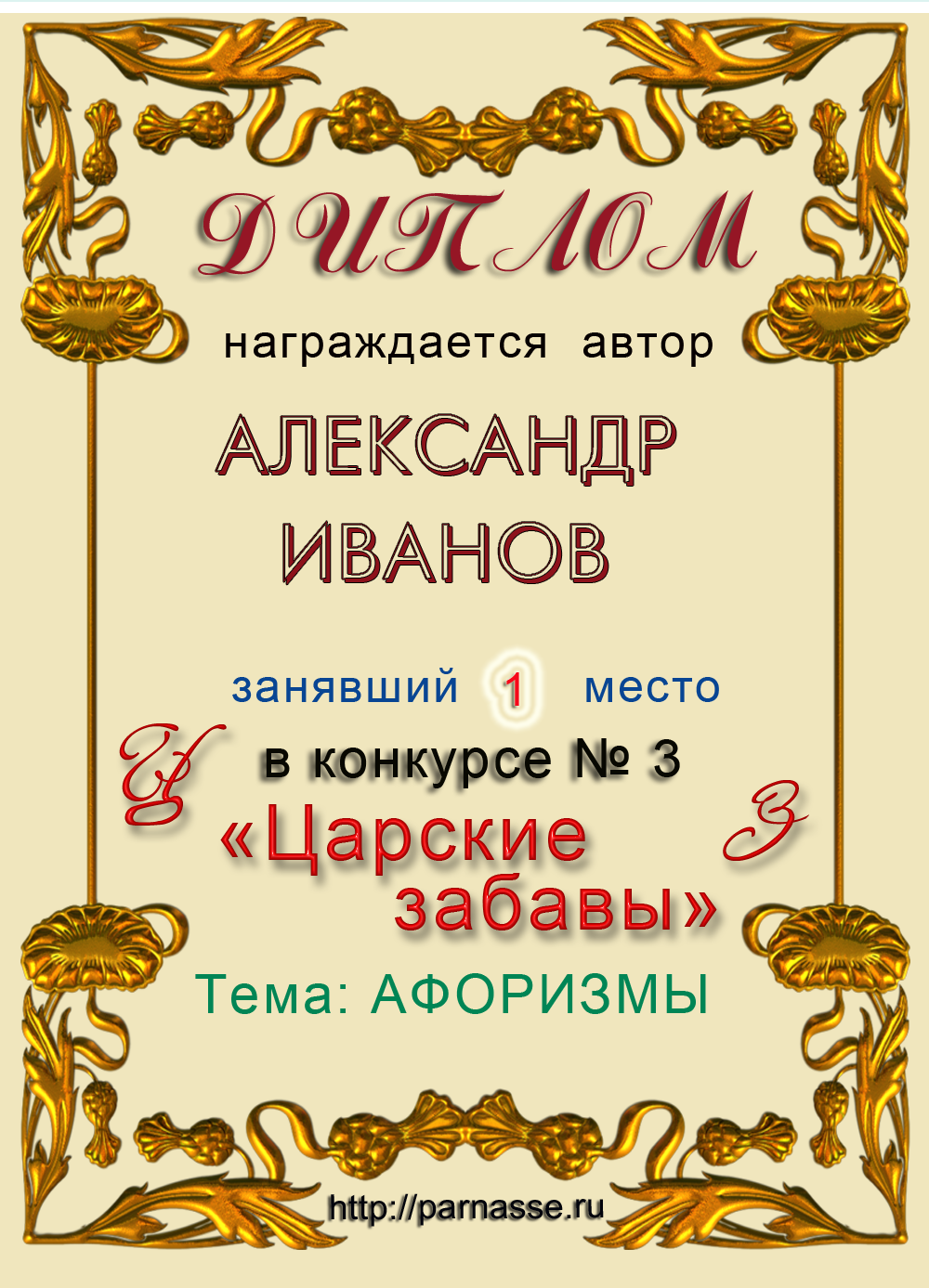 ![]() Золотая Медаль "Гордость и Надежда Парнаса"