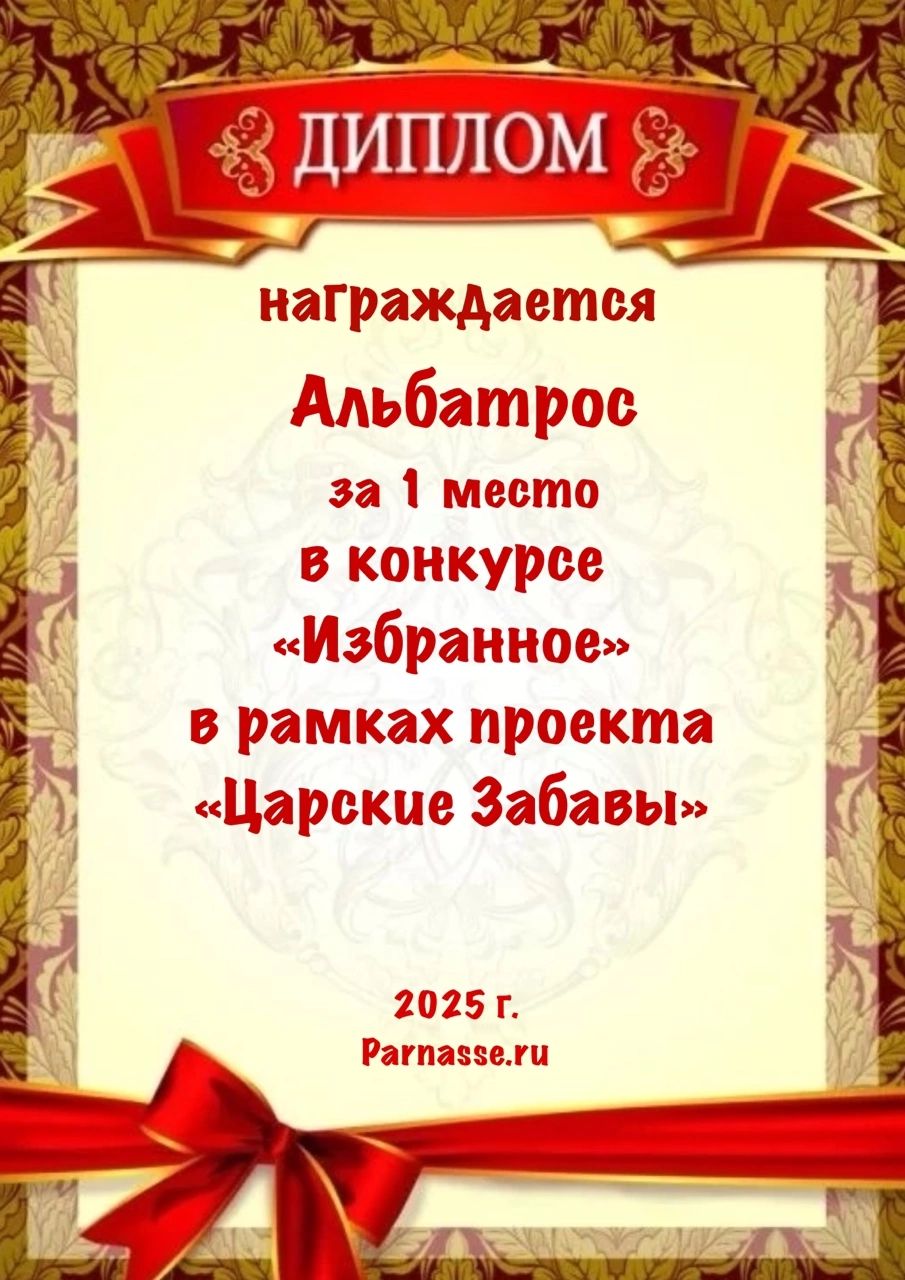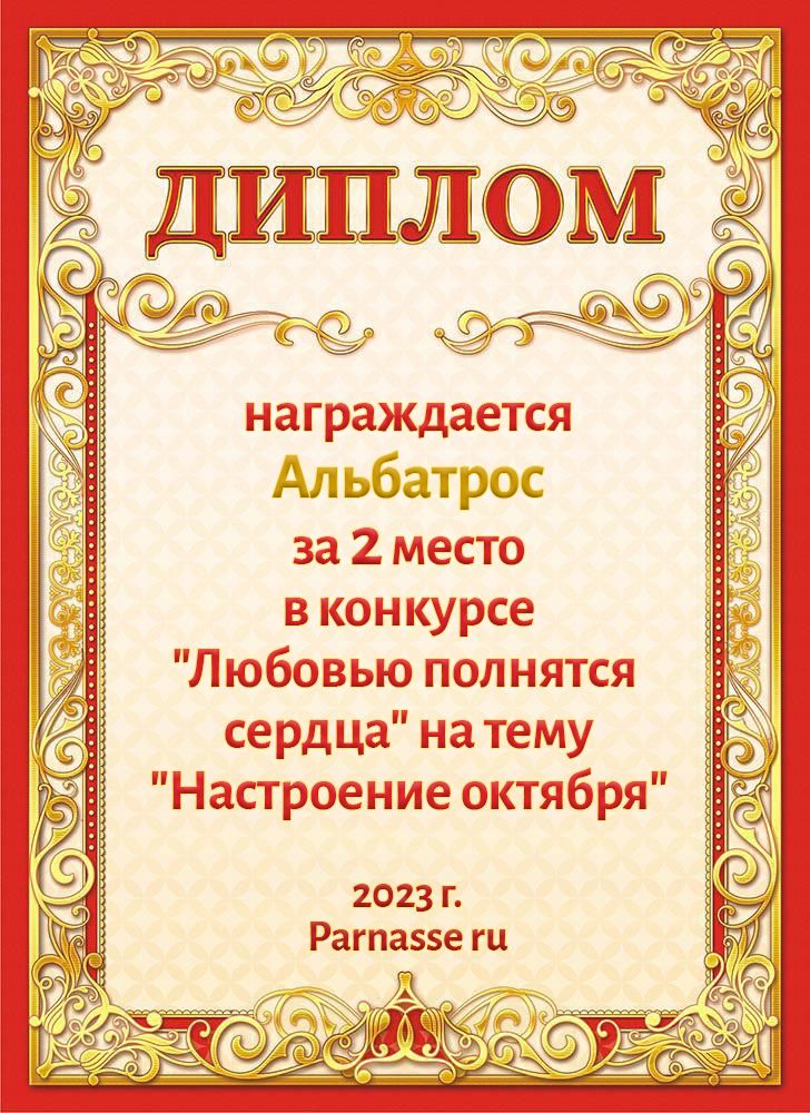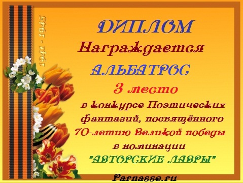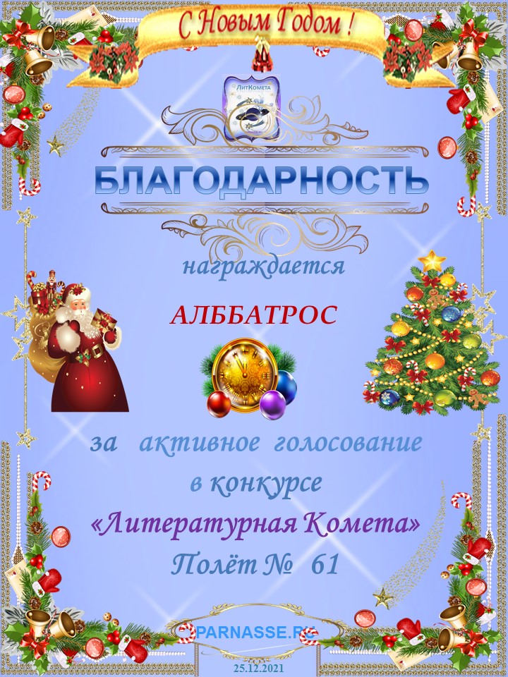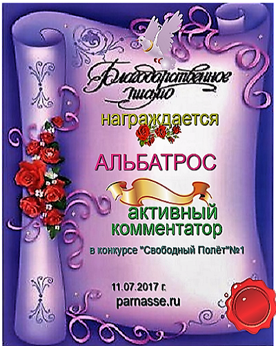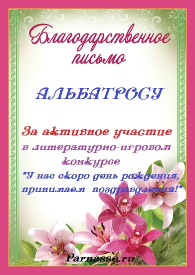 За неугасающую и неисчерпаемую творческую активность, постоянный контакт с Музой и признание сообществом "Парнасцев".От всей души желаем Вам, Александр, здоровья, любви, успехов, благополучия, удачи и творческого вдохновения!