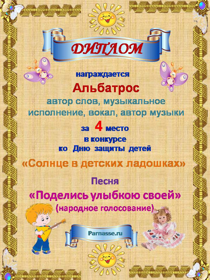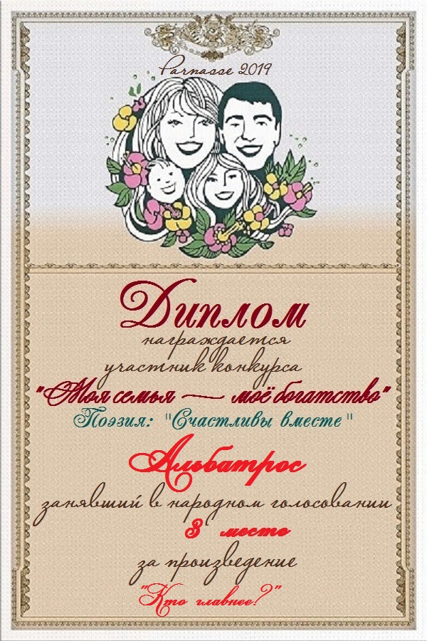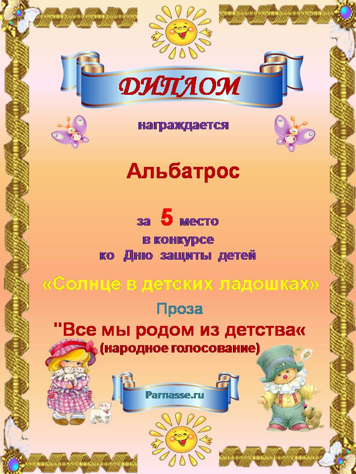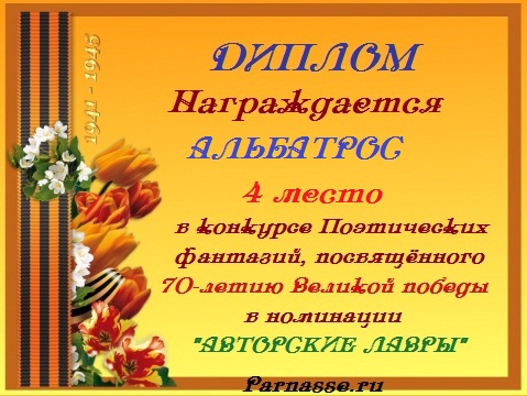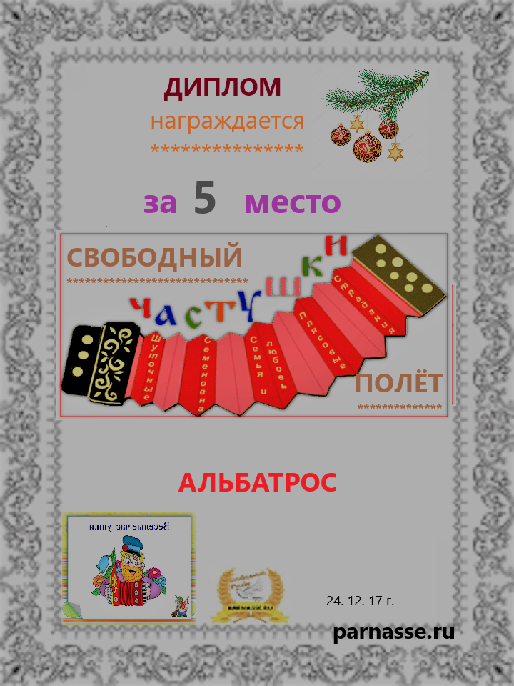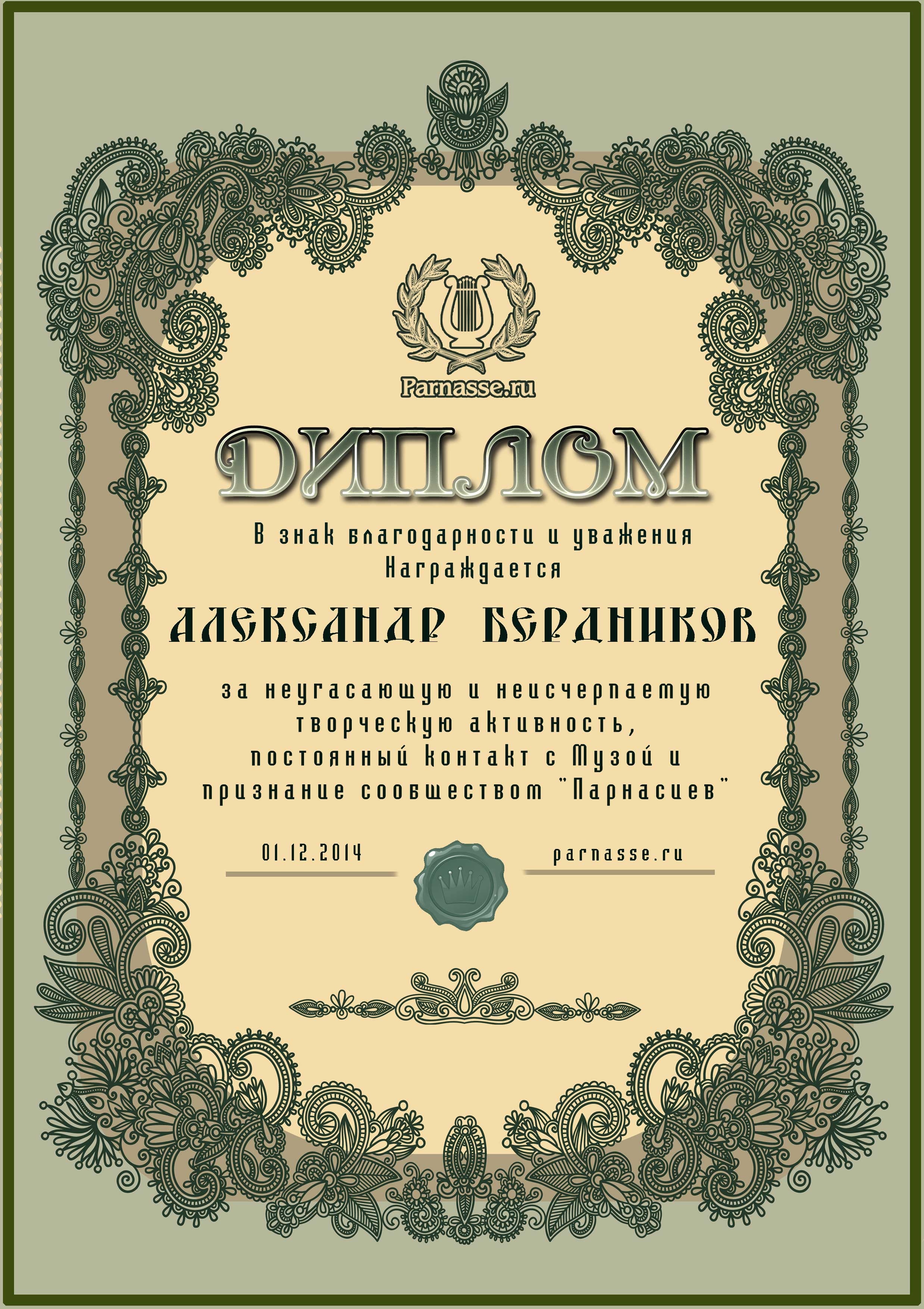 За неугасающую и неисчерпаемую творческую активность, постоянный контакт с Музой и признание сообществом "Парнасцев".От всей души желаем Вам, Александр, здоровья, любви, успехов, благополучия, удачи и творческого вдохновения!