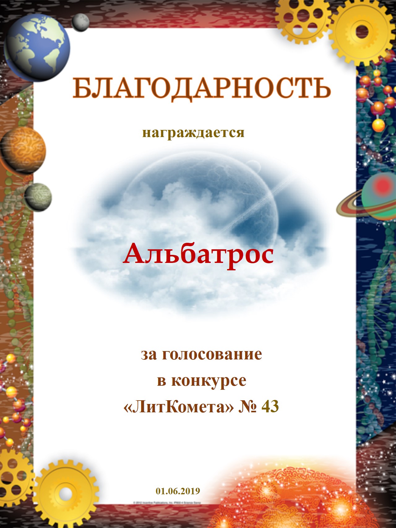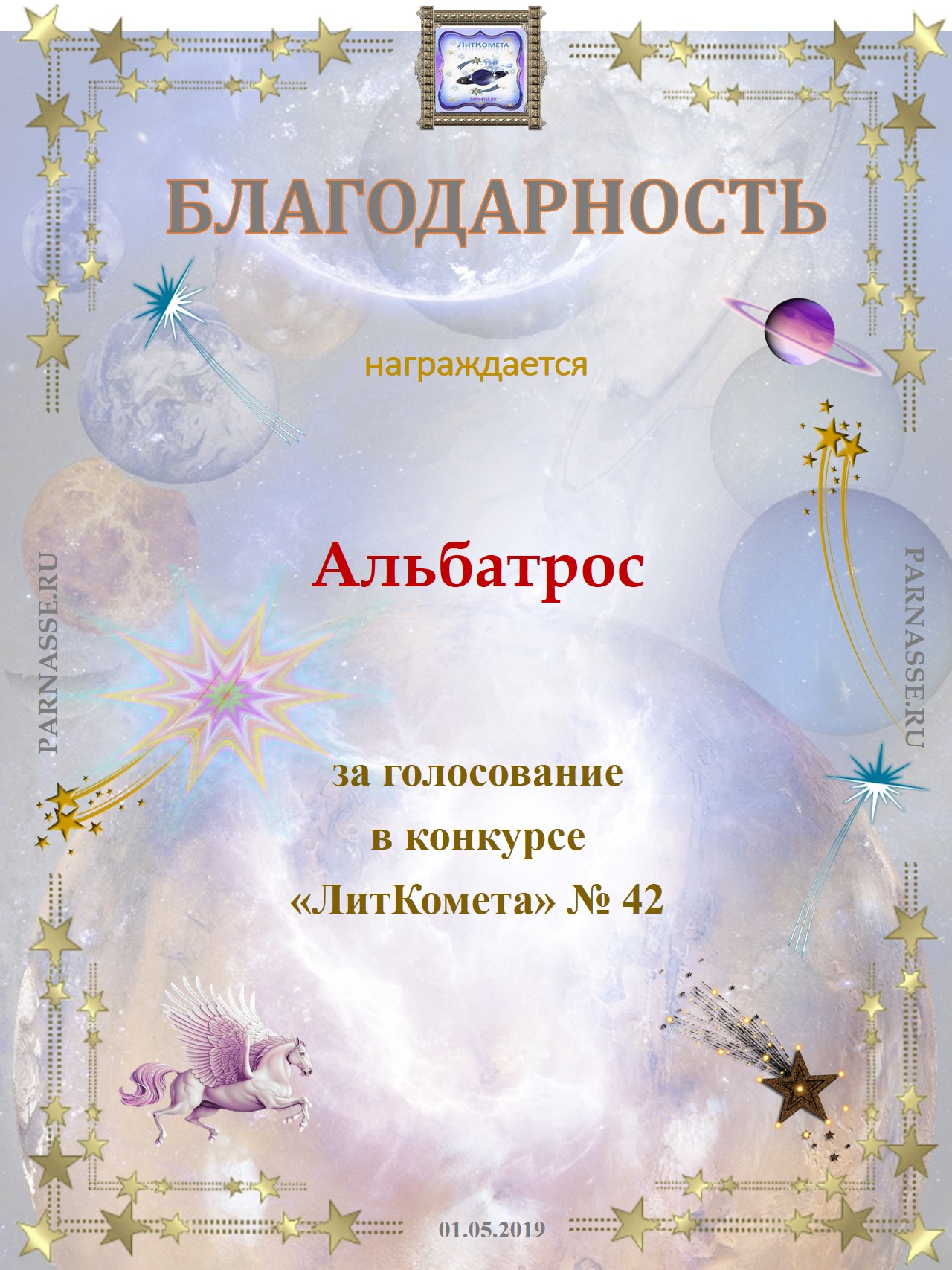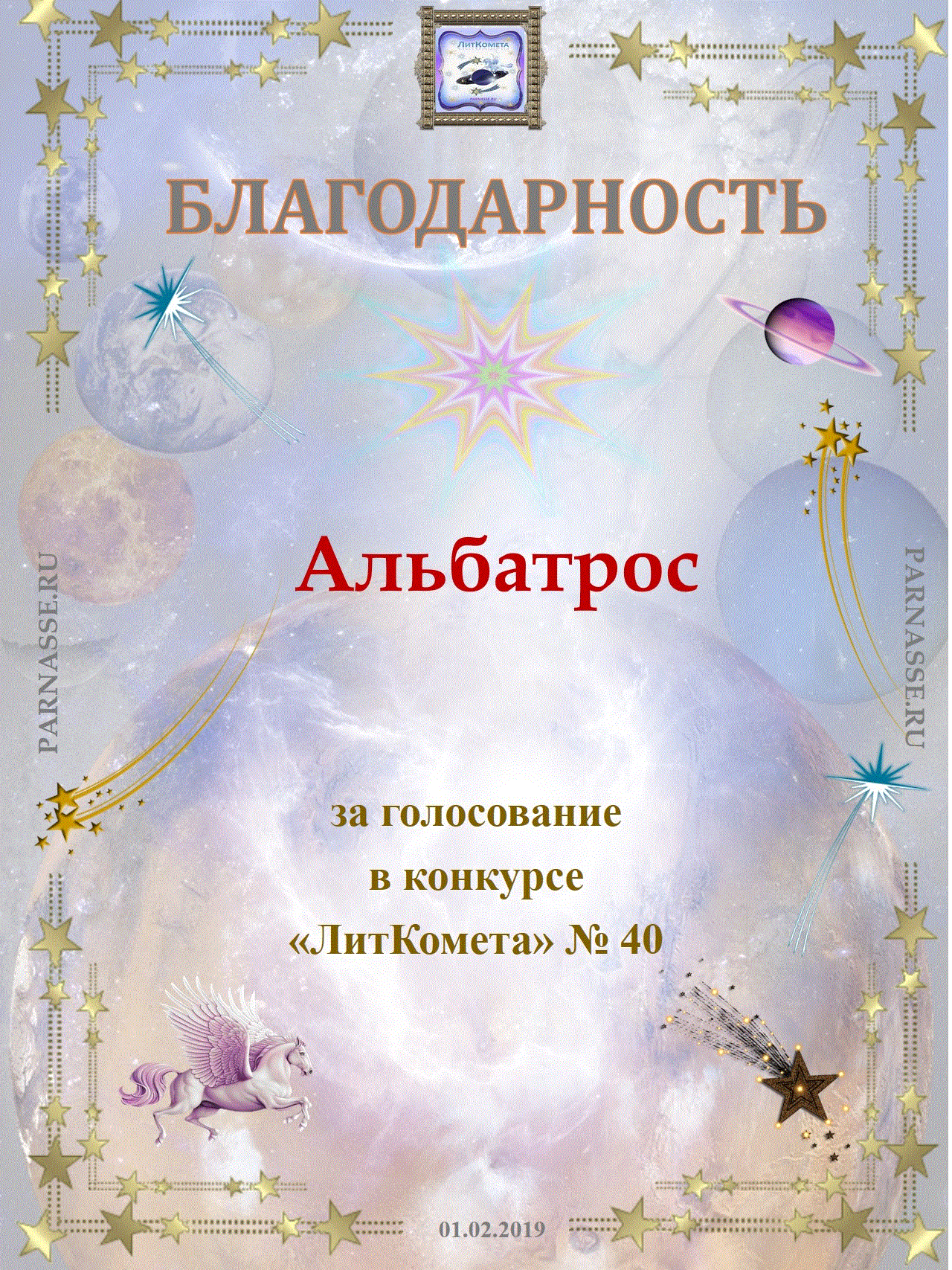 Поздравляю с занятым 1 местом в конкурсе "Литературная Комета - Полёт № 55" - Номинация Поэзия!