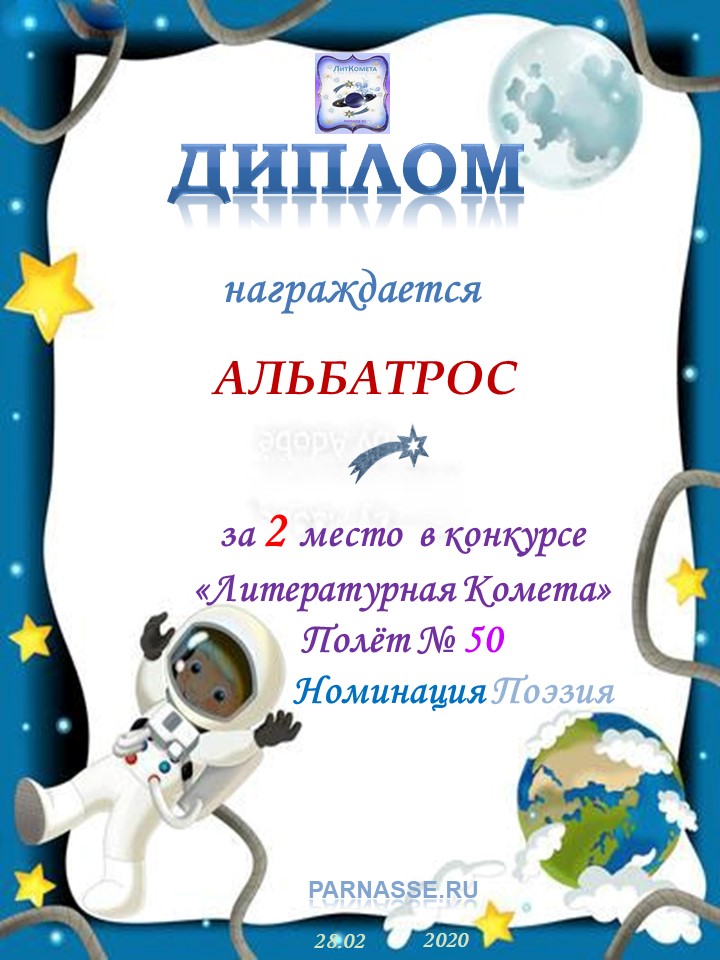 Поздравляю с занятым 2 местом в конкурсе "Литературная Комета - Полёт № 50" - Номинация Поэзия!