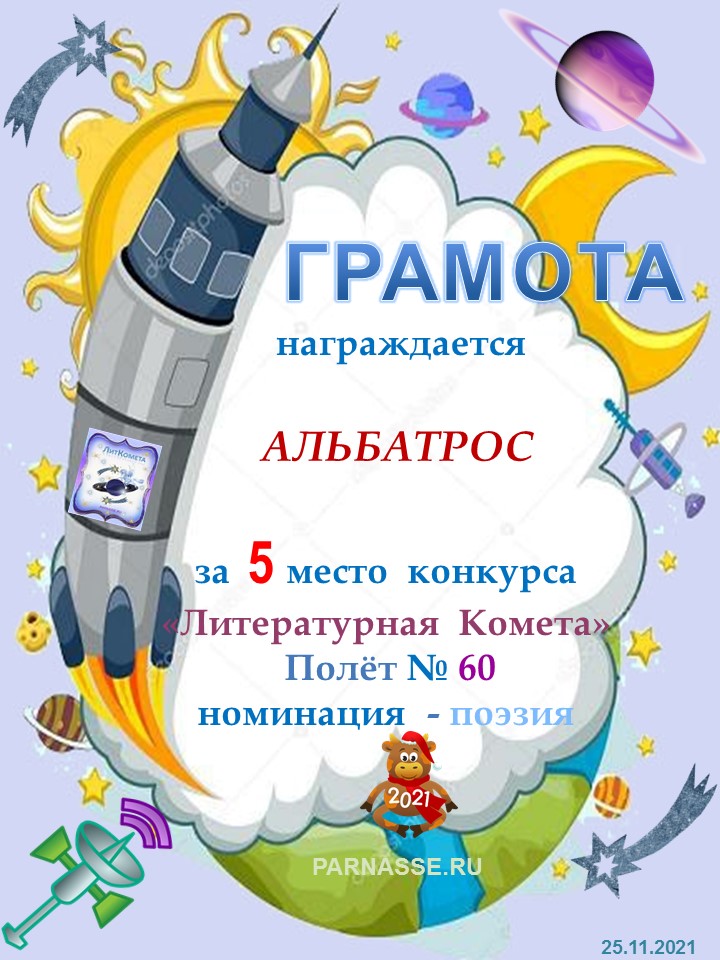 Поздравляю с занятым 5 местом в конкурсе "Литературная Комета - Полёт № 60" в Номинации Поэзия!